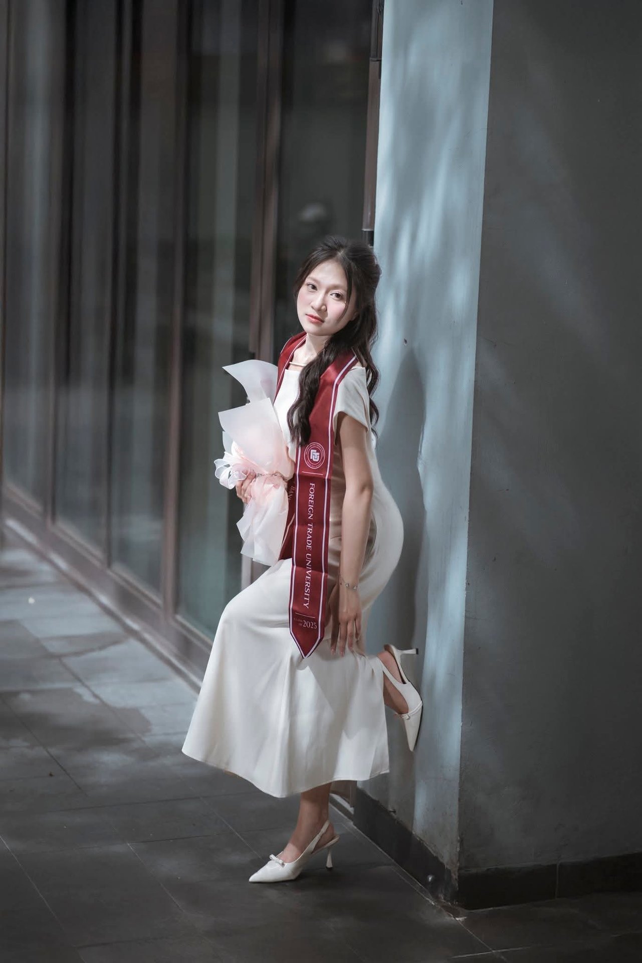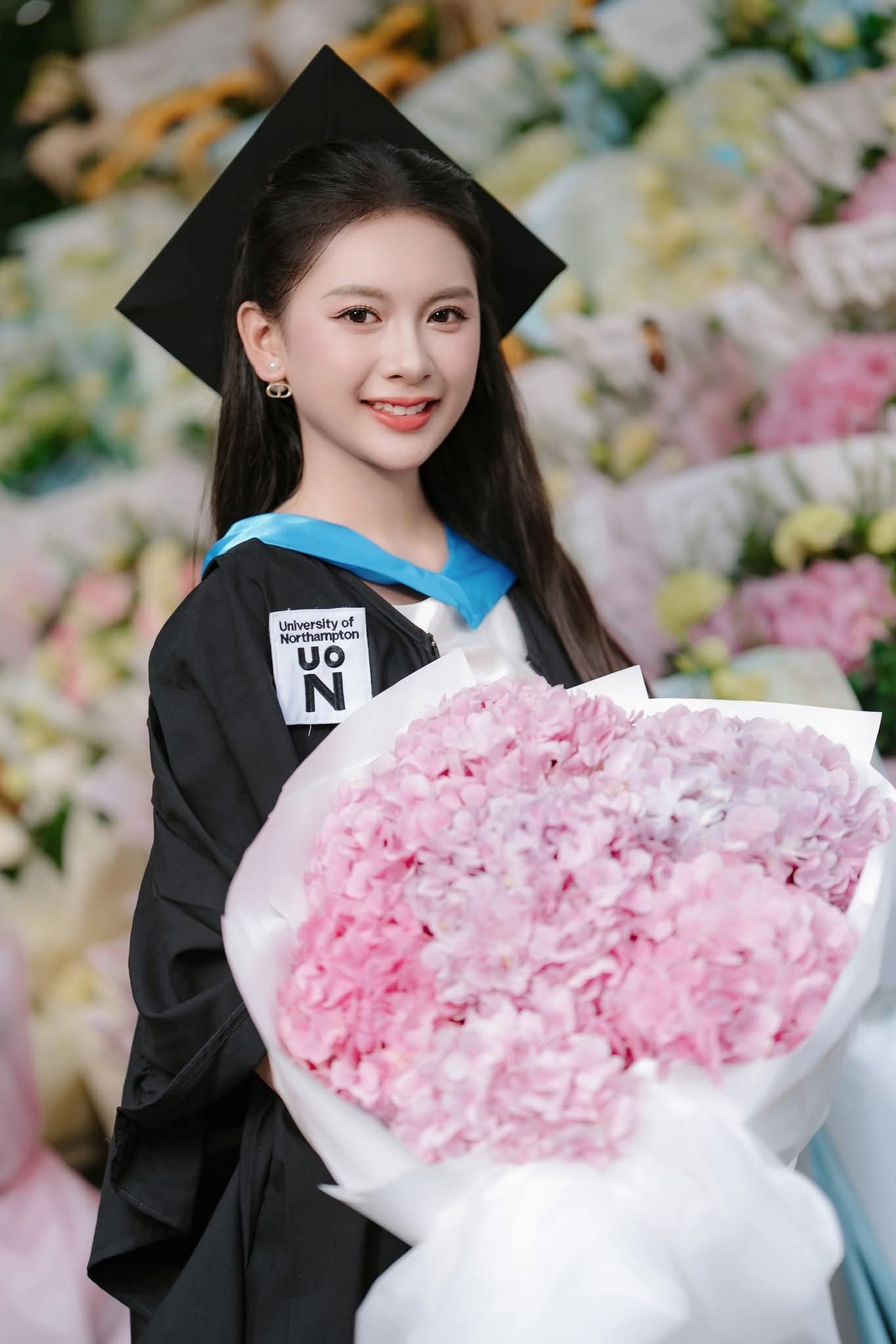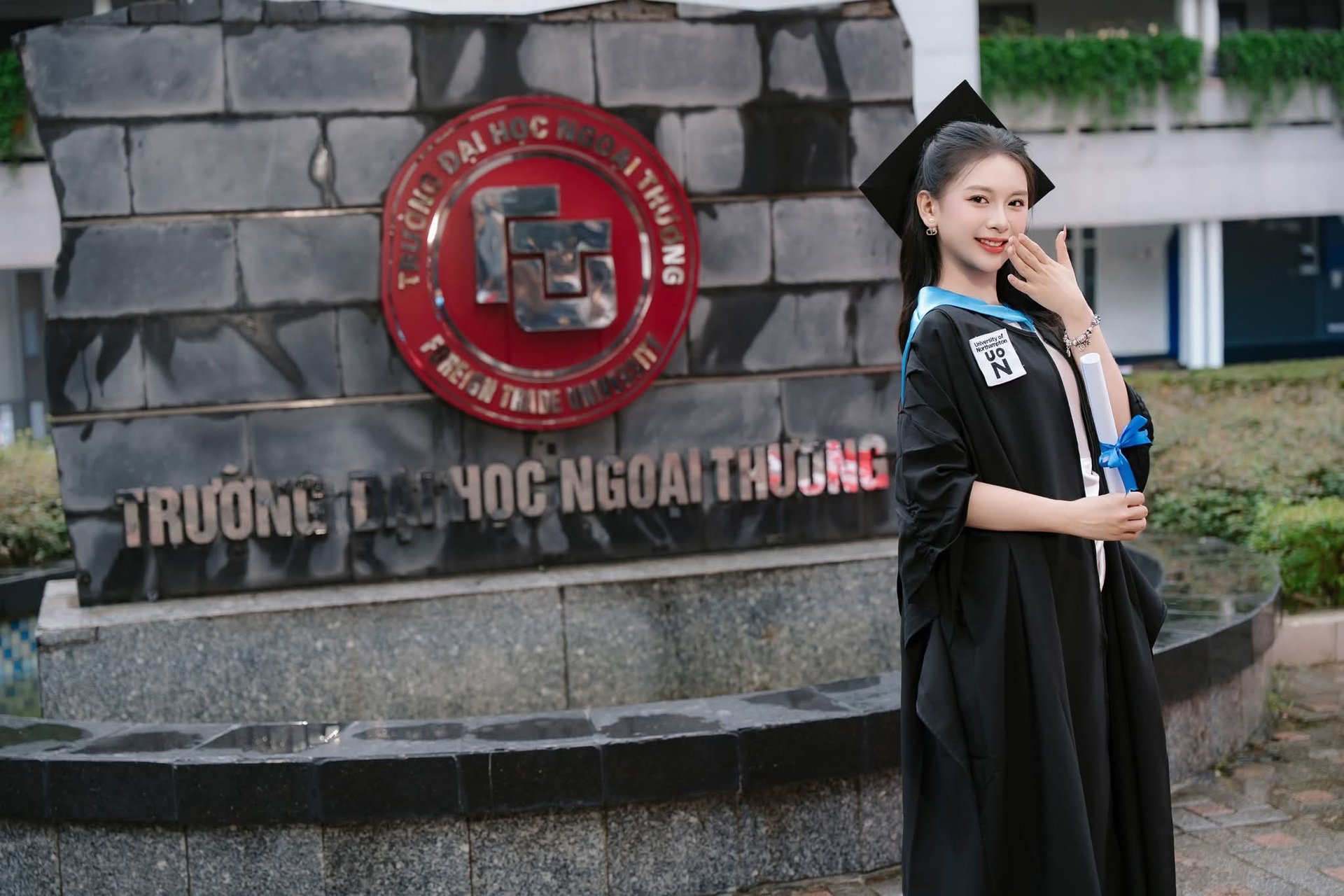 This photo captures a proud moment of a female student on her graduation day. Dressed in a dignified graduation gown and a cap symbolizing knowledge the young woman radiates beauty and immense joy. Her bright smile along with the vibrant pink rose bouquet beside her further highlights the happiness of completing her academic journey at Can Tho University. This is not only a significant milestone marking the end of one chapter but also the beginning of a wide-open future promising many new successes. This moment stands as a testament to the continuous effort and thirst for knowledge of the young generation.