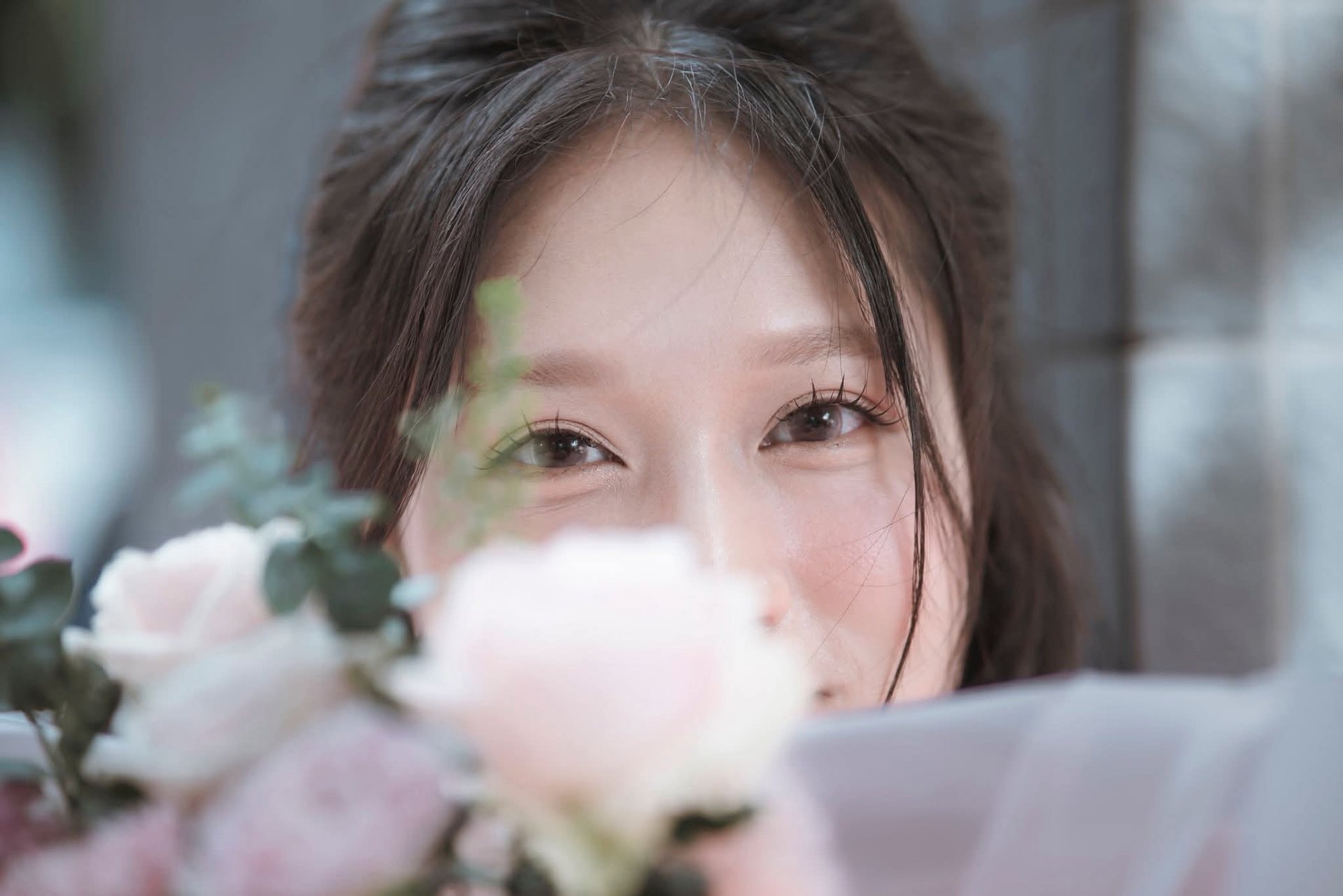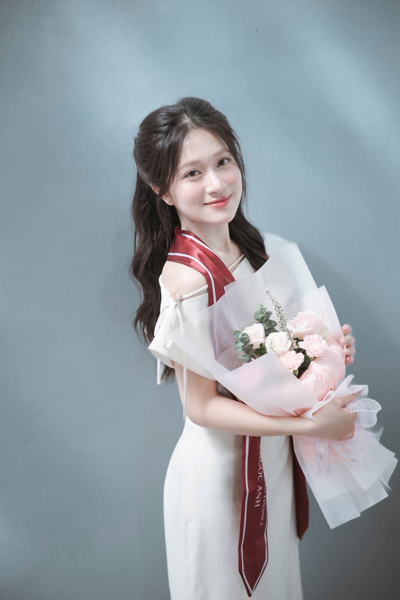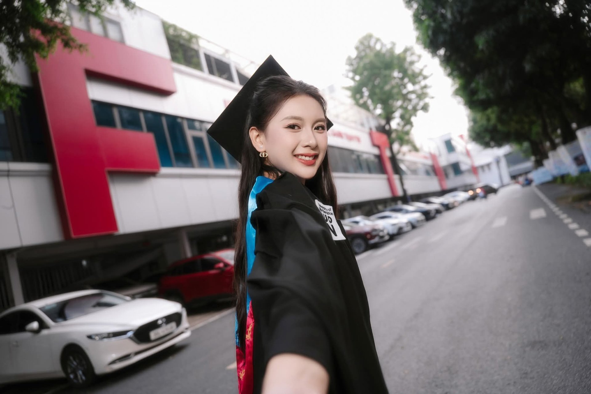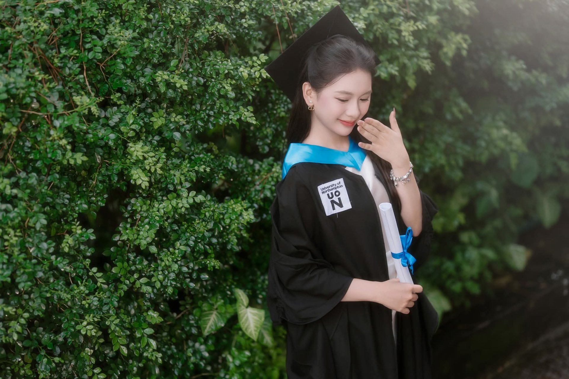 This photo captures a proud moment of a female student on her graduation day. Dressed in a dignified graduation gown and a cap symbolizing knowledge the young woman radiates beauty and immense joy. Her bright smile along with the vibrant pink rose bouquet beside her further highlights the happiness of completing her academic journey at Can Tho University. This is not only a significant milestone marking the end of one chapter but also the beginning of a wide-open future promising many new successes. This moment stands as a testament to the continuous effort and thirst for knowledge of the young generation.