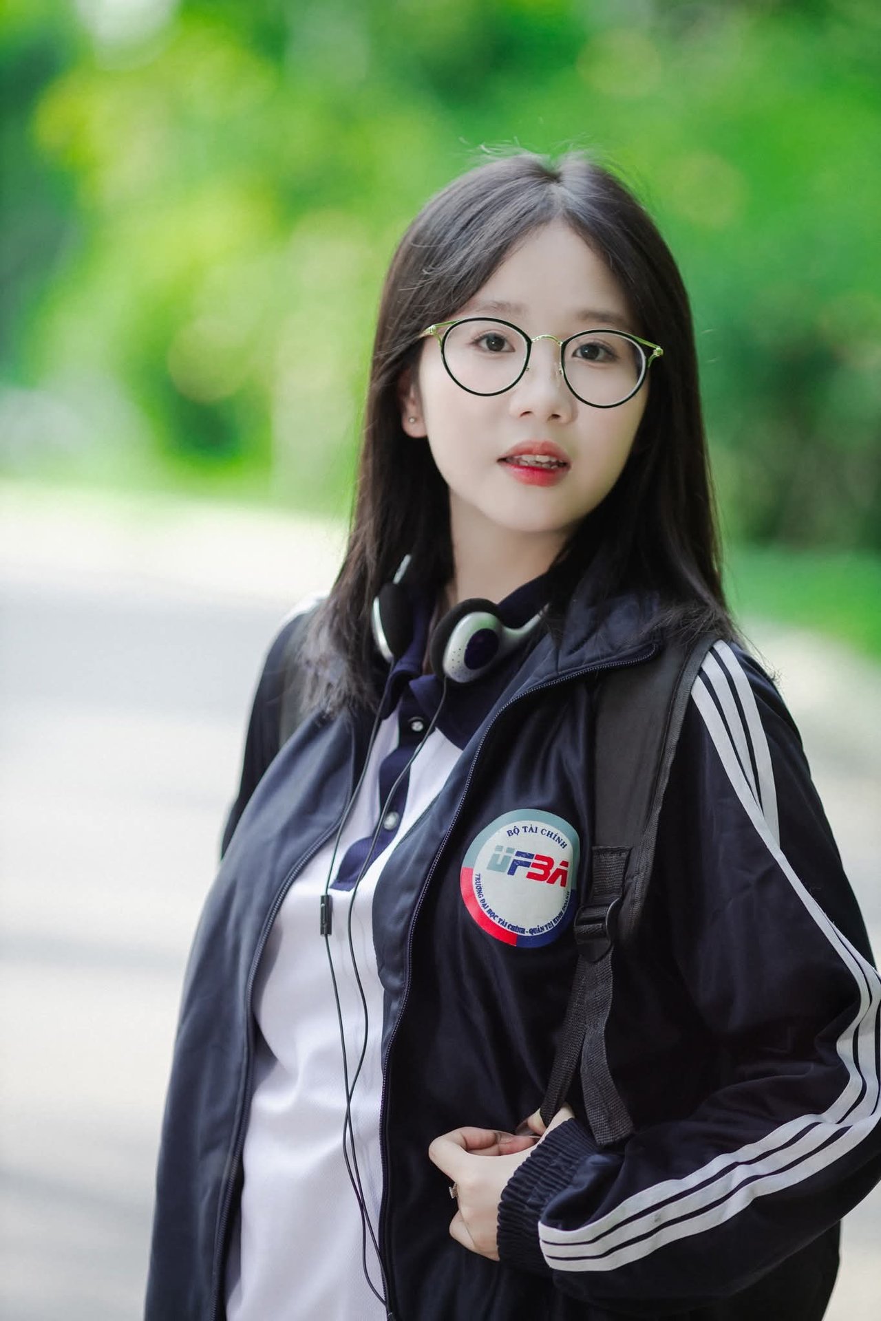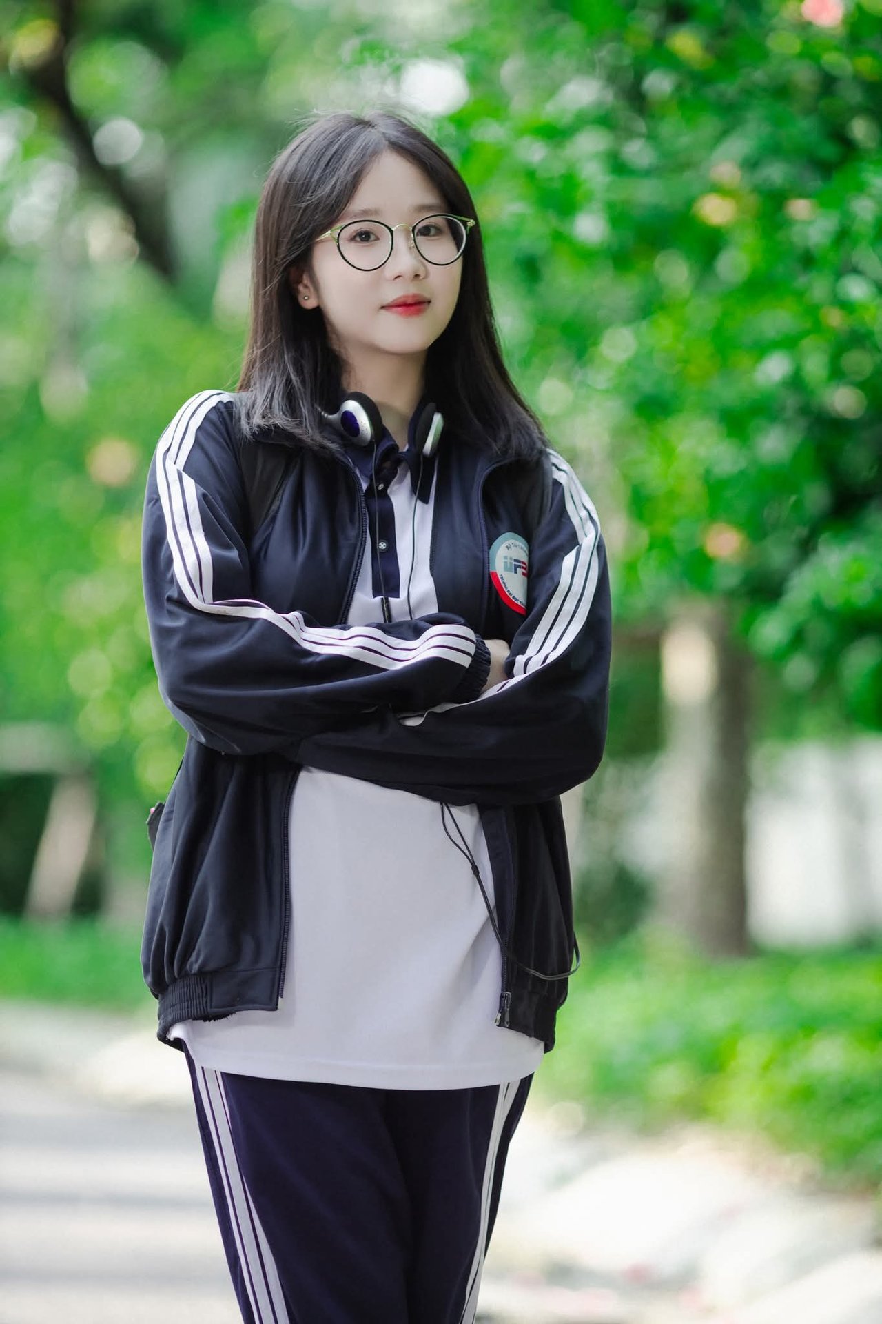 This image captures the innocent moment of a female student in a familiar school uniform: a white shirt, red vest, and blue skirt. With a radiant smile and pure eyes, the girl exudes youthful and vibrant beauty. The background features a serene tree-lined path, creating a peaceful and poetic setting that enhances the image of school age. This photograph symbolizes innocence, natural beauty, and cherished memories of student life. It is an ideal visual for projects related to education, youth, and the purity of adolescence, perfectly embodying the spirit of a bright student.