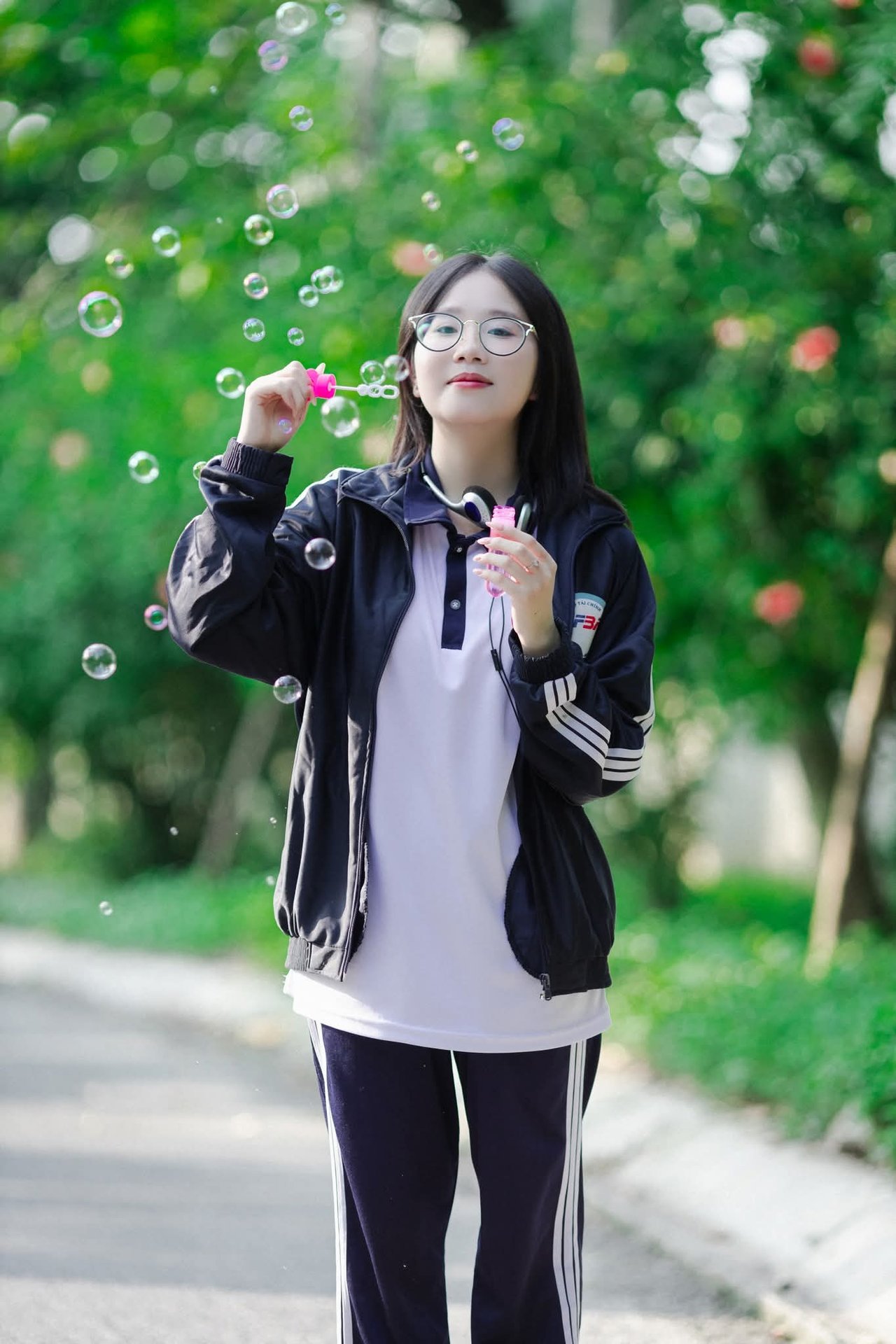 This image beautifully captures a pure and delightful moment of a young woman dressed in a simple yet charming school uniform The girl with her smooth dark hair and elegant glasses emanates a bright and genuine smile as she playfully blows sparkling soap bubbles letting them gracefully float and dance in the air In the background the lush green scenery of towering trees forms a serene and picturesque atmosphere enhancing the sense of tranquility and natural beauty This heartwarming picture vividly evokes the innocent charm and carefree spirit of student life portraying a truly vibrant and beautiful moment of youth The ethereal soap bubbles symbolize simple dreams and unadulterated joys soaring freely embodying the essence of youthful freedom and happiness