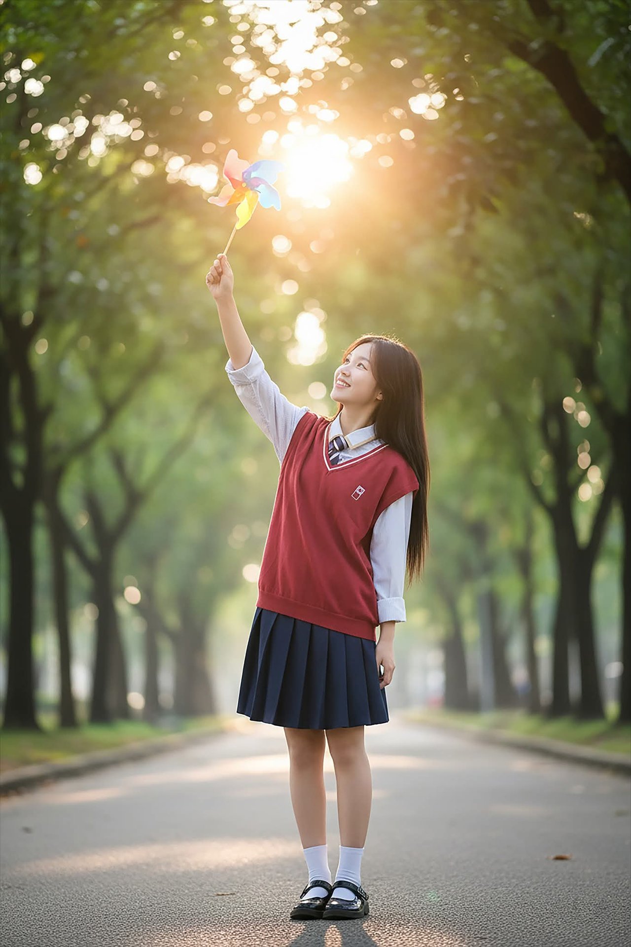 This beautiful portrait captures the innocent moment of a schoolgirl. The young girl wears a pristine white shirt paired with a black skirt, evoking the familiar image of a school uniform. She holds a colorful pinwheel, a symbol of childhood and innocence. Her pure beauty emanates from her gentle eyes and subtle smile. Her neatly braided hair, delicate face, and smooth fair skin highlight her natural charm. The outdoor setting with soft light and blurred green foliage in the background further enhances the graceful and fresh appearance of the young woman. This image perfectly represents the pristine beauty and carefree spirit of student life.Stories
