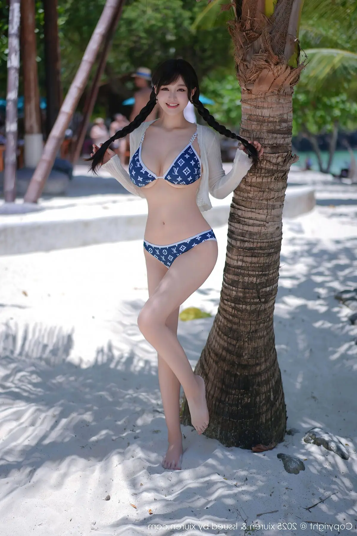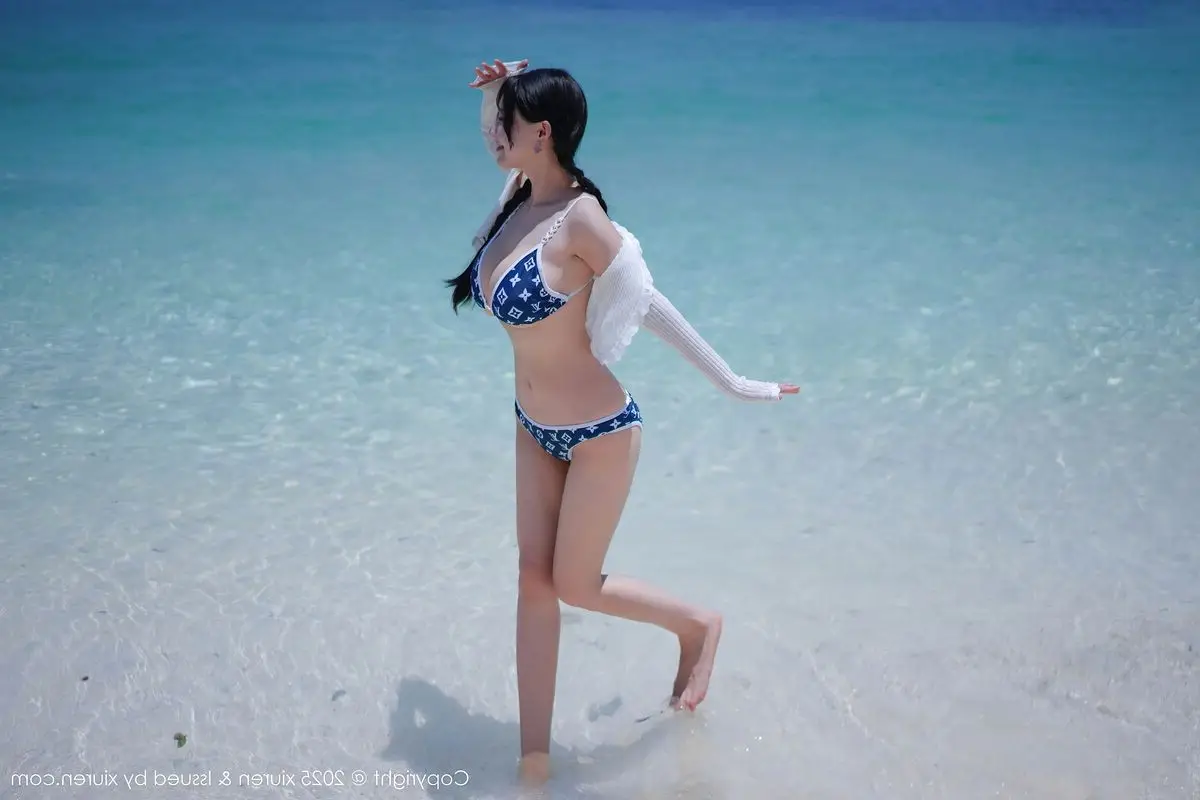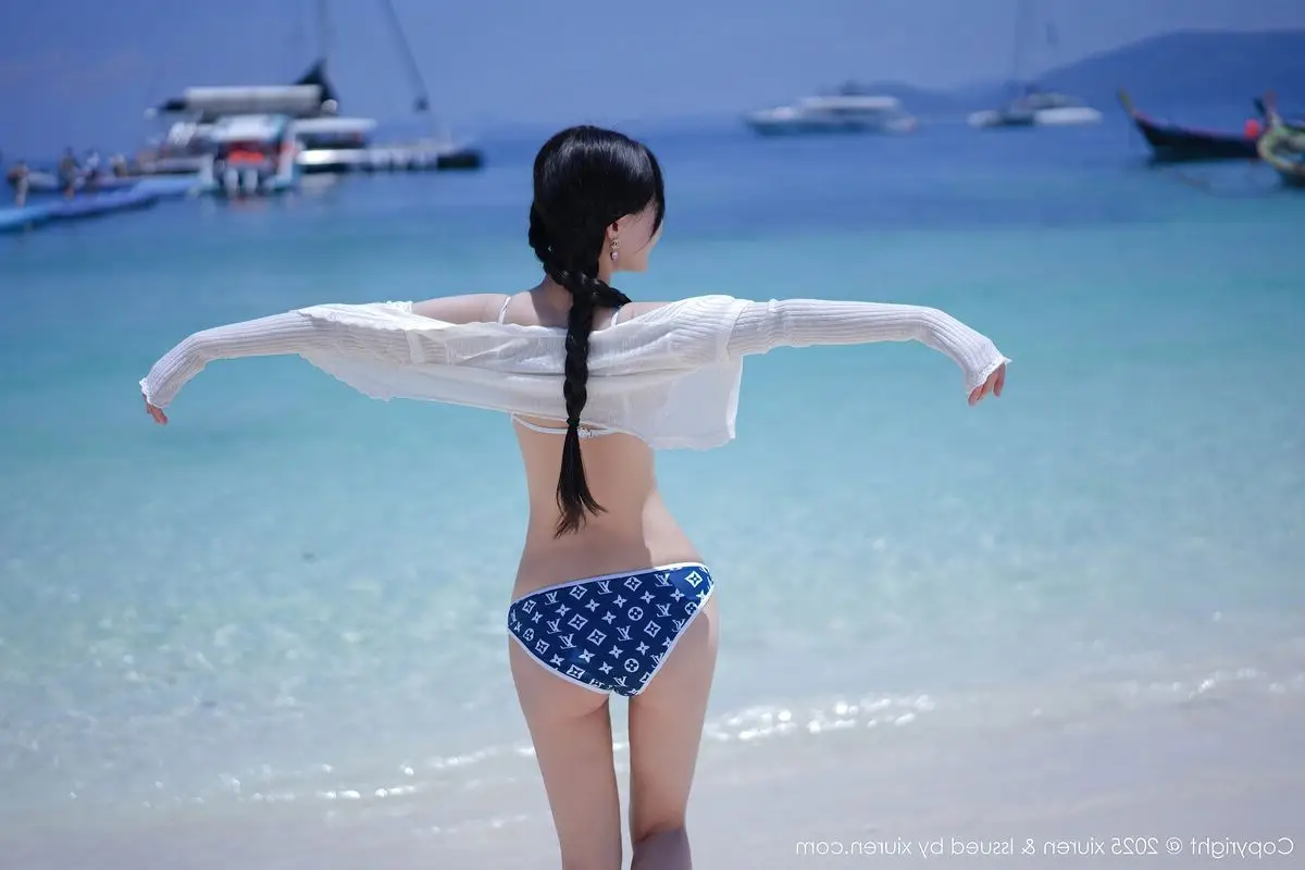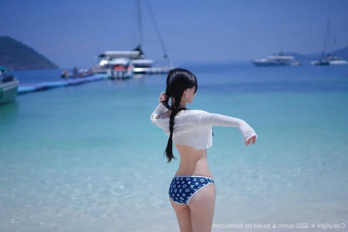 This stunning photograph transports us to a sun-drenched tropical beach, where model Xin Shang Ke Flora shines brightly in the XiuRen No.10699 collection. She embodies graceful and captivating beauty, posing confidently beside a palm tree. With elegantly braided hair and a striking blue and white patterned bikini paired with a light long-sleeved top, Flora exudes a fresh yet alluring charm. The golden sunlight illuminates her smooth skin, complementing the pristine white sands and crystal-clear turquoise waters, creating a vibrant summer scene. Each moment captured of Xin Shang Ke Flora evokes the serene relaxation of a holiday getaway, while showcasing her natural confidence and inherent grace, enchanting every gaze.
