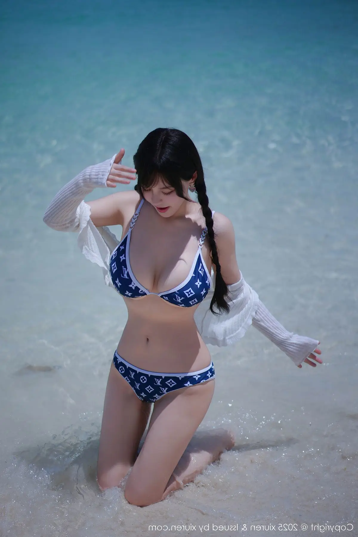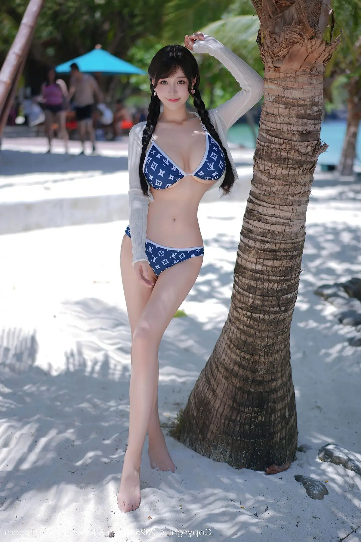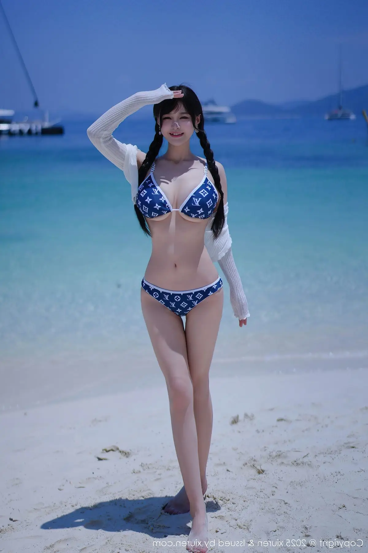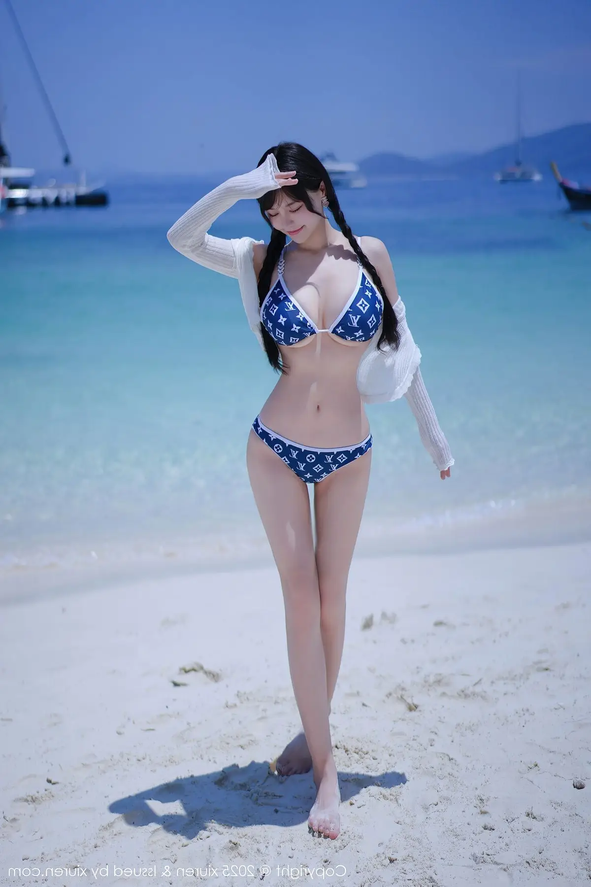 This stunning photograph transports us to a sun-drenched tropical beach, where model Xin Shang Ke Flora shines brightly in the XiuRen No.10699 collection. She embodies graceful and captivating beauty, posing confidently beside a palm tree. With elegantly braided hair and a striking blue and white patterned bikini paired with a light long-sleeved top, Flora exudes a fresh yet alluring charm. The golden sunlight illuminates her smooth skin, complementing the pristine white sands and crystal-clear turquoise waters, creating a vibrant summer scene. Each moment captured of Xin Shang Ke Flora evokes the serene relaxation of a holiday getaway, while showcasing her natural confidence and inherent grace, enchanting every gaze.