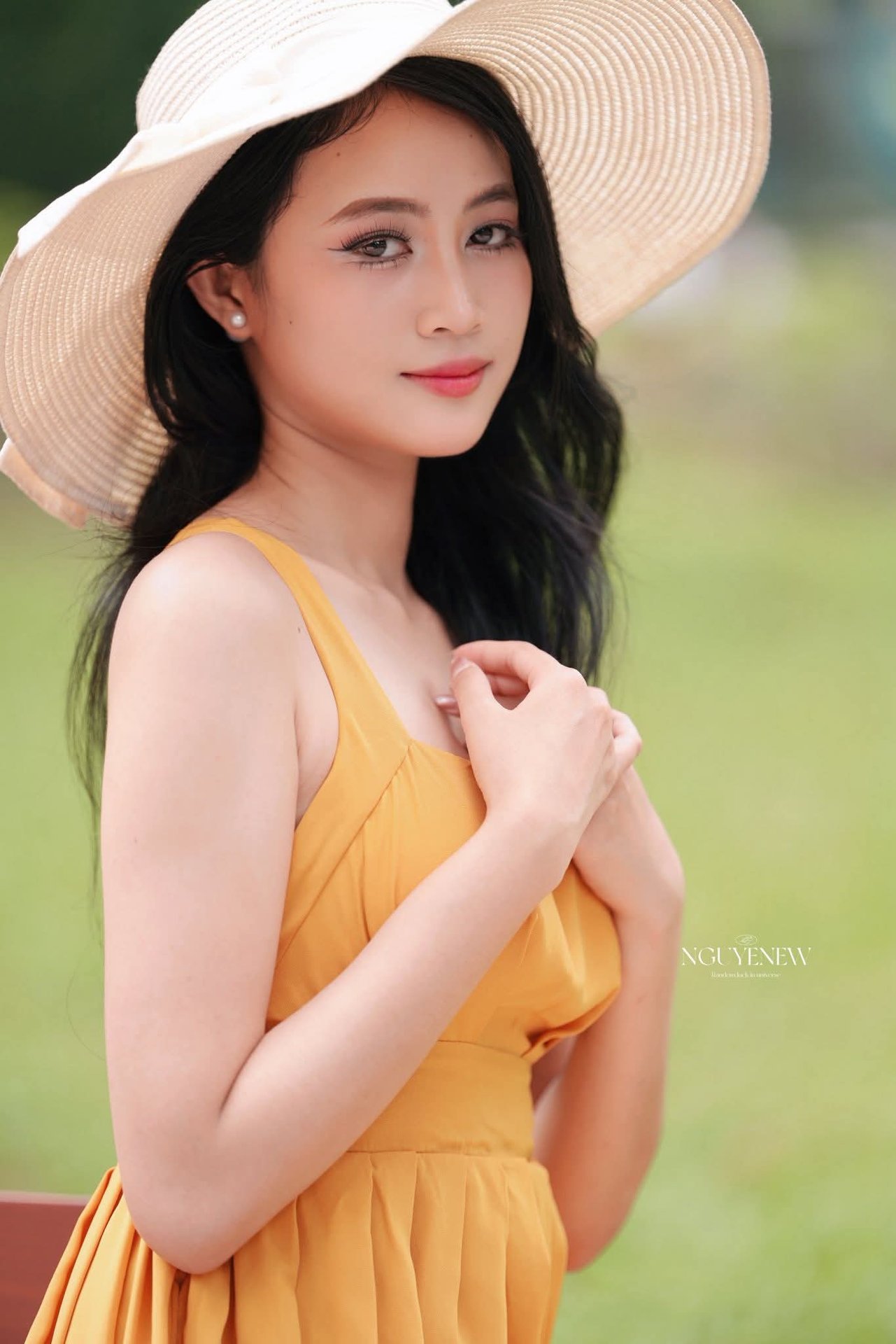 In image 1000019258.jpg, a youthful and beautiful girl appears gracefully adorned in a vibrant yellow dress and an elegant wide-brimmed hat. Her gentle gaze, subtly dreamy, creates a natural and captivating beauty. Her long, lustrous dark hair further enhances her East Asian charm. The delicate pose, touching the brim of her hat, not only conveys confidence but also evokes a sense of relaxation, blending harmoniously with the fresh green outdoor setting. This is an ideal image for summer fashion style, exuding freshness and sophistication. The photograph is more than just a beautiful moment; it is a source of inspiration for those who appreciate simple, refined, and vibrant beauty.Elegant Young Woman in White Dress Amidst Greenery | Natural Summer Beauty