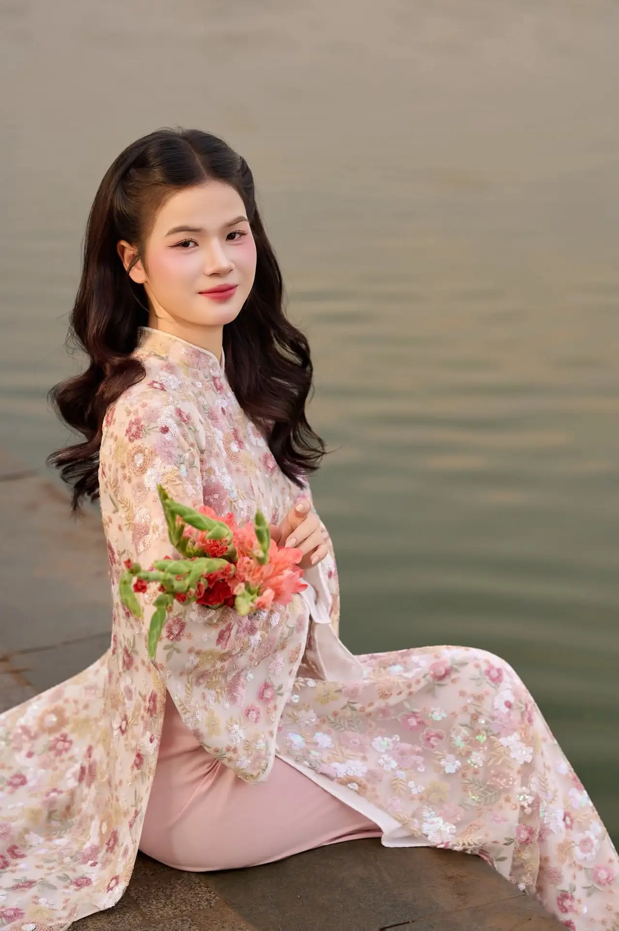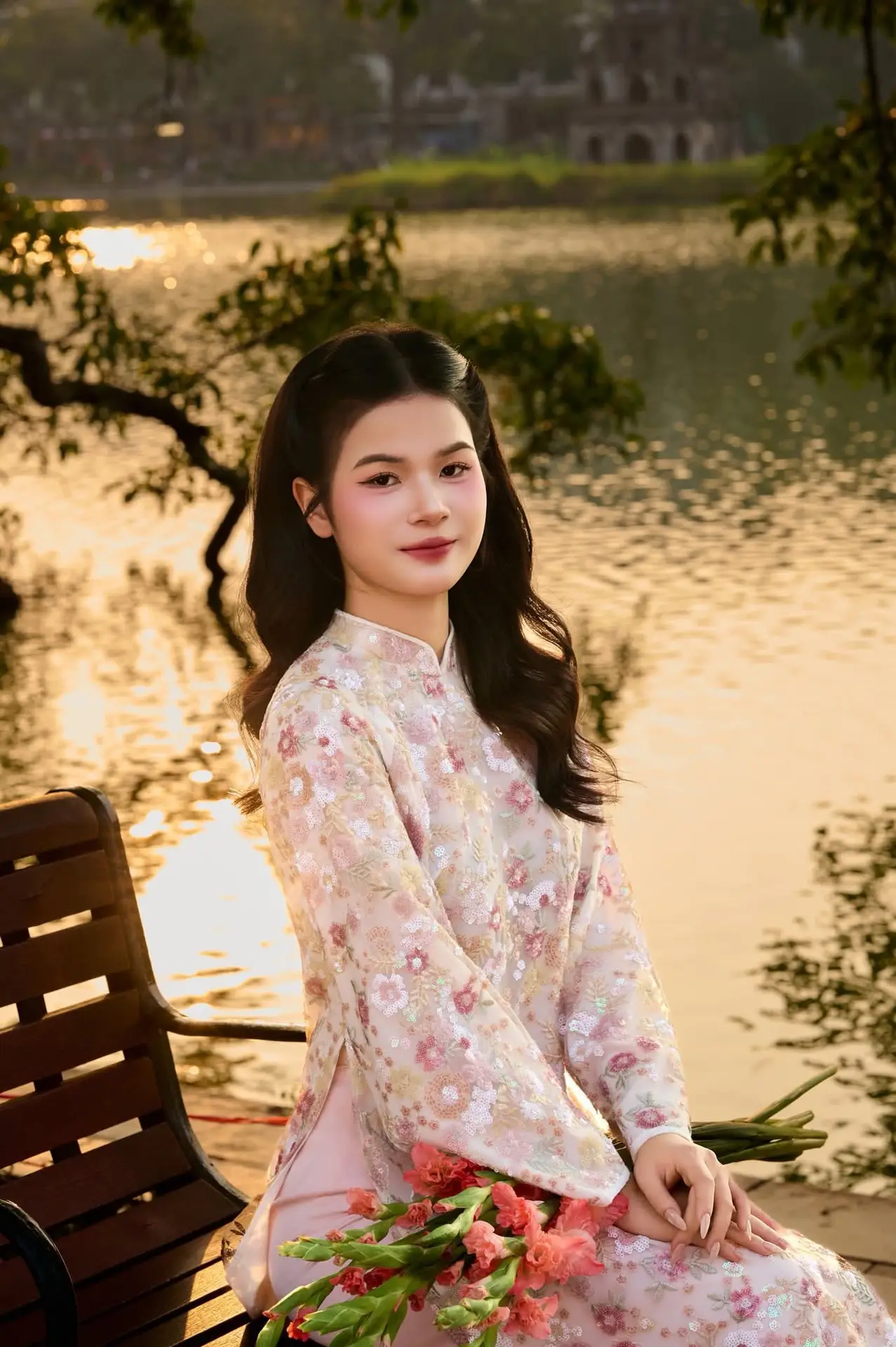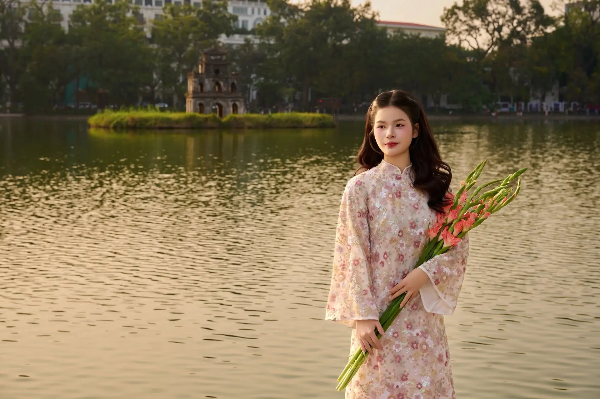 This photo beautifully captures a graceful Vietnamese girl in traditional Ao Dai, standing out against the romantic backdrop of a lake as dusk settles. The light pink Ao Dai with intricate patterns elegantly embraces her slender figure, enhancing her gentle and refined beauty. In her hands, she holds a vibrant bouquet of pink gladiolus flowers, adding a touch of freshness and vitality to the overall image. The golden sunlight from the setting sun reflects on the rippling lake surface, creating a romantic and peaceful atmosphere. This image not only expresses pride in traditional attire but also evokes a sense of harmonious beauty between humanity and nature, a captivating moment of serene tranquility.#Vietnamese #AoDai #TraditionalBeauty #AoDaiGirl #GladiolusFlowers #SunsetLake