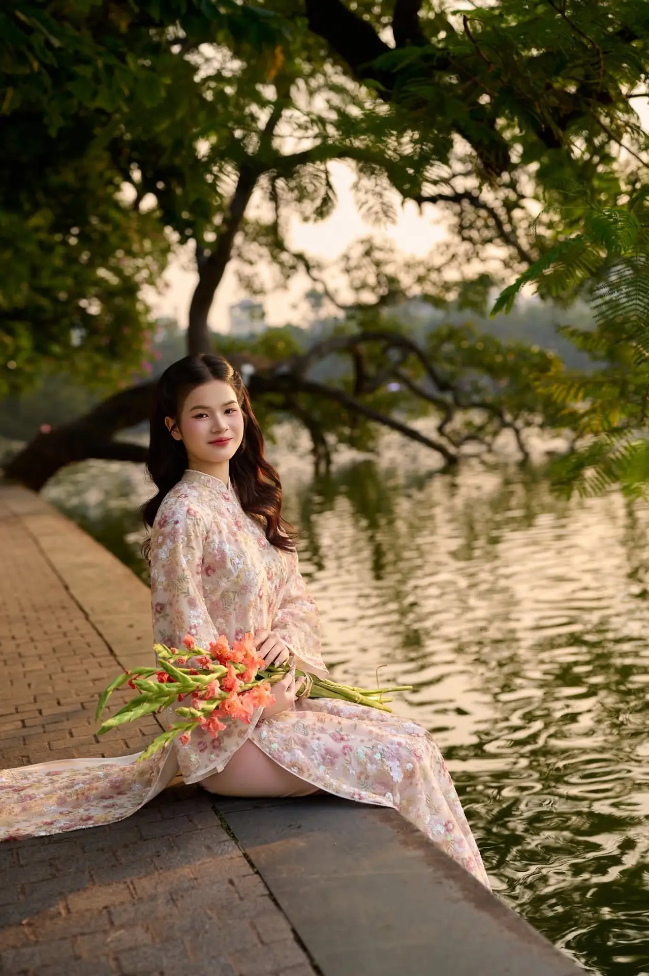 Vietnamese Ao Dai Beauty by the Lake at Sunset: Graceful Girl with Vibrant Gladiolus Flowers.