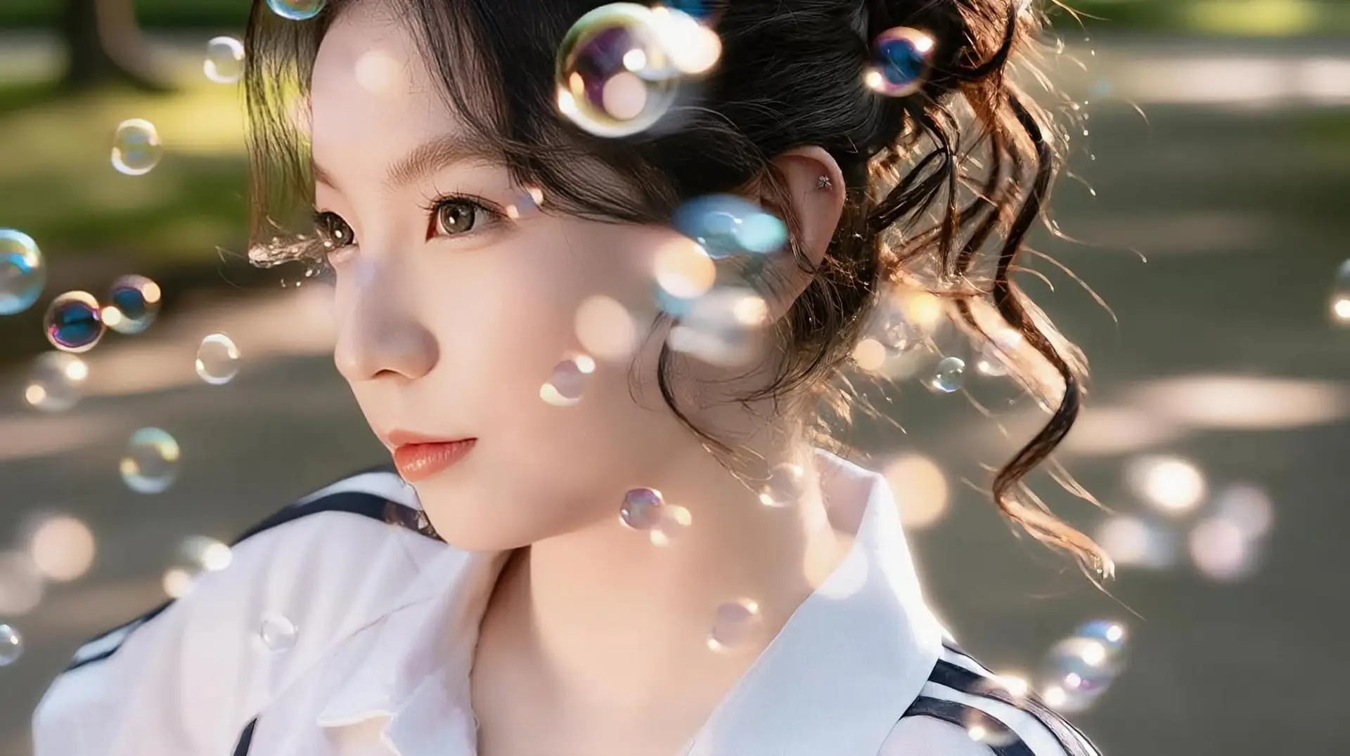 This captivating image portrays the ethereal beauty and gentle elegance of a young woman in a pristine white dress. She stands gracefully amidst a lush green garden where soft sunlight filters through the leaves creating a poetic and serene atmosphere. Her gaze is directed thoughtfully into the distance hinting at a moment of introspection and quiet contemplation adding an intriguing depth to her expression. The mirror beside her not only reflects her exquisite form but also serves as a symbolic portal to her inner world where timeless grace and purity intertwine. The entire composition exudes a sense of peace and refined artistry capturing a tranquil and unblemished moment in time.#WhiteDress #ElegantBeauty #GardenVibes #MirrorReflection #SerenePortrait