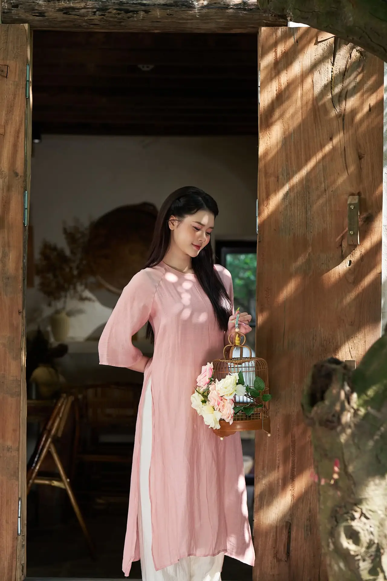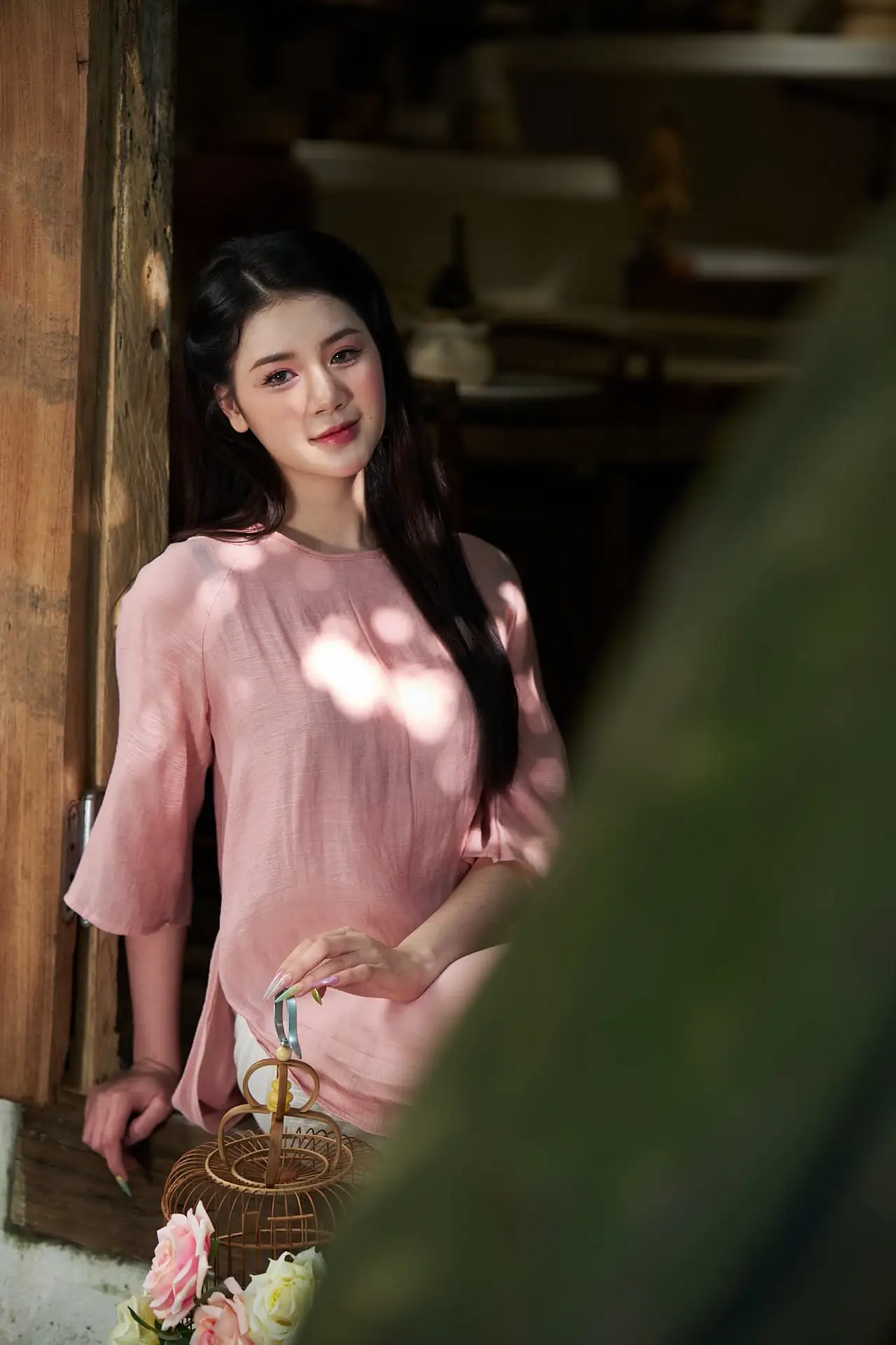 This stunning photograph beautifully captures the elegant Vietnamese beauty through the image of a young woman. With a gentle smile and a dreamy gaze, she leans by a rustic wooden window frame, fully embracing the natural light pouring in. Her soft pastel pink attire further enhances her graceful and delicate charm. The harmonious blend of the peaceful setting, vibrant flowers, and the pure beauty of the young lady creates a poetic and emotional moment. This is not just a portrait but also a story of serenity and subtle sophistication in the soul of a Vietnamese girl.#VietnameseBeauty #GracefulGirl #NaturalLight #Elegance #VietnameseStyle #AoDai