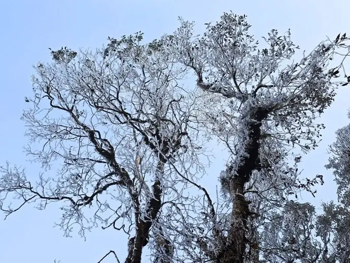 This striking image captures a lone figure immersed in the breathtaking beauty of Vietnam's frost-kissed mountains. A rare and enchanting natural phenomenon, the landscape transforms into a magical winter wonderland as ice and snow delicately adorn every branch and leaf. The person, a small silhouette against the vast, serene backdrop, embodies the unique experience of 'ice hunting' – seeking out these ephemeral, mystical scenes. Vietnam's winter landscapes offer not just a visual spectacle but an inspiring journey for adventurers and photographers alike, revealing a captivating, ethereal charm in its high-altitude regions each cold season.#VietnamWinter #FrostyMountains #IceHuntingVietnam #MysticalLandscape #WinterTravelVietnam