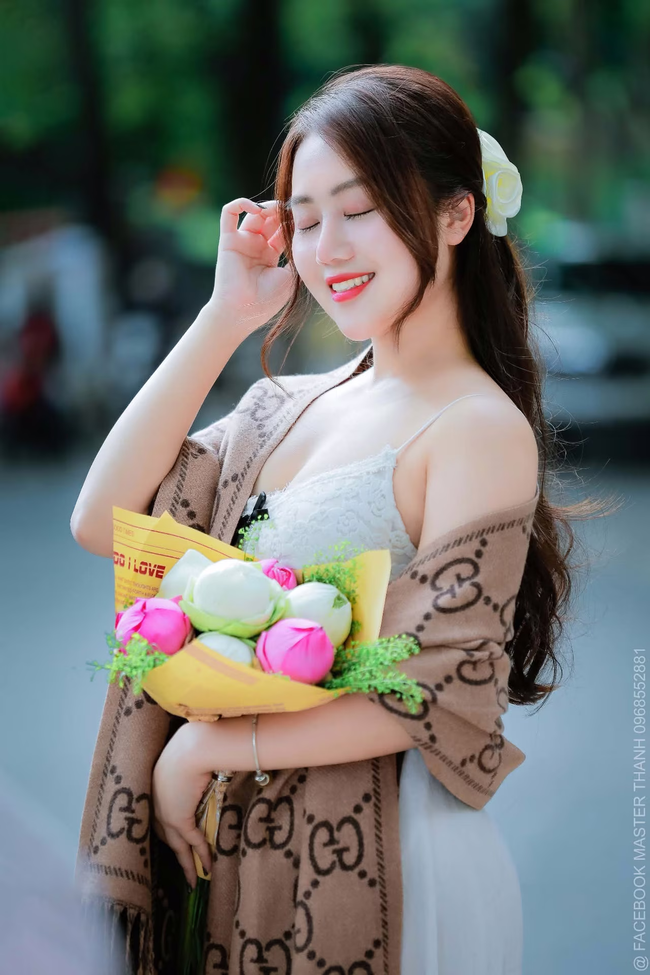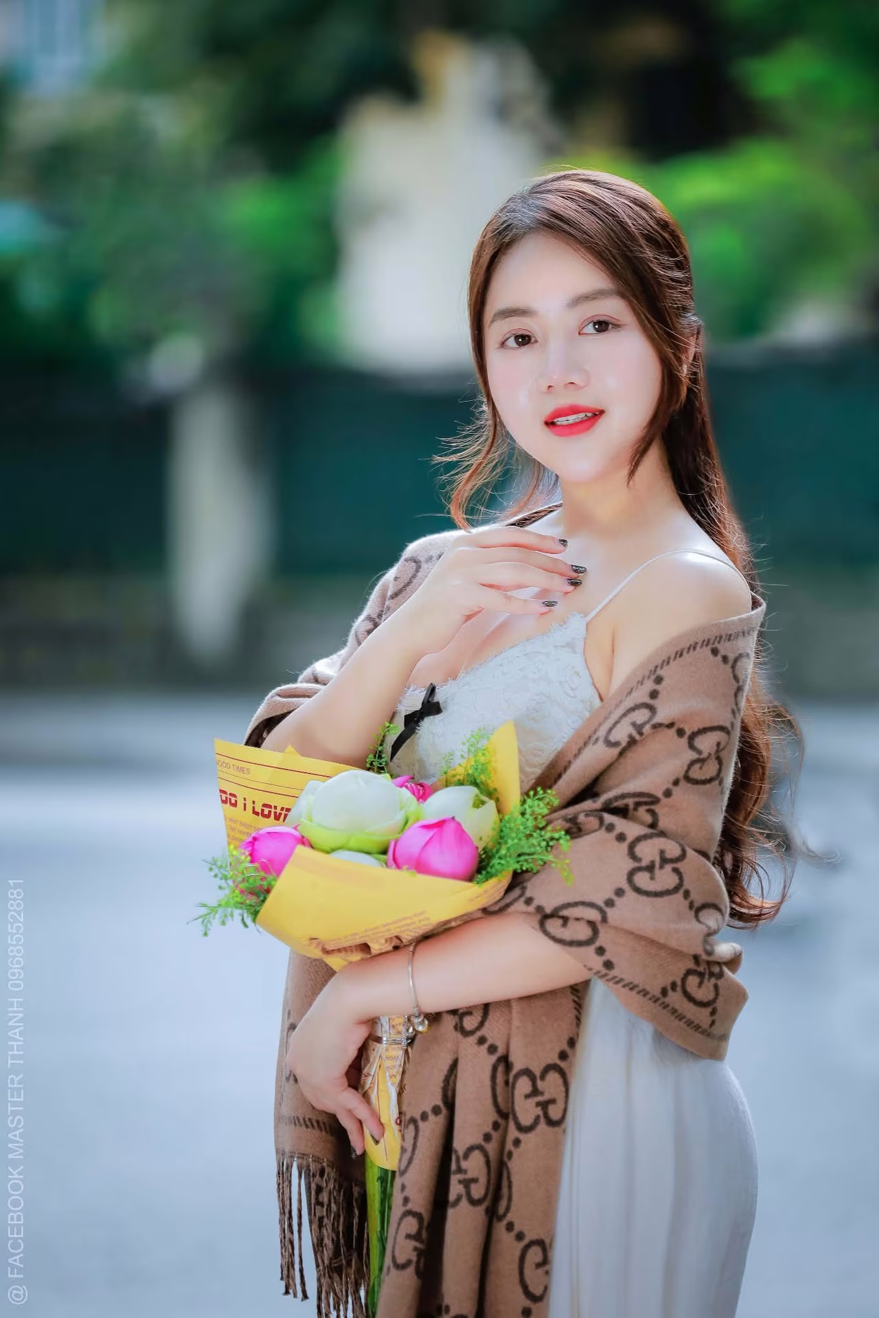 This VGU No.88 photograph captures a mesmerizing moment of a young woman radiating elegant beauty and a gentle smile. She exudes a captivating charm in her refined attire complemented by a stylish modern patterned shawl. The focal point is the fresh lotus bouquet she cherishes symbolizing purity and innocence which further accentuates her natural and graceful allure. Her dreamy gaze and flowing hair create an enchanting portrait evoking feelings of femininity and serenity amidst the urban setting. This image is more than just a picture it is a narrative of beauty and timeless style. #Vietnamese #pretty #charmVGU No.42: Discover the Elegant Beauty of a Vietnamese Girl by a Vibrant Flower Lake