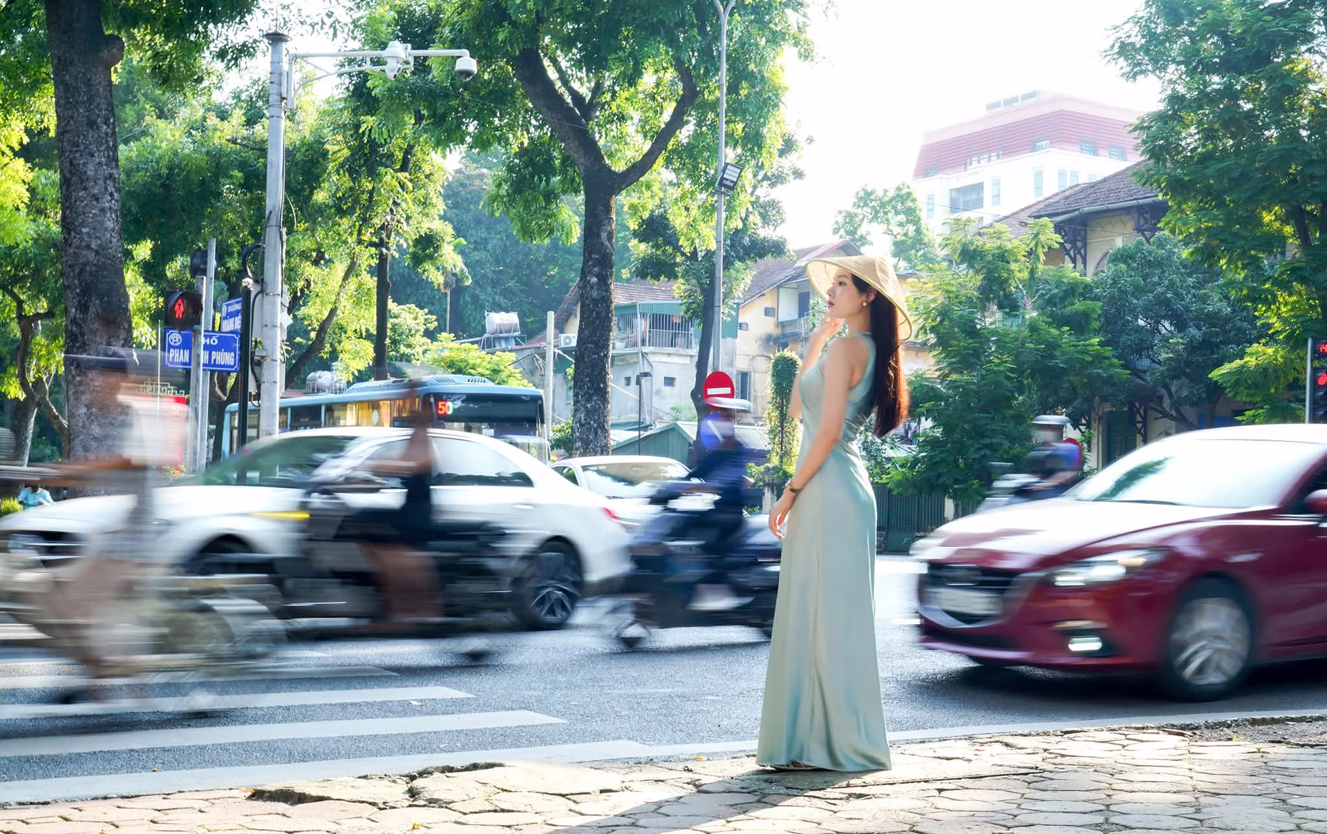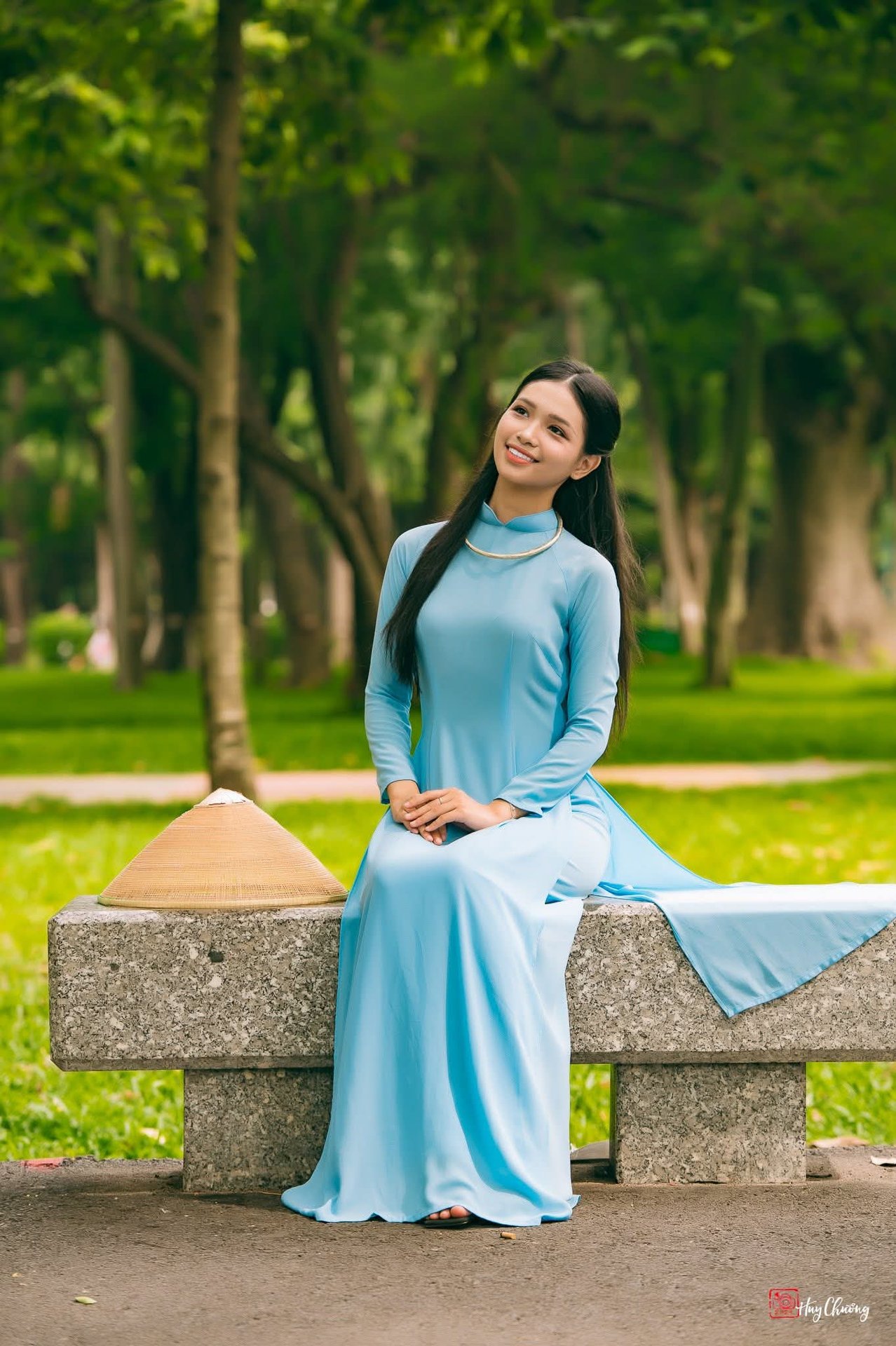 This stunning photograph captures a young and graceful Vietnamese woman elegantly dressed in a modern light blue ao dai. The traditional conical hat on her head not only enhances her gentle beauty but also serves as a profound cultural symbol of the country. With a confident and refined demeanor the girl stands amidst a tree-lined street creating a harmonious scene between humanity and nature. The familiar urban landscape suddenly becomes more poetic thanks to her captivating presence. This is not just a fashion moment but also a tribute to the intertwined modern and traditional beauty of Vietnam. The image evokes a sense of peace and pride in the unique charm of Vietnamese women.