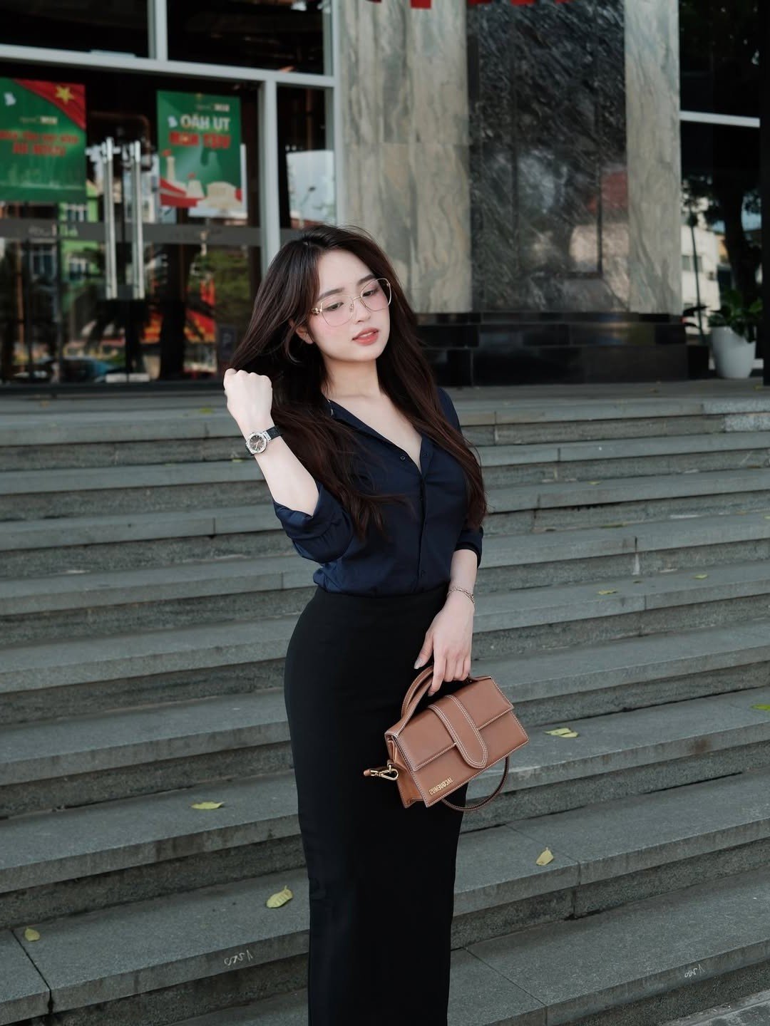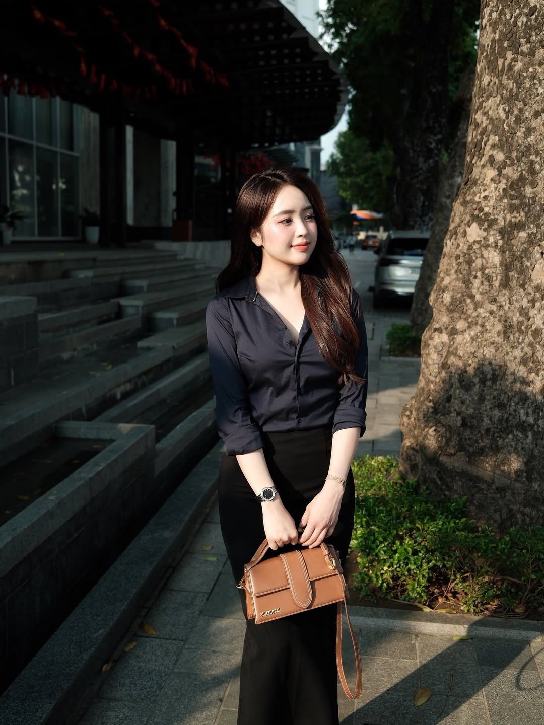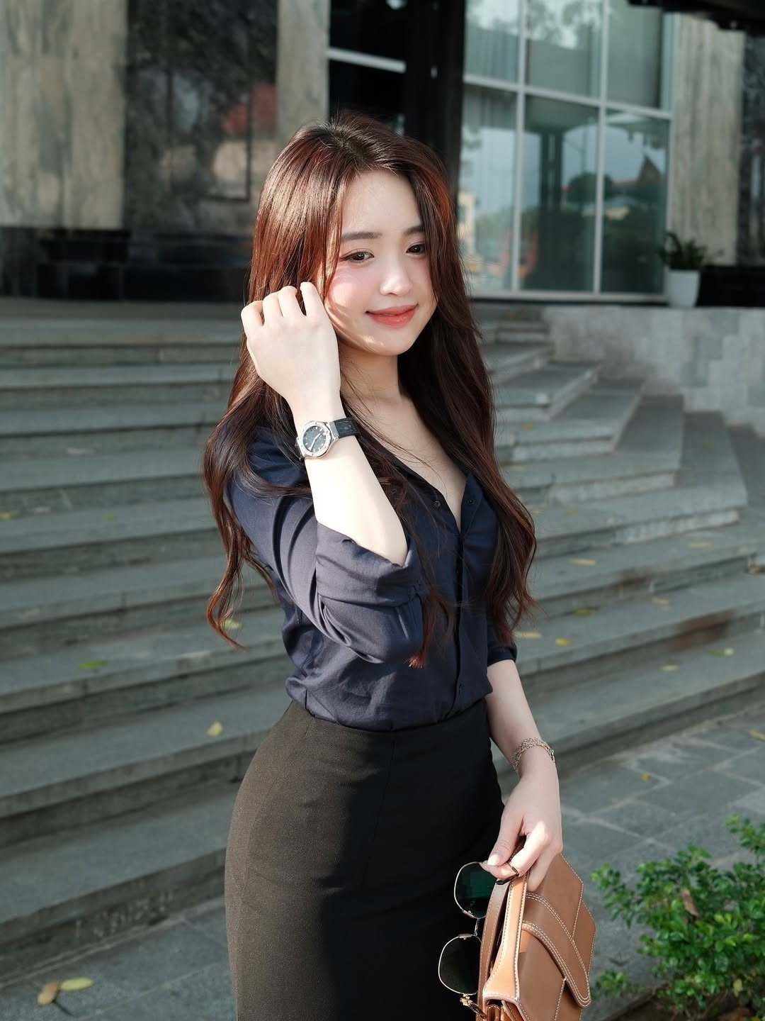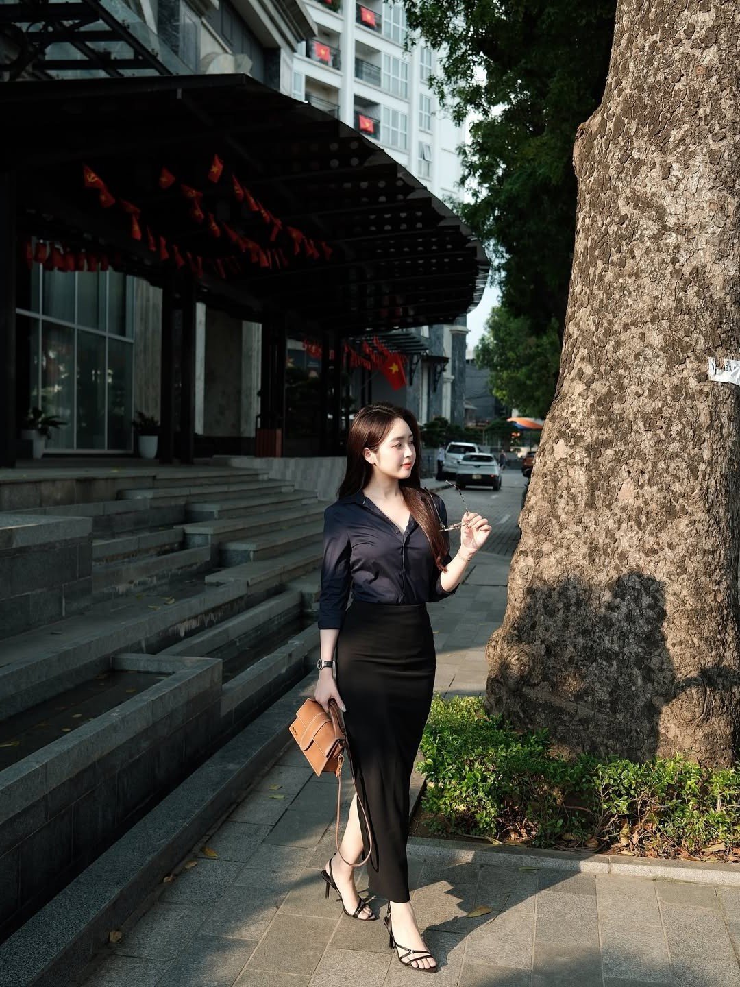 This exquisite photograph beautifully captures an office lady radiating confidence and grace effortlessly drawing every eye. Her impeccable office fashion choice features an elegant dark shirt paired with a long subtly slit black pencil skirt skillfully accentuating her slender silhouette and modern aesthetic. Thoughtful details such as her chic brown handbag and stylish high heels perfectly complete her professional ensemble exuding an air of refined sophistication. As she takes a gentle stroll along the urban street the woman embodies not only self-assured independence but also a captivating positive energy. This image serves as a wonderful source of inspiration for women aspiring to cultivate an office fashion style that is both elegantly polished and a powerful expression of their unique personality.Stories