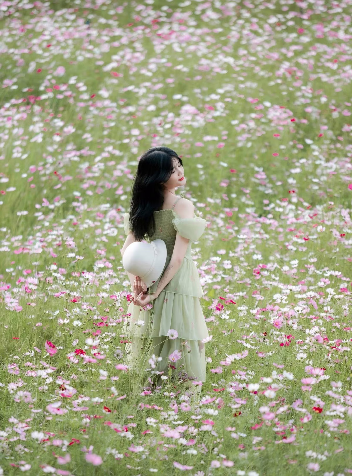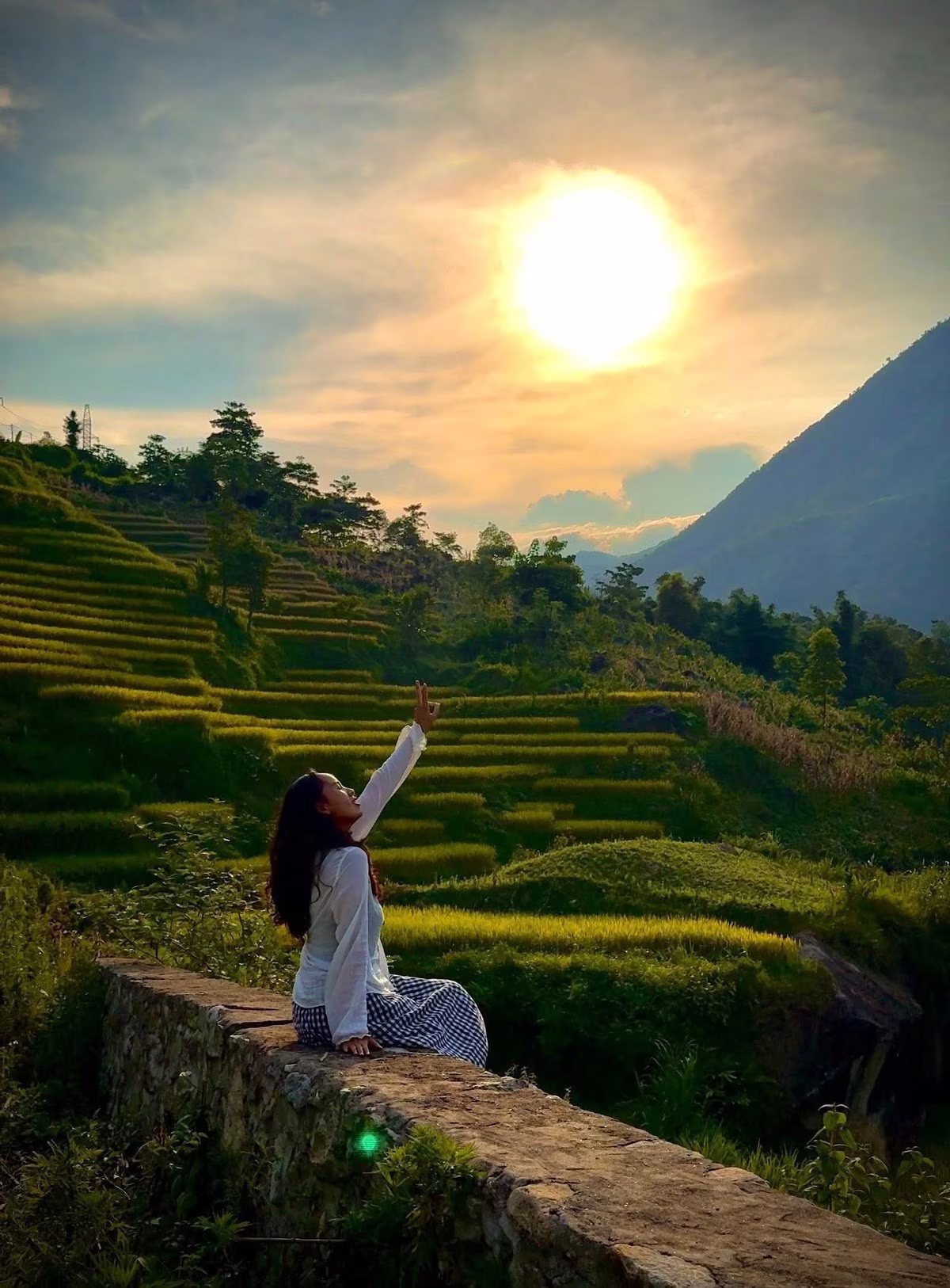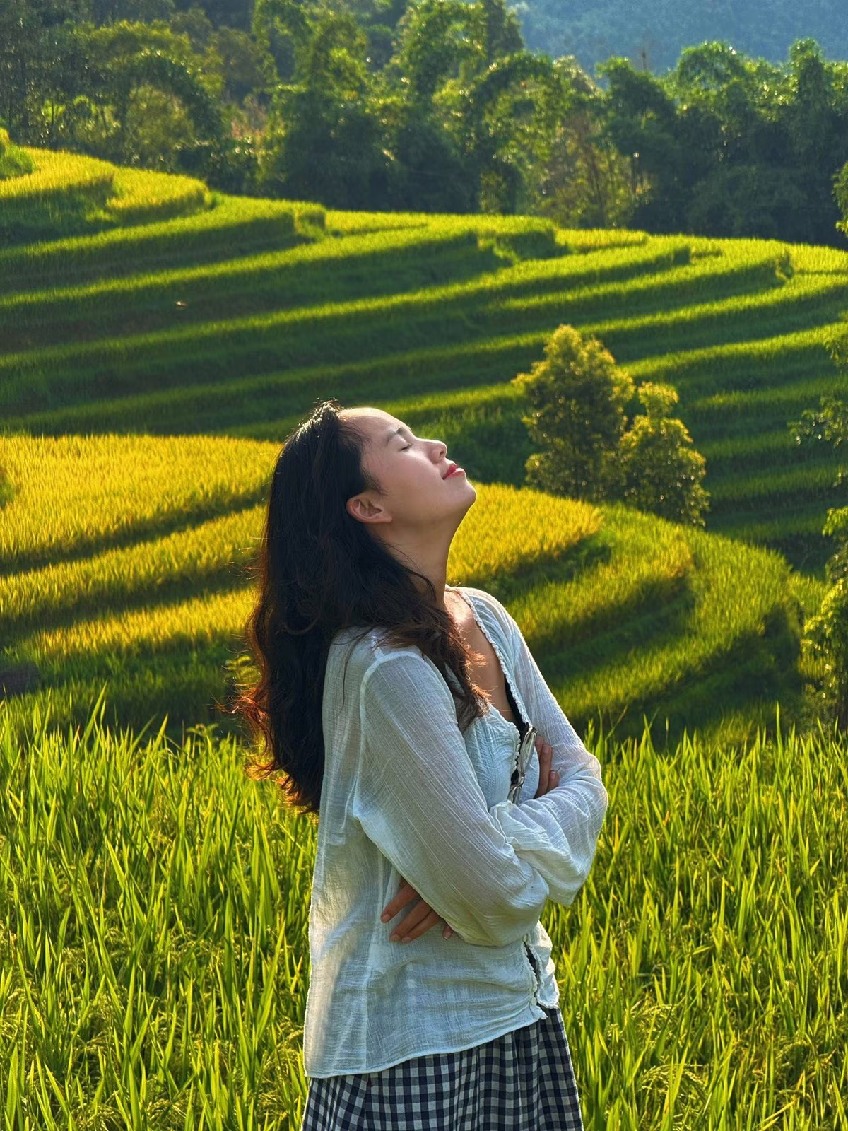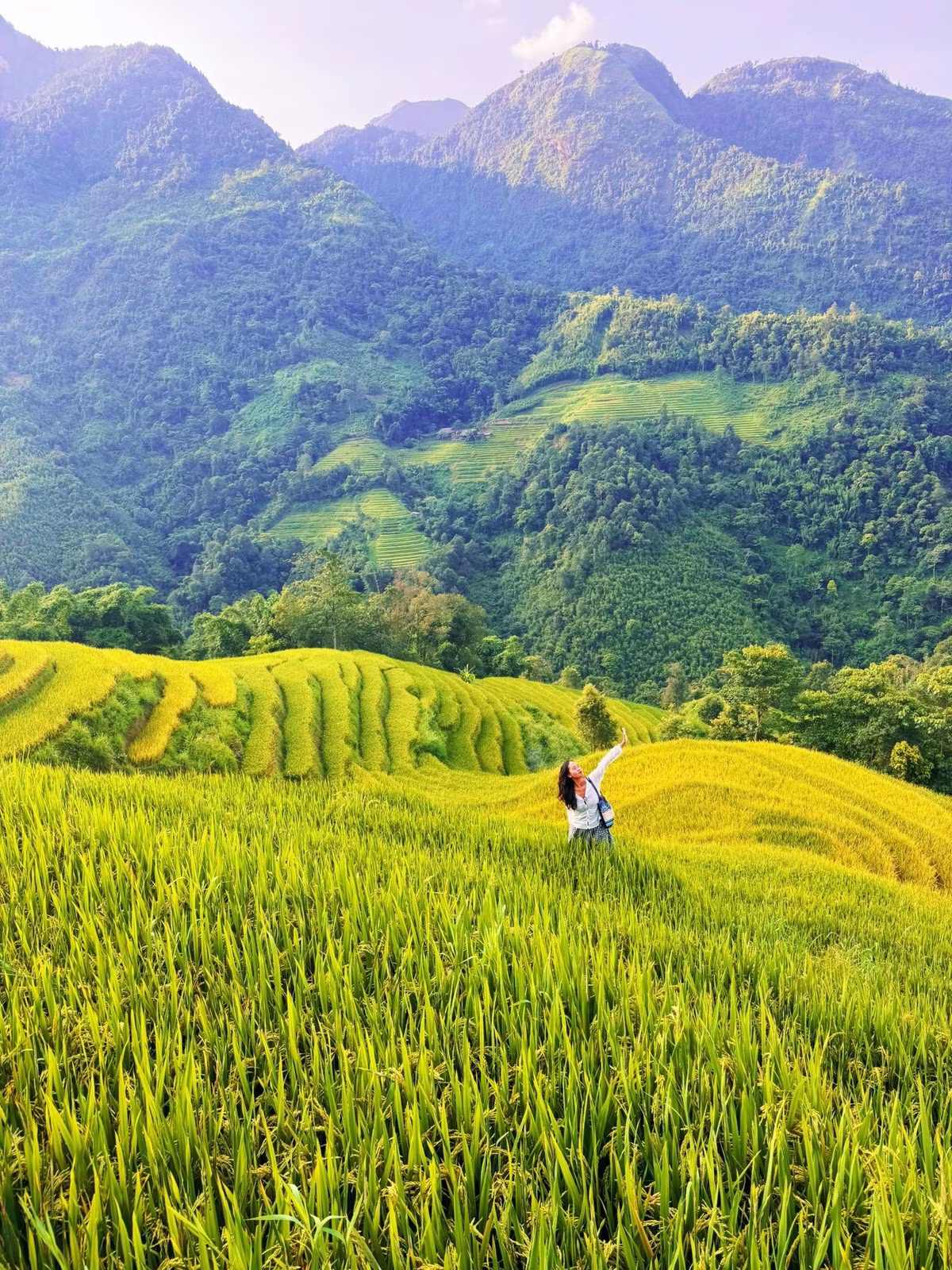 The photograph captures a beautiful moment of peace in Seo Chong Ho where visitors can immerse themselves in the golden ripe rice season of the Northwest. The girl in the picture gently closes her eyes breathing in the fresh air enjoying the tranquility bestowed by nature. The terraced fields stretch out changing color from lush green to golden yellow creating a majestic and poetic landscape. This is an ideal place to escape the urban noise return to the rustic beauty of the mountains and forests and feel the harmonious blend of heaven earth and people. An unforgettable experience for those who love the beauty of Northwest's ripe rice.#SeoChongHo #NorthwestRiceSeason #TerracedFields #NorthwestTravel #PeacefulEscape