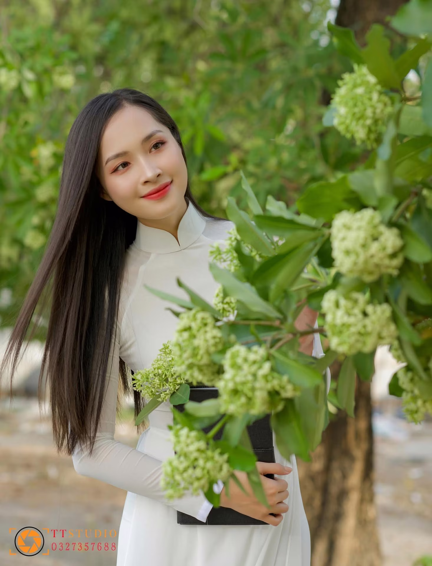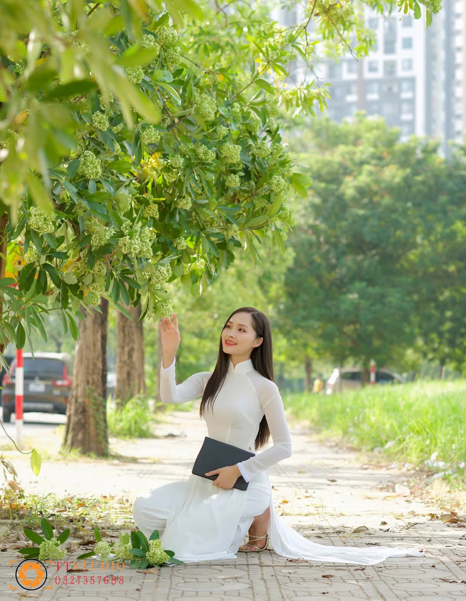 In this photograph, a graceful Vietnamese girl adorned in a pristine white Ao Dai, a timeless symbol of traditional beauty, captures the essence of serene elegance. She kneels gently by the pathway, her delicate hand reaching up to touch the lush green foliage, possibly blossoming flowers, creating a beautiful moment of harmony between humanity and nature. Her radiant smile and gentle gaze exude tranquility and pure charm. The flowing white Ao Dai softly cascades onto the ground, further enhancing her graceful and refined appearance. Although an urban landscape is visible in the distance, this scene maintains a peaceful and romantic ambiance. This image is not merely a snapshot but a heartfelt tribute to Vietnamese cultural beauty, celebrating the elegance of a Vietnamese woman in her traditional attire, evoking feelings of serenity and timeless grace.