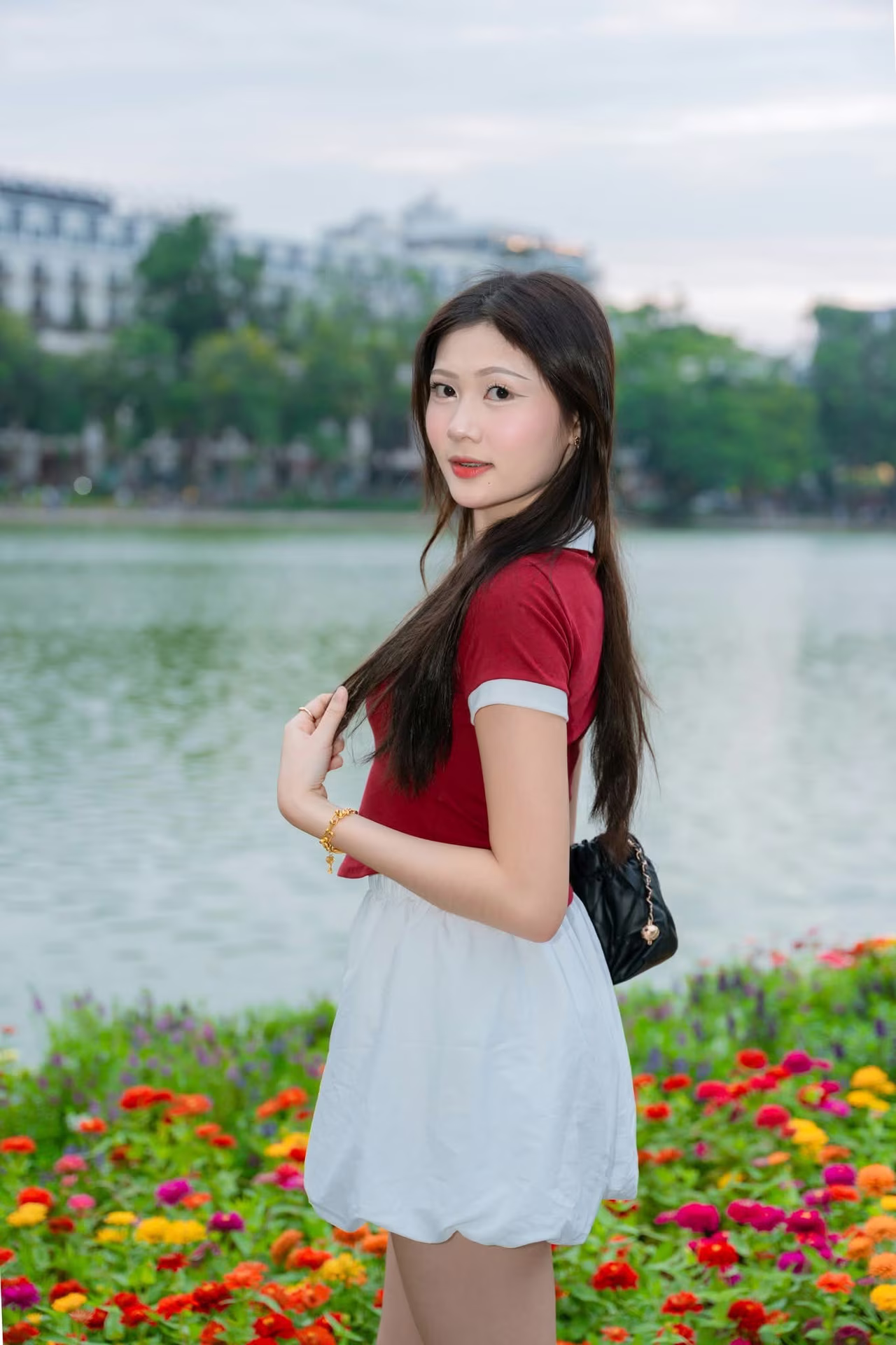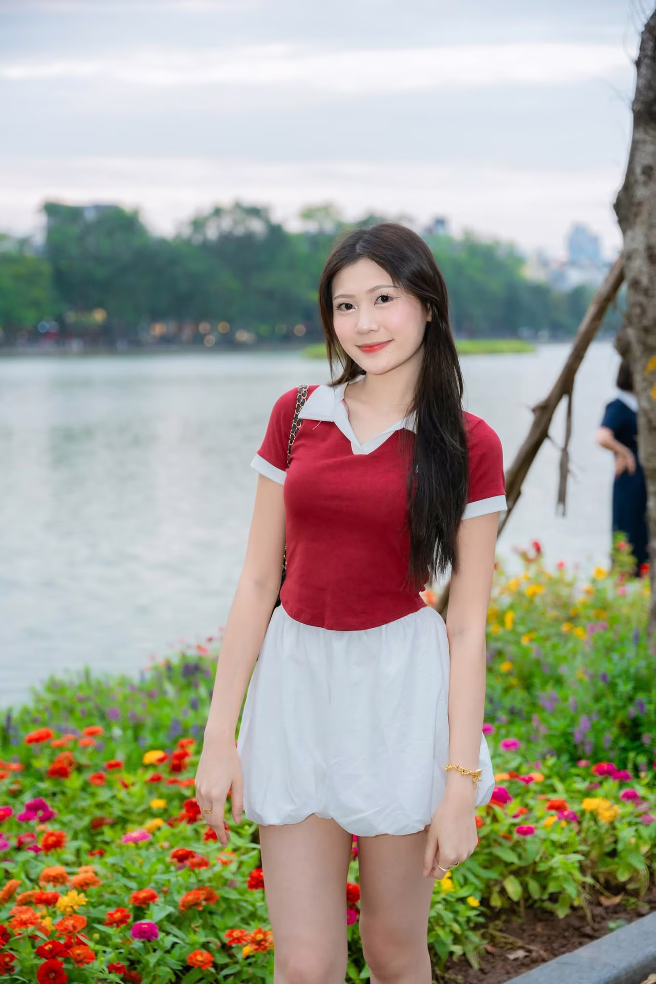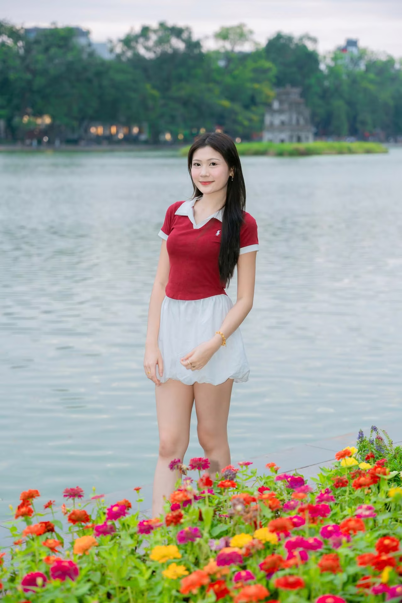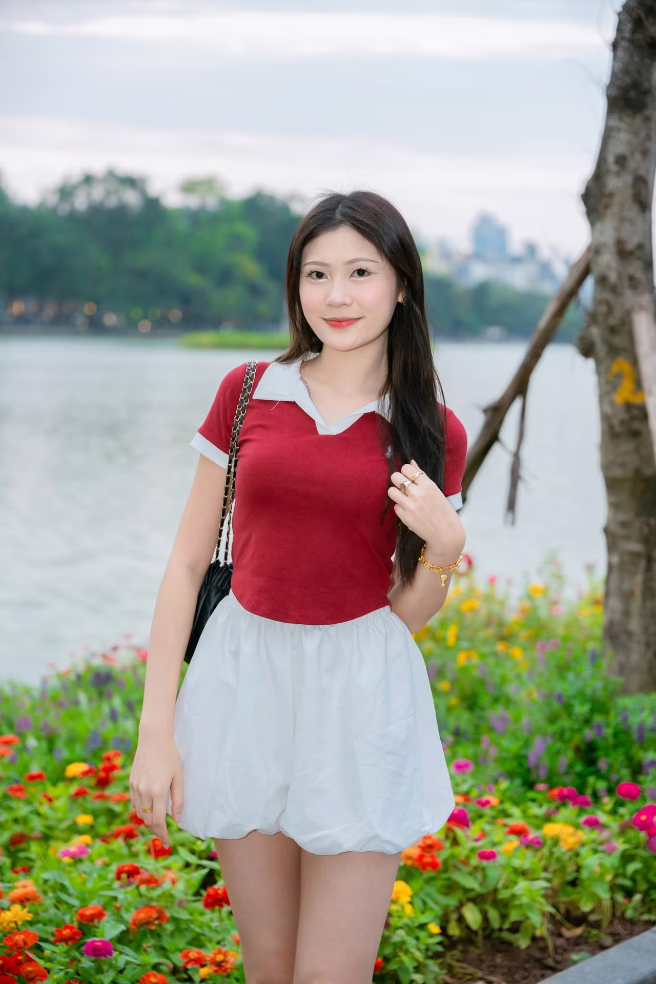 This VGU No42 image captures a beautiful moment of a vibrant and elegant Vietnamese girl Dressed in a simple yet stylish red top and white shorts she confidently strolls along the sparkling lakeside A colorful array of yellow orange and red flowers lines the pathway creating a picturesque and energetic backdrop The gentle beauty of the person harmonizes with the fresh natural scenery evoking a sense of peace and relaxation This is more than just a fashion photo it is a symbol of the natural beauty and modern lifestyle of young Vietnamese people in an urban setting The image offers an intimate glimpse into daily life and the charming landscapes of Vietnam #Vietnamese #pretty #charm