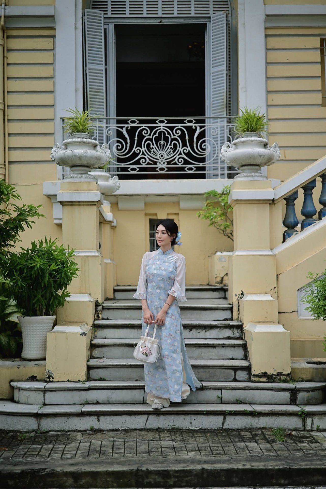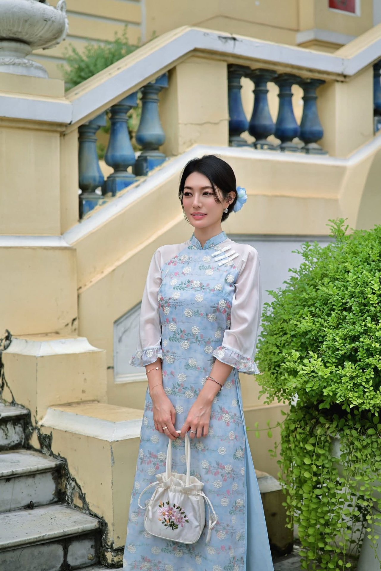 This stunning image features model Pai Huang Gua Girl embodying a sophisticated and alluring office style She showcases a modern aesthetic with an elegant striped shirt a chic short leather skirt and luxurious thigh-high black stockings paired with refined high heels Her confident gaze behind glasses and graceful pose by the balcony create an image of a powerful and captivating urban woman This is more than just a fashion photograph it is a symbol of self-assurance professionalism and the subtle allure found in contemporary office environments The XiuRen No10280 collection truly captures a unique and distinctive styleGraceful Vietnamese Woman in Blue Ao Dai Elegant Traditional Beauty