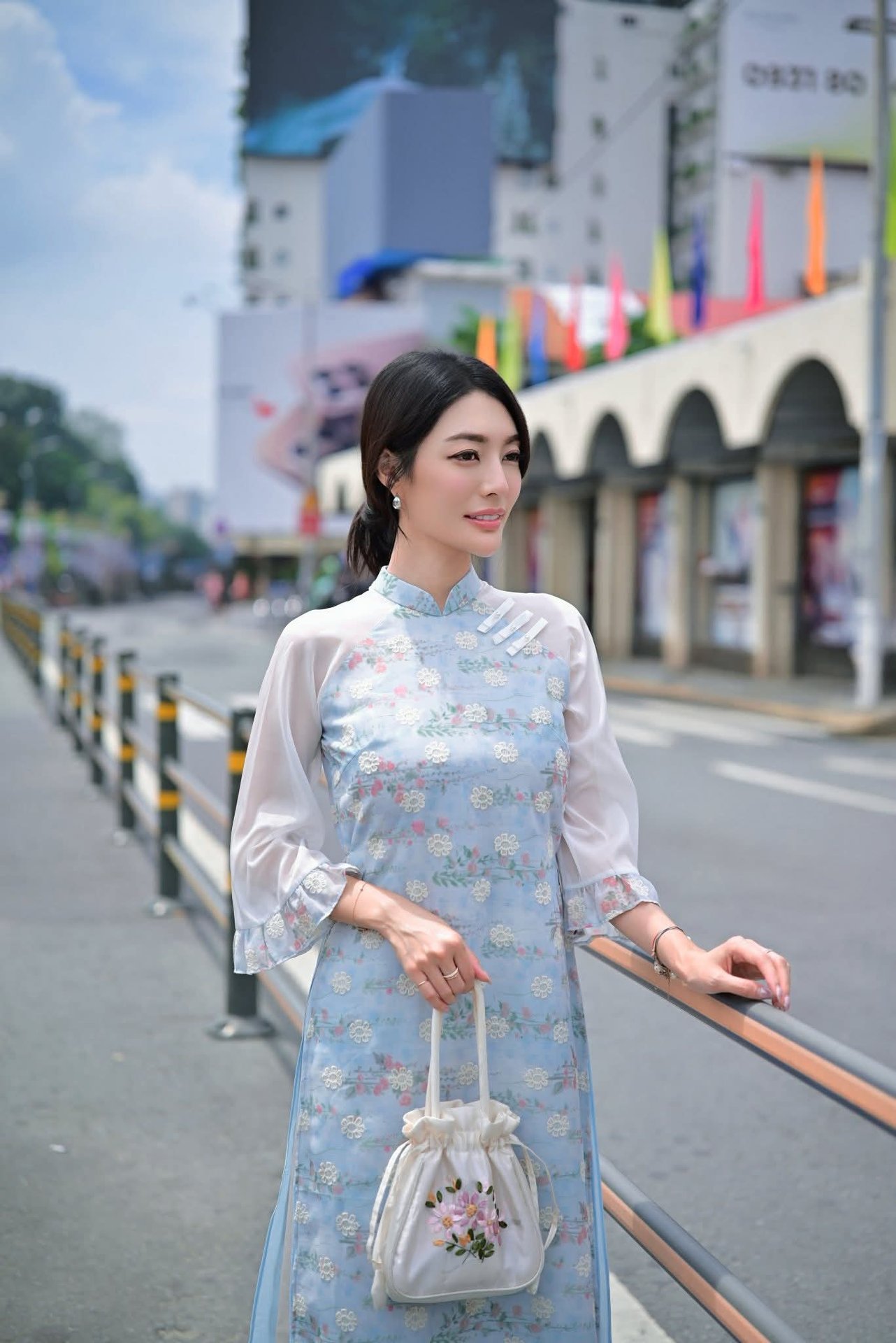 This stunning photograph captures a graceful Vietnamese woman adorned in a delicate light blue traditional Ao Dai Her radiant smile and proud eyes illuminate the entire frame She proudly holds aloft the vibrant red national flag with its five-pointed golden star symbolizing profound patriotism and national pride The Ao Dai not only enhances her physical beauty but also stands as an exquisite cultural emblem of Vietnam The blend of the woman s gentle beauty and national pride creates an emotionally resonant and meaningful image It is an elegant and proud moment embodying the Vietnamese spirit amidst an urban setting