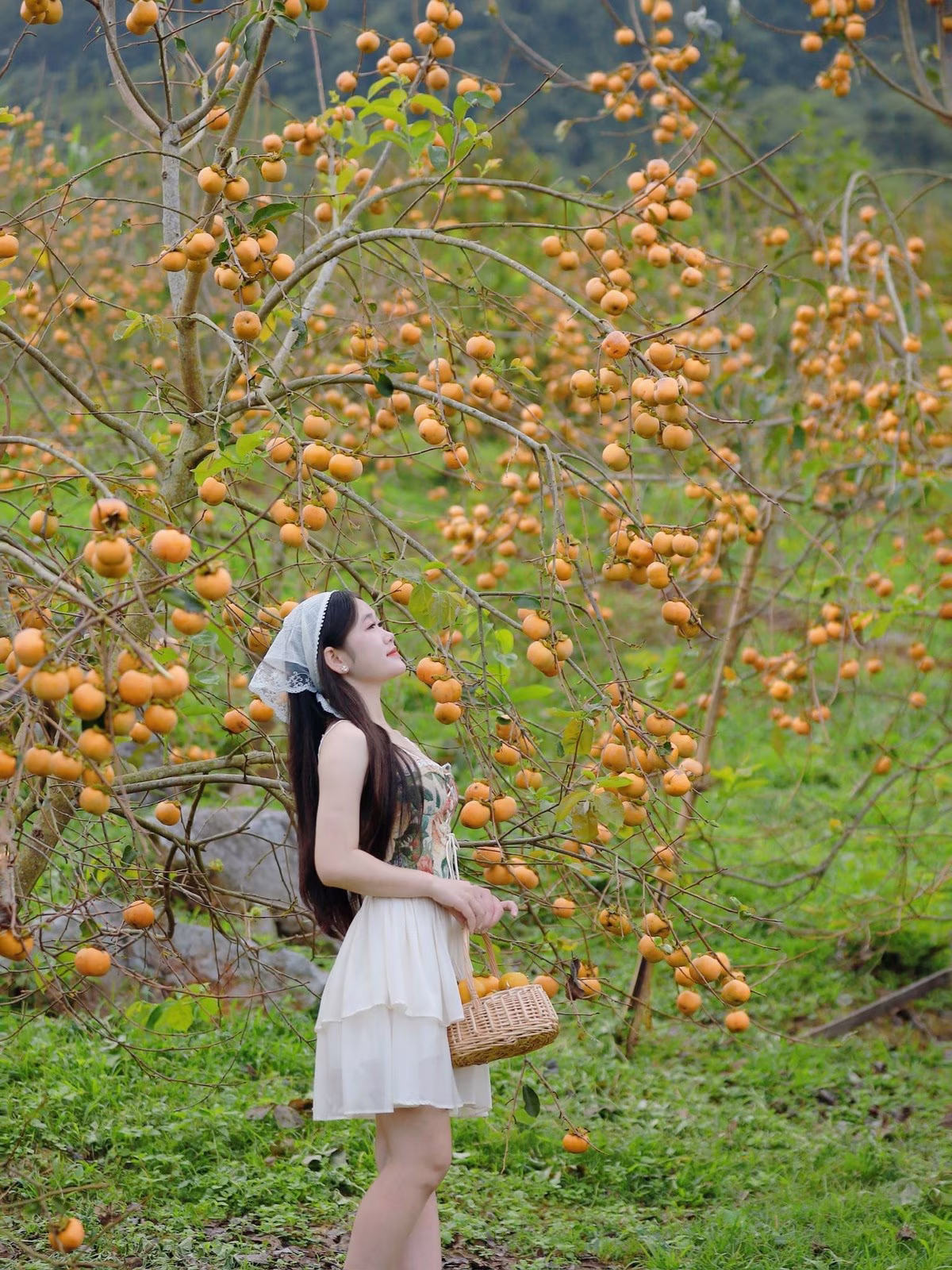 Image XVG No.46 captures a breathtakingly peaceful moment. Amidst a lush green natural landscape, a young woman with pure natural beauty sits relaxed on a simple wooden bench. She wears a rustic, earthy-toned linen dress, highlighting her gentle and elegant demeanor. A small stream flows softly behind her, adorned with delicate pink petals, creating a poetic and vibrant scene. Her soft smile and dreamy gaze seem to blend into the tranquil atmosphere, offering a sense of calm and leaving all urban noise behind. This is more than just a photograph; it is an invitation to immerse oneself in simple beauty, finding inner peace within the heart of nature.