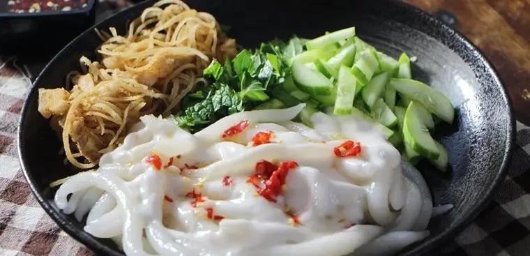 This vibrant image showcases Banh Tam Bi, a renowned rustic specialty from Vietnam's Mekong Delta. This traditional dish captivates diners with its exquisite blend of soft, chewy rice noodles and fragrant shredded pork skin. Rich coconut milk perfectly harmonizes with a sweet and sour fish sauce, creating a distinctive and unforgettable flavor profile. Fresh herbs, bean sprouts, and crispy spring rolls further enhance its appeal. Banh Tam Bi is more than just a meal; it's a deep cultural culinary experience of the Mekong Delta. Visitors are sure to be addicted from the very first bite and eager to explore more unique flavors of this charming region.#BanhTamBi #MekongDeltaFood #VietnameseCuisine #StreetFoodVietnam #FoodDiscovery