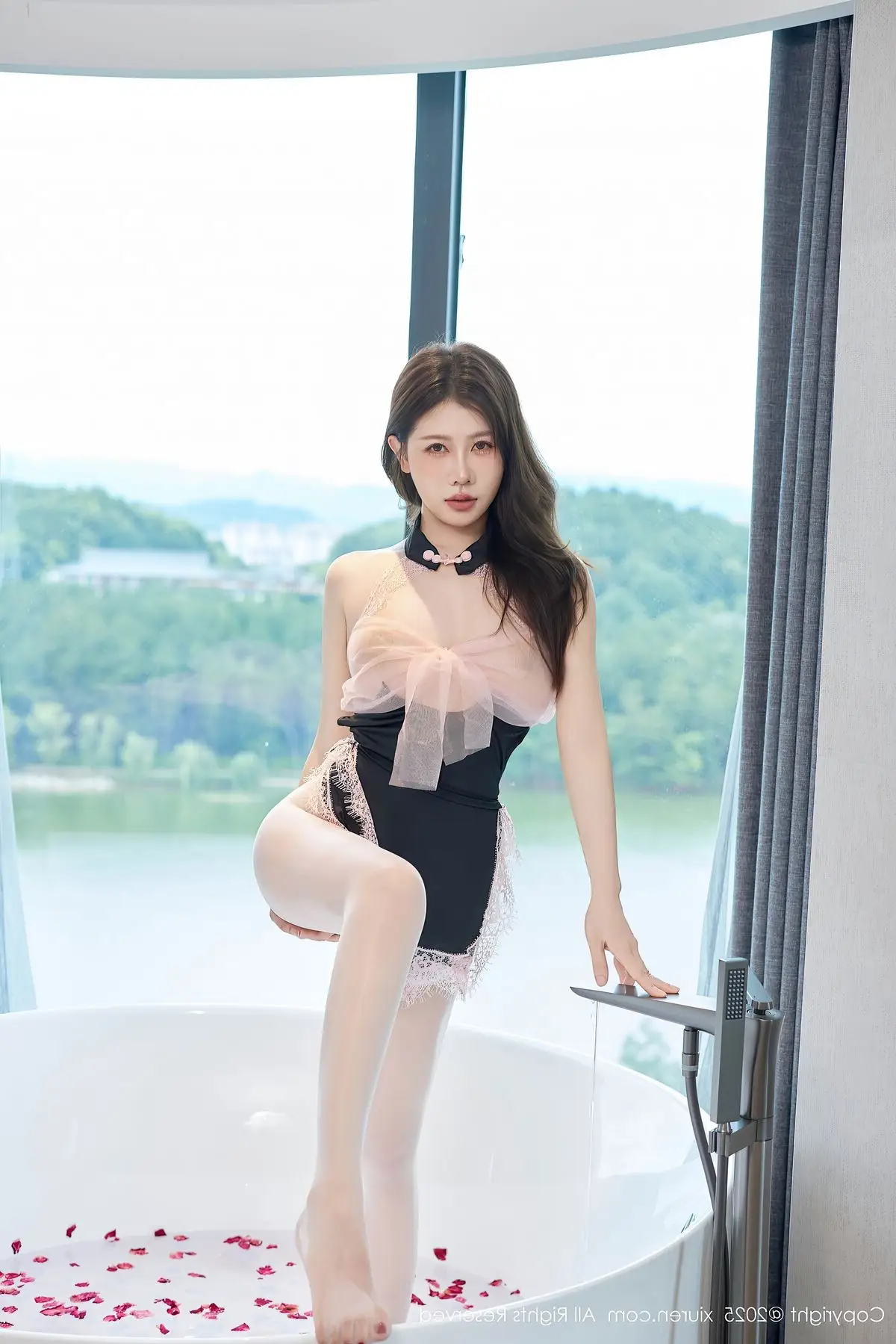 Immerse yourself in the captivating world of Yi Tian Tian featured in the exclusive XiuRen No.10680 collection. This stunning photo captures an enchanting moment as Yi Tian Tian relaxes in a luxurious bathtub filled with romantic rose petals. Dressed in a delicate and sensual outfit, she exudes an irresistible elegance and charm. Her deep gaze and gentle smile perfectly blend with the serene window view of lush green nature, creating a harmonious picture of sophisticated luxury and natural beauty. This emotionally rich photographic work fully showcases the allure of model Yi Tian Tian, offering viewers an unforgettable visual experience.