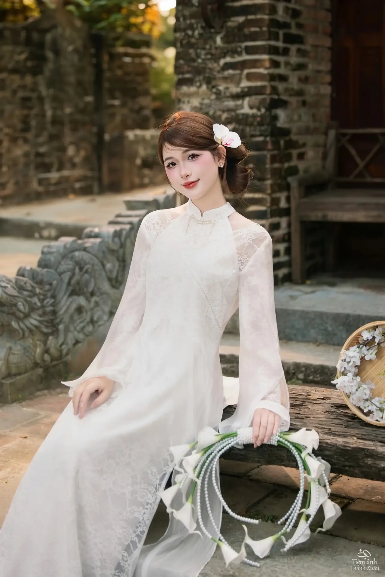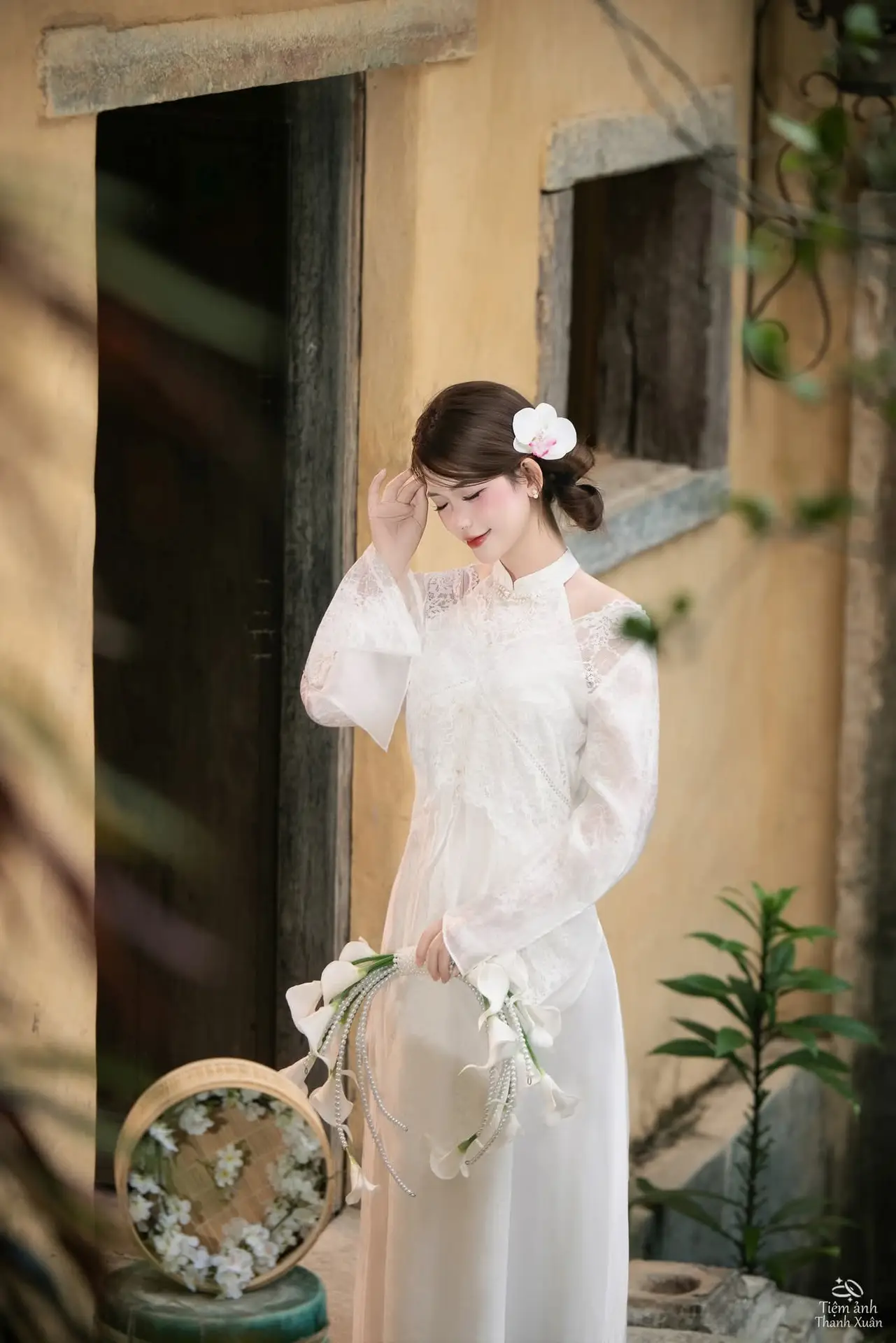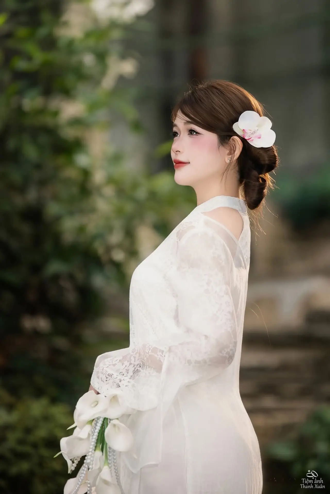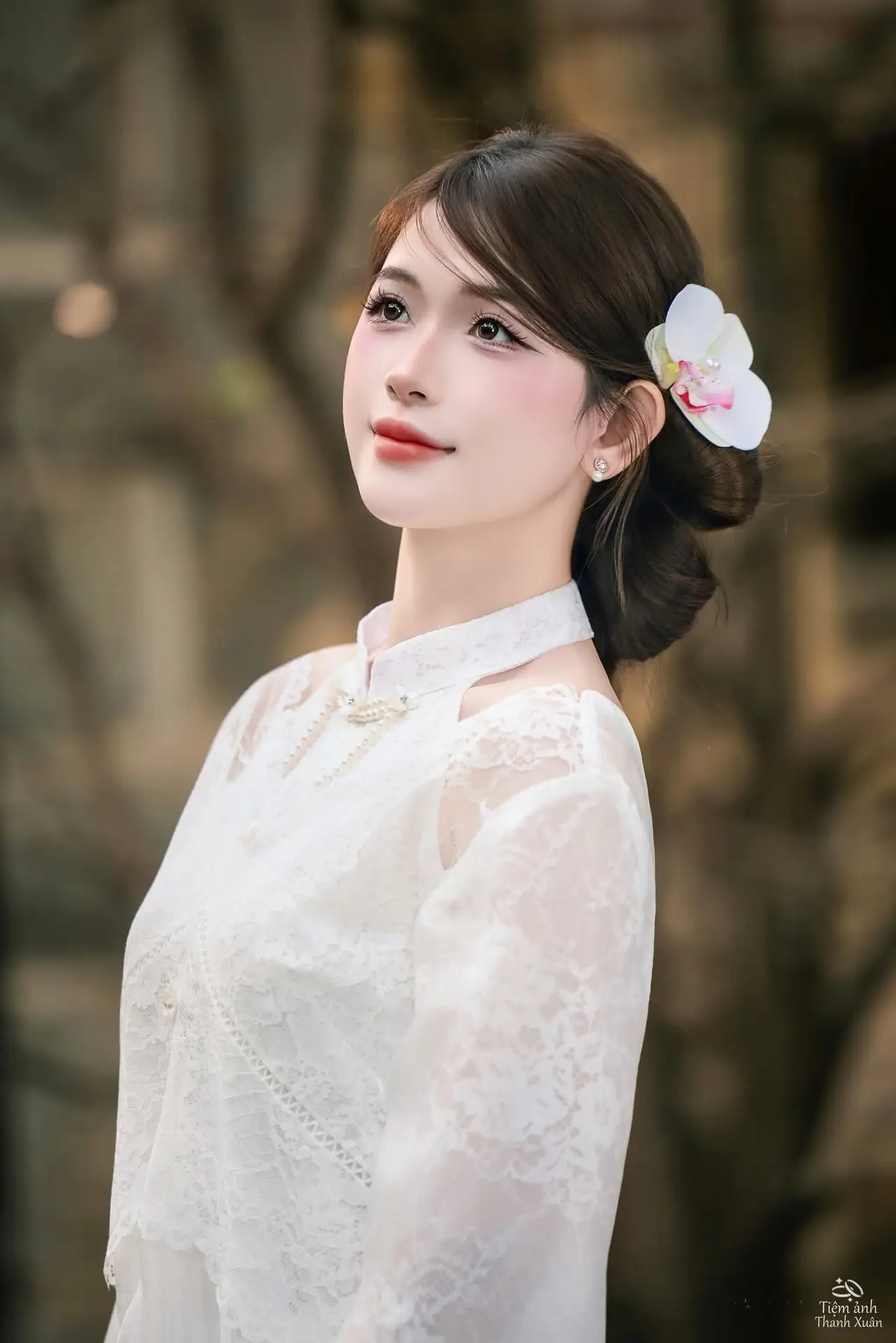 This captivating image beautifully portrays the serene and gentle elegance of an East Asian woman. Her face radiates a peaceful charm, with soft, dreamy eyes and a subtle, graceful smile. Her dark hair is neatly styled, adorned with a delicate white orchid tucked behind her ear, enhancing her refined and pure beauty. She wears an exquisitely crafted white lace top, reminiscent of charming traditional attire. This portrait not only showcases her striking physical beauty but also conveys a sense of grace and tranquility, offering a calming visual experience. It is a timeless moment of poise and inherent allure.#ElegantBeauty #AsianGirl #WhiteOrchid #TraditionalCharm #GracefulPortrait