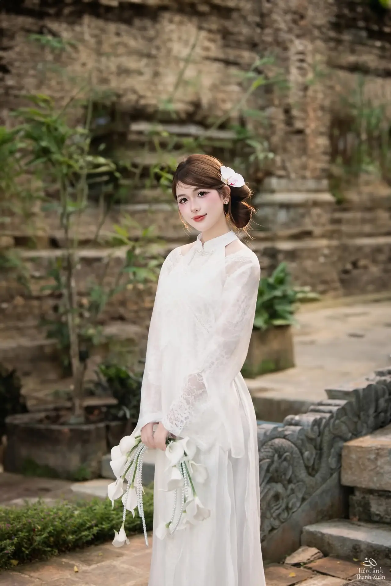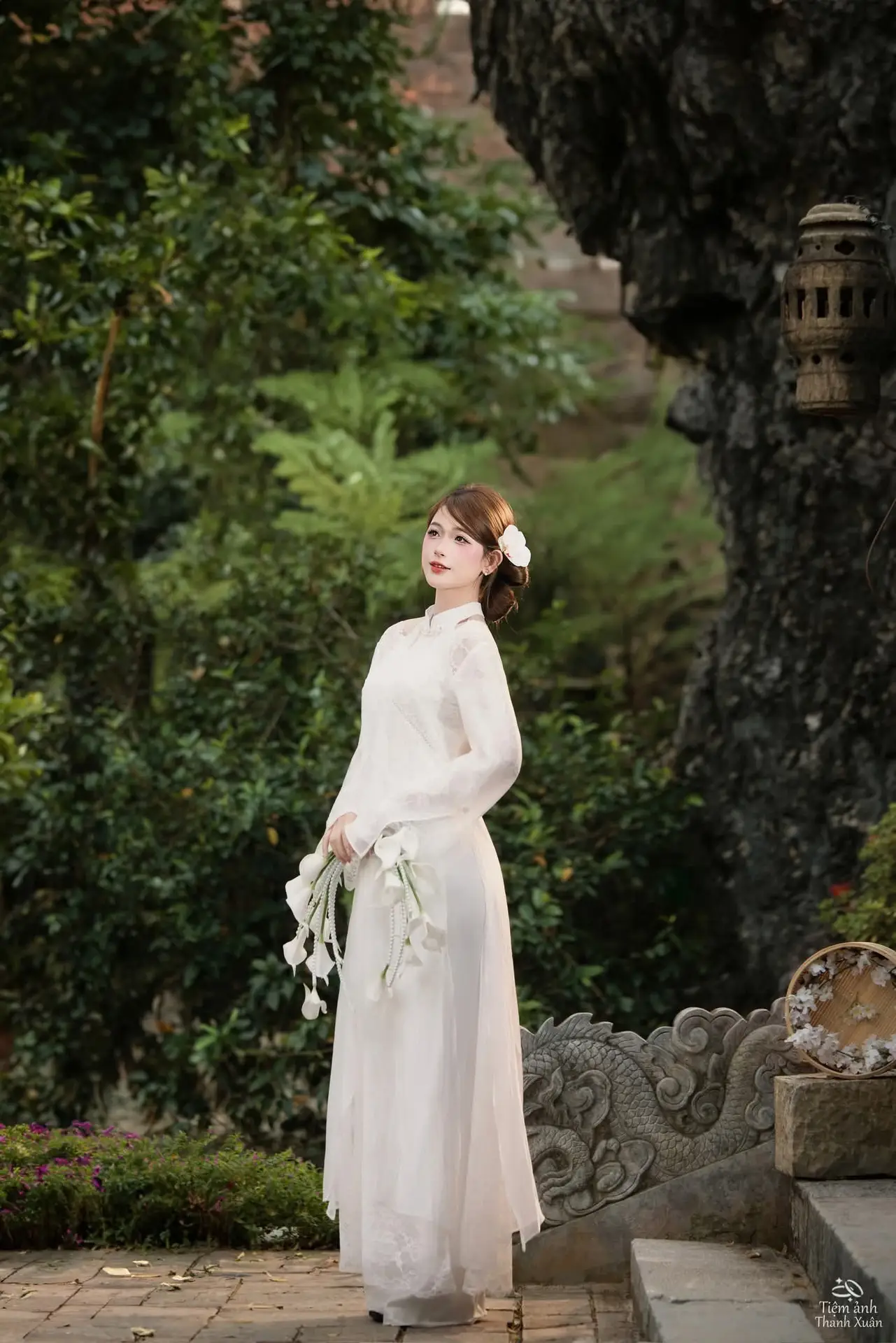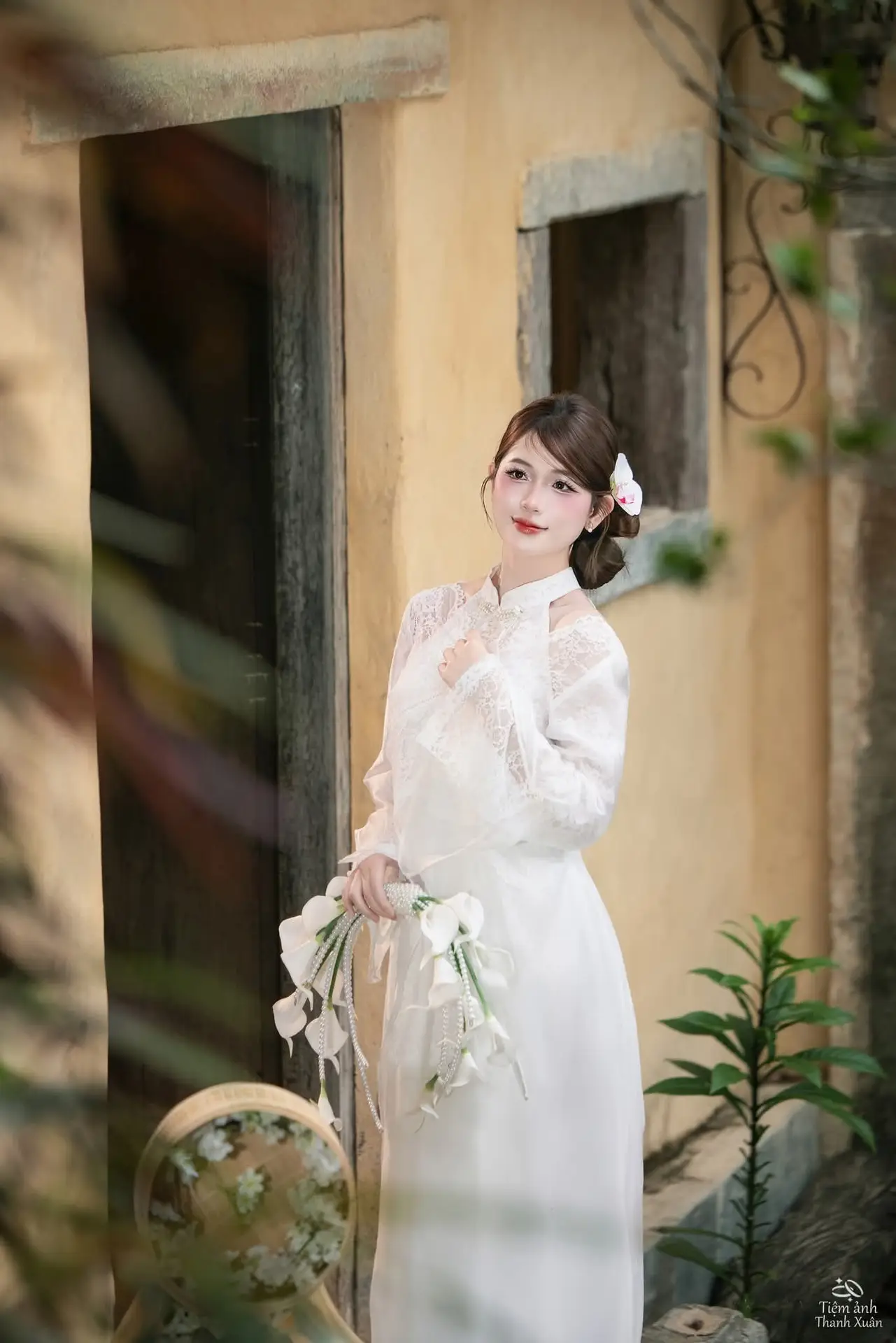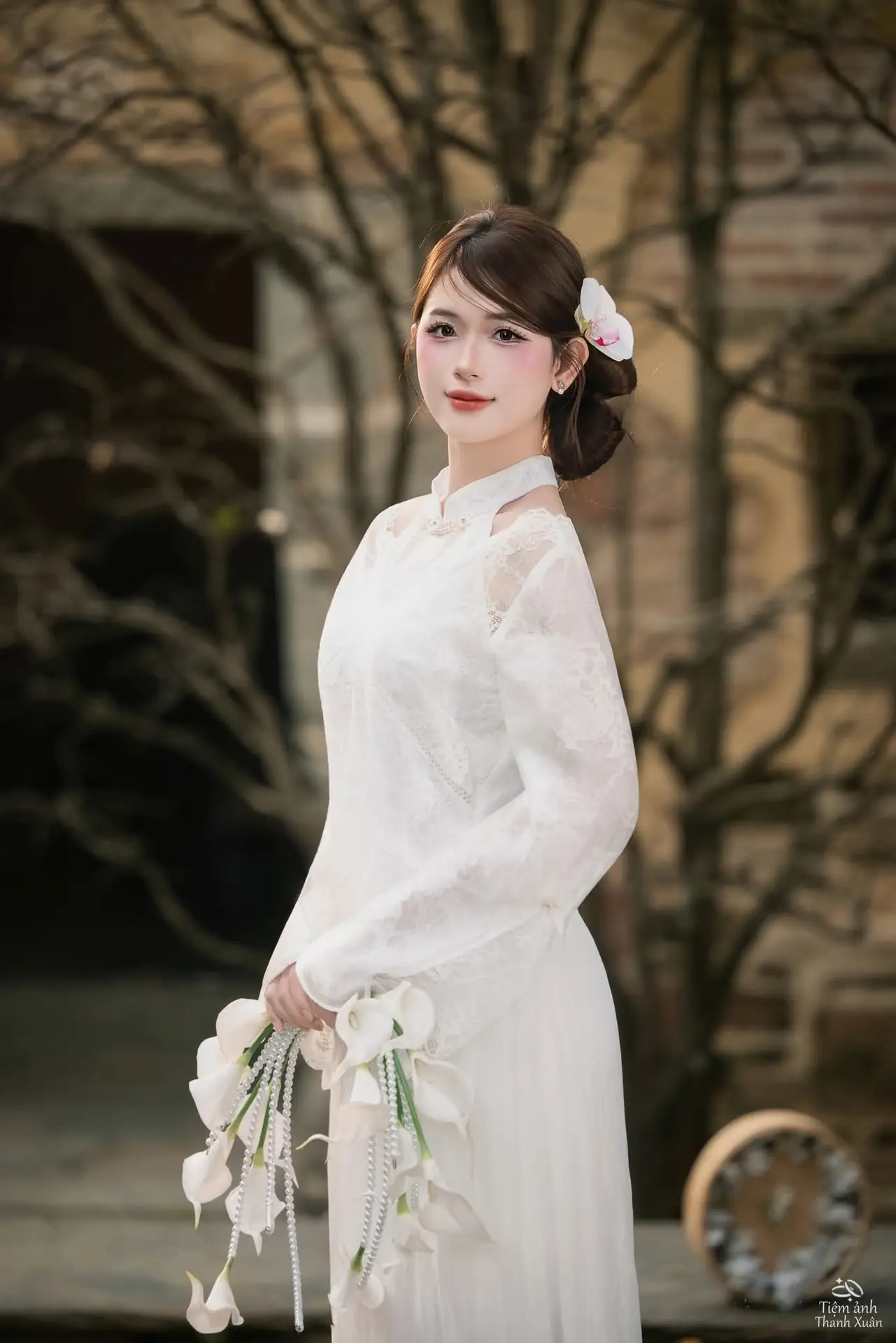 This captivating image beautifully portrays the serene and gentle elegance of an East Asian woman. Her face radiates a peaceful charm, with soft, dreamy eyes and a subtle, graceful smile. Her dark hair is neatly styled, adorned with a delicate white orchid tucked behind her ear, enhancing her refined and pure beauty. She wears an exquisitely crafted white lace top, reminiscent of charming traditional attire. This portrait not only showcases her striking physical beauty but also conveys a sense of grace and tranquility, offering a calming visual experience. It is a timeless moment of poise and inherent allure.#ElegantBeauty #AsianGirl #WhiteOrchid #TraditionalCharm #GracefulPortrait
