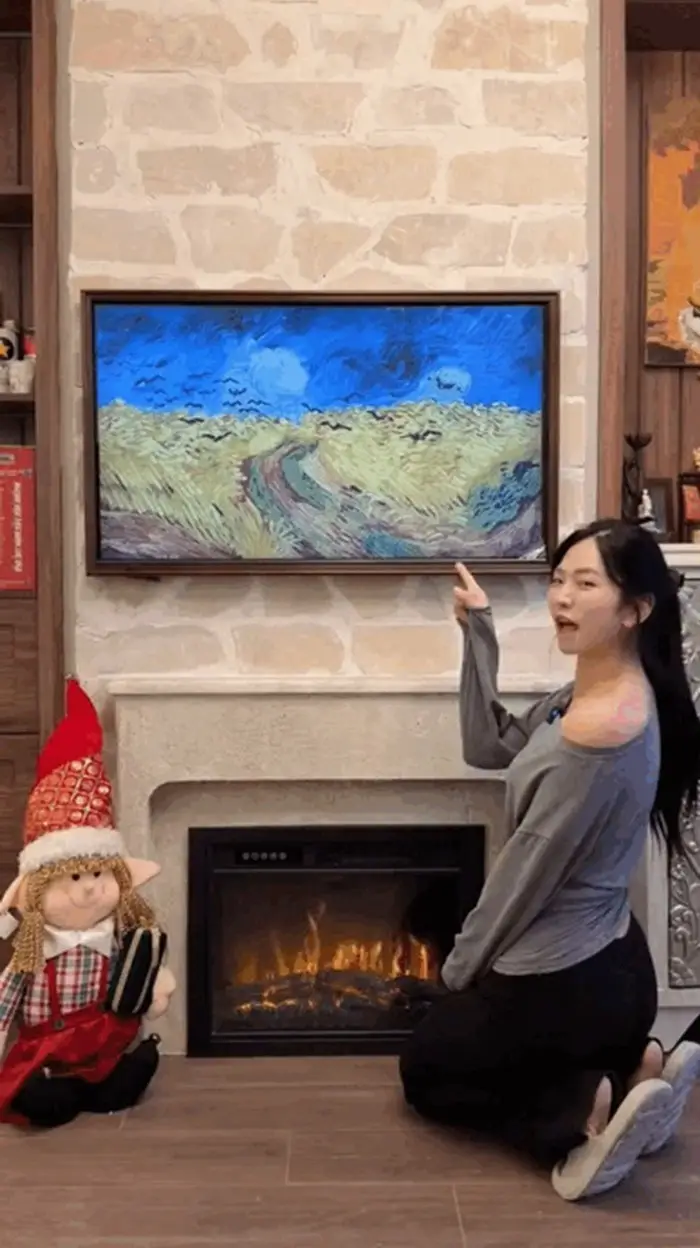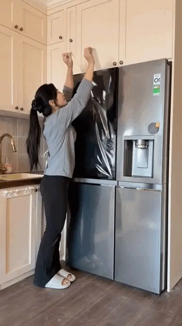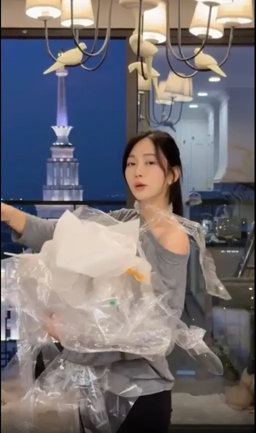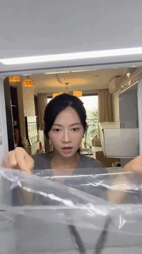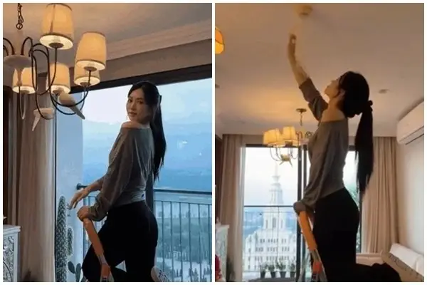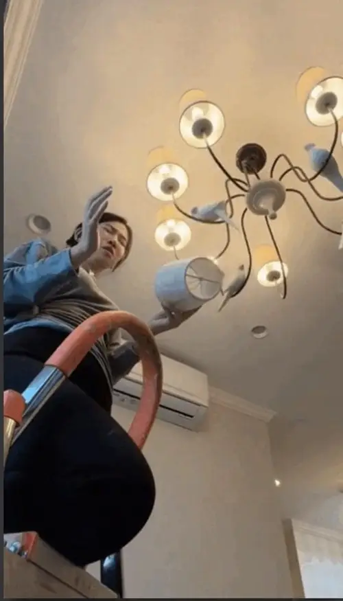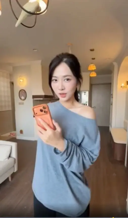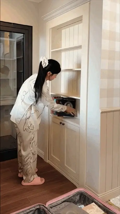 Step into a warm, everyday moment within Lê Bống's modern living space. This image reveals a meticulously designed corner featuring minimalist interiors, creating a sense of neatness and relaxation. Lê Bống, dressed comfortably in pajamas, is seen organizing items into a chic white built-in cabinet, showcasing her tidy habits and dedication to her home. The subtly striped wallpaper combined with wainscoting adds a touch of classic yet contemporary elegance. An open suitcase in the foreground hints at travel adventures or preparations for a new chapter. This truly is a cozy living space, reflecting the individual style and refined taste in decorating her new home.#LeBong #ModernLivingSpace #MinimalistDesign #LeBongHome #InteriorDesign