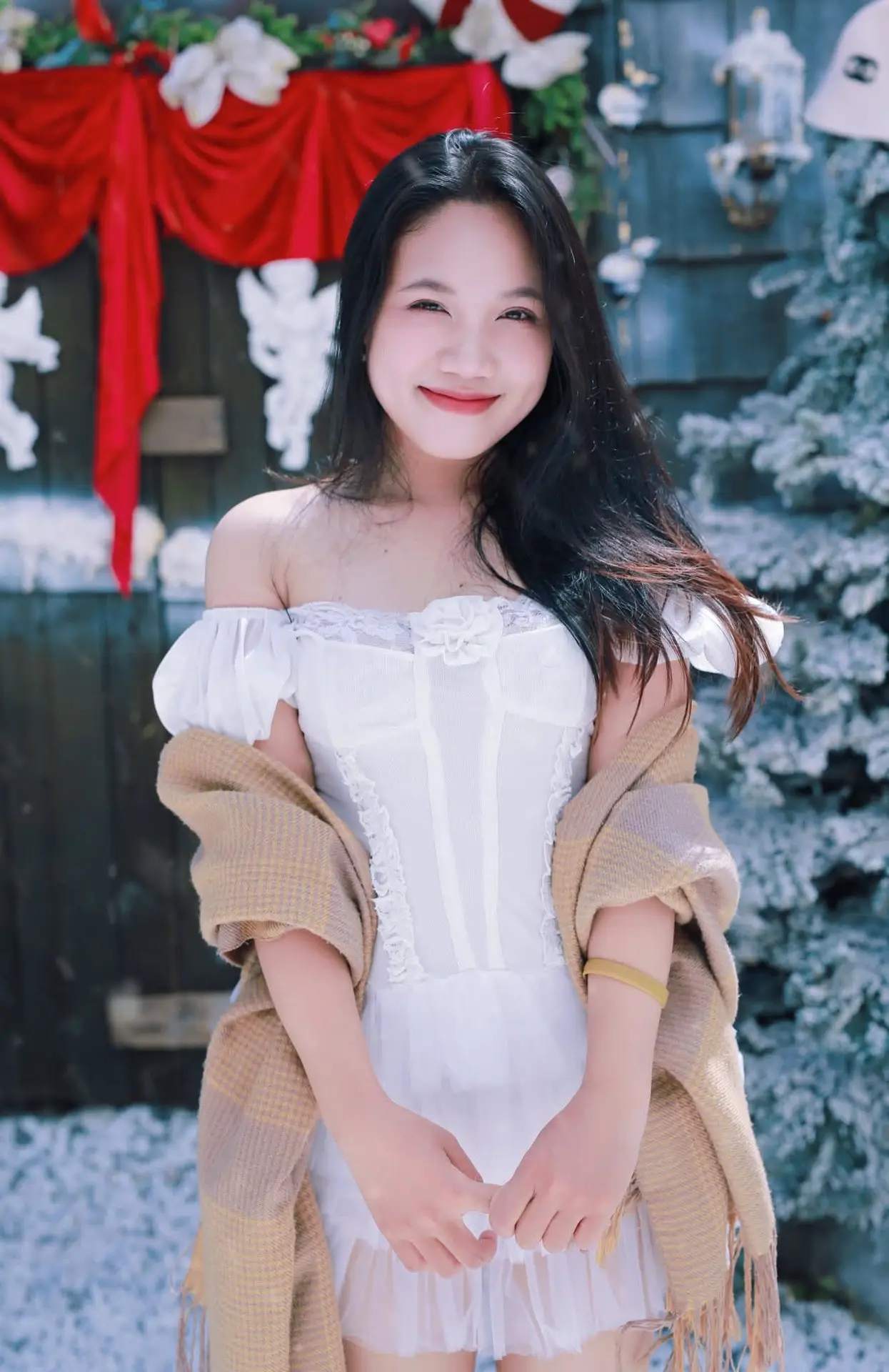 This beautiful image captures a charming young woman in a serene moment. She adorns a pristine white dress, delicately revealing her graceful bare shoulders, complemented by a warm brown shawl. This ensemble creates an elegant yet alluring look. Her bright smile and dreamy gaze further enhance her captivating presence. The background features a faux snow-covered winter scene, evoking a magical and romantic fairytale setting. The girl appears like a muse wandering into a wondrous land, bringing a sense of warmth and tranquility. This photograph is a perfect blend of human beauty and artistic ambiance, sure to enchant every viewer.#VietnameseGirl #WinterFashion #WhiteDress #SnowyScene #WinterWonderland