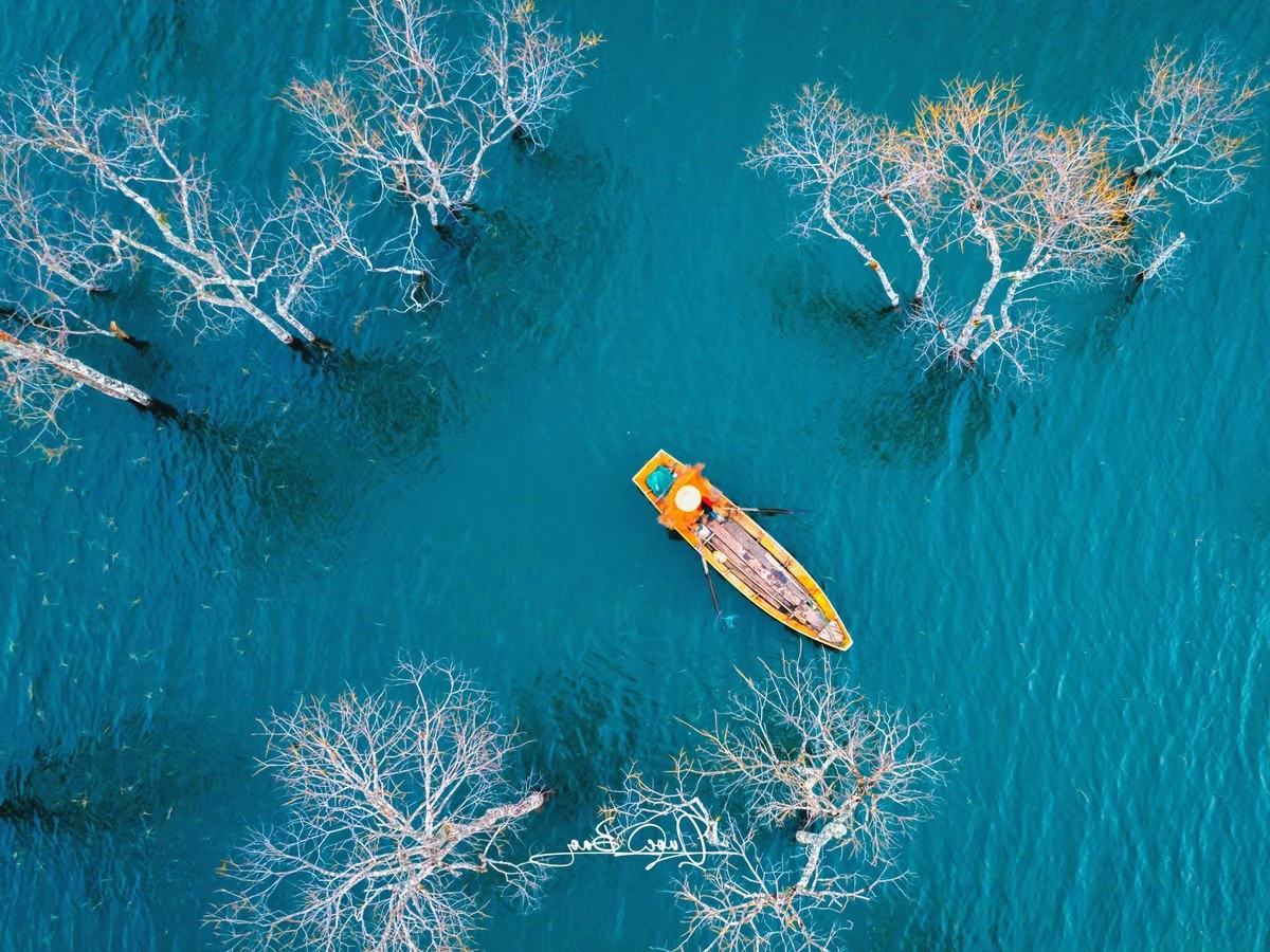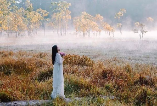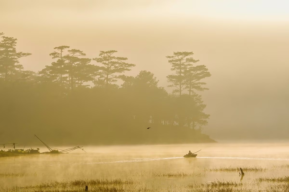 This captivating image unveils Suoi Tia Da Lat at the mystical dawn, where a thick veil of mist blankets the landscape. The scene transforms into an ethereal fairyland amidst the city of a thousand flowers. Characteristic trees stand gracefully amidst the calm, reflective waters, with the faint silhouette of a person gently paddling a boat, quietly exploring this pristine natural beauty. The misty sunrise at Suoi Tia is more than just an ideal check-in spot; it offers a poetic experience, evoking an indescribable sense of peace and wonder. This magical moment is perfect for photography, capturing the unique, mystical charm that makes Da Lat so captivating.