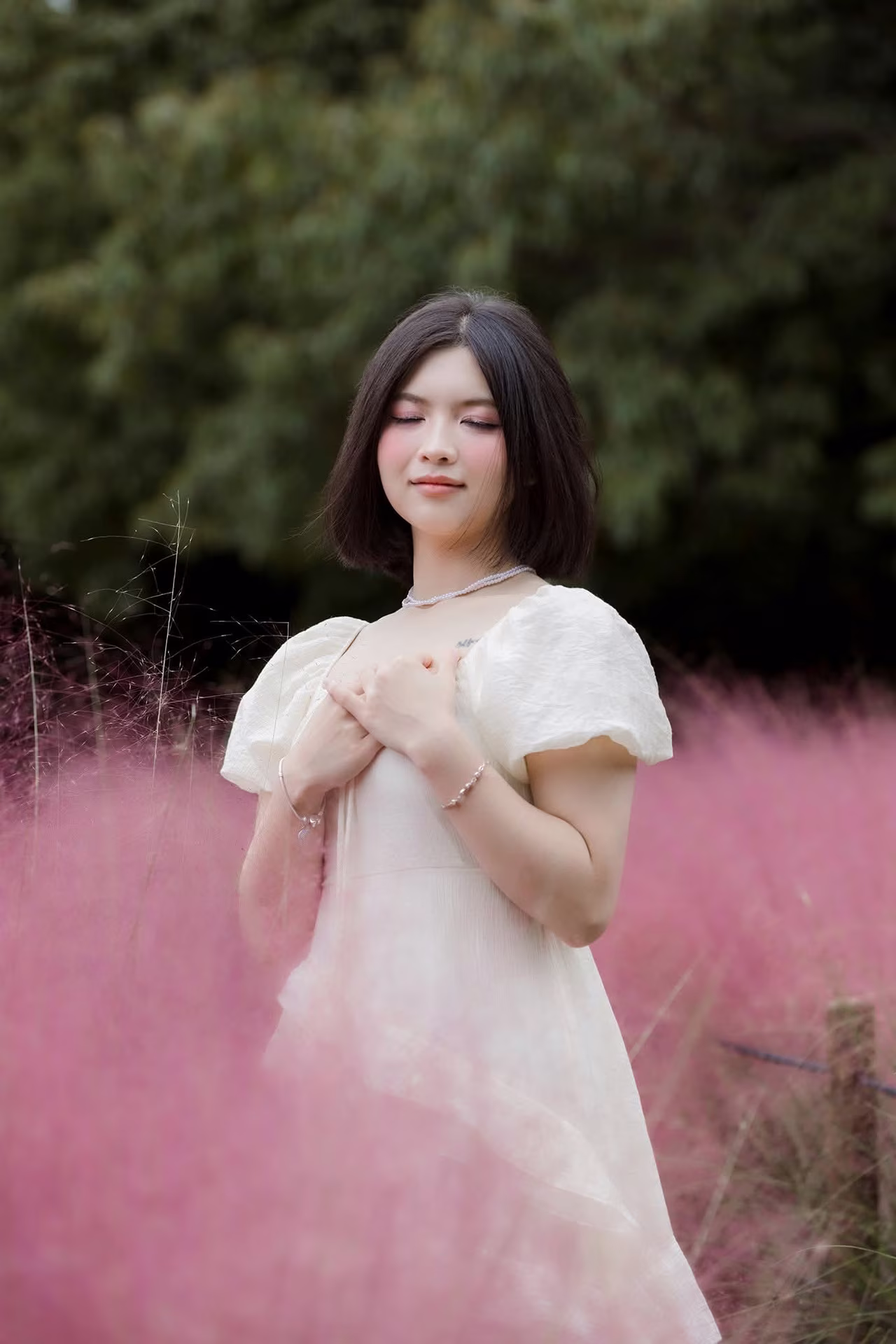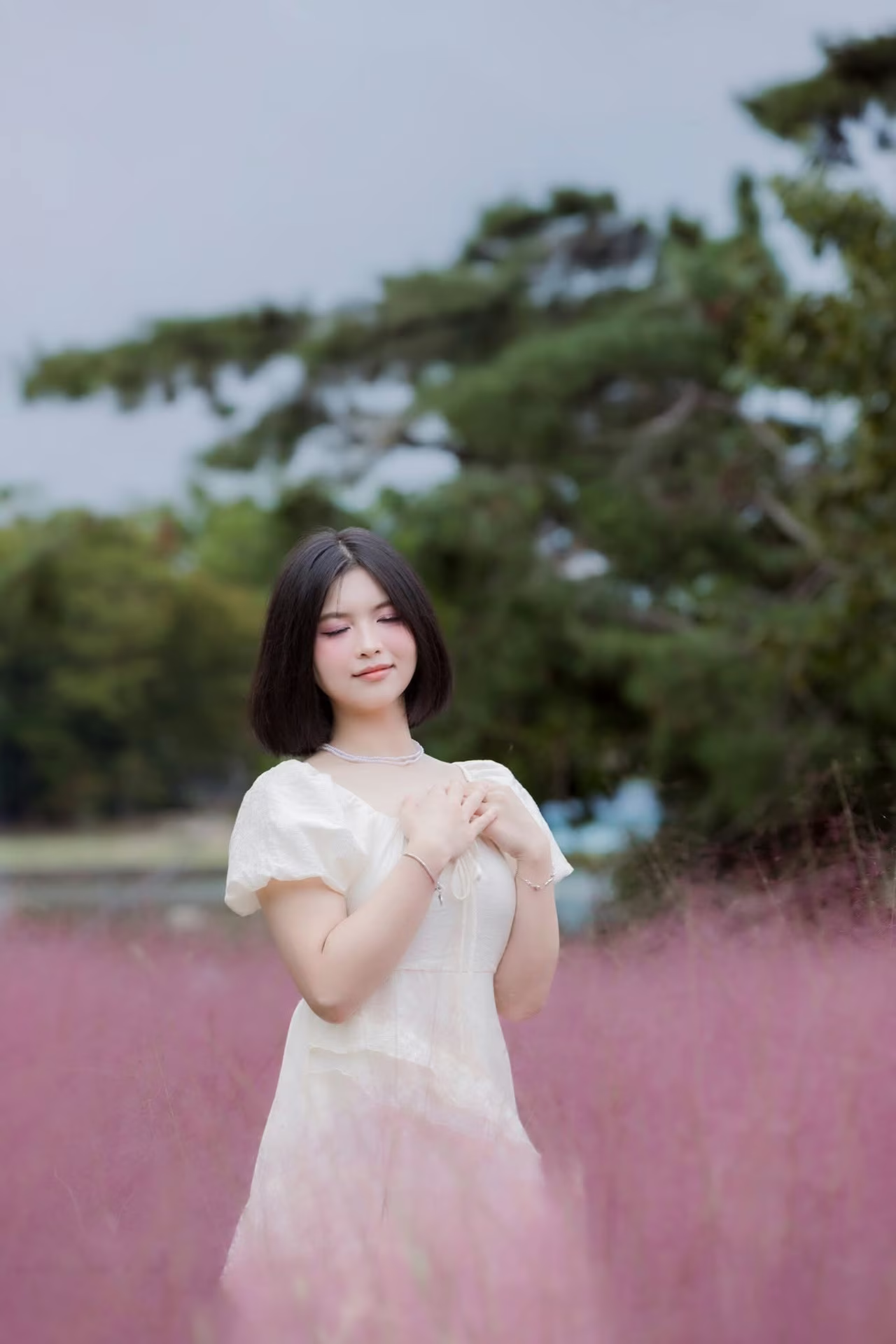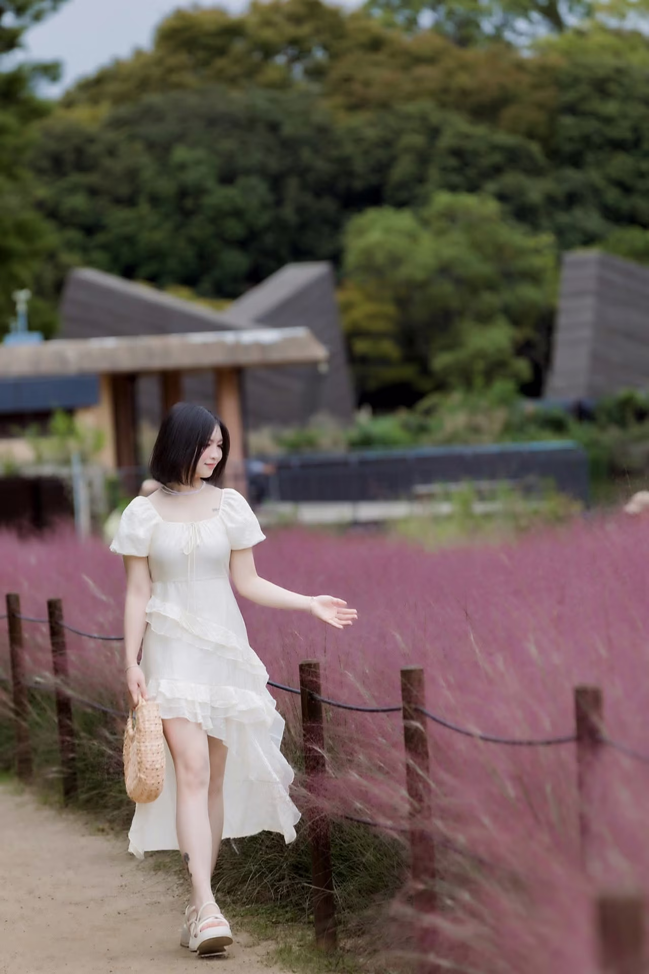 In this captivating image XVG No.33 a young woman with elegant short dark hair graces a breathtaking field of fluffy pink grass. Dressed in a pristine white ethereal dress with a flowing design she embodies a poetic beauty. The soft sunlight gently illuminates her delicate and graceful presence. The sprawling pink grass field resembling a silky carpet creates a romantic and dreamy backdrop. Her gentle stroll with a subtle hand gesture amidst this beautiful nature evokes a sense of peace and tranquility. This photograph is more than just a captured moment it is a perfect fusion of human elegance and the wondrous magic of creation offering an indescribably uplifting feeling. A truly picturesque and inspiring natural scene.