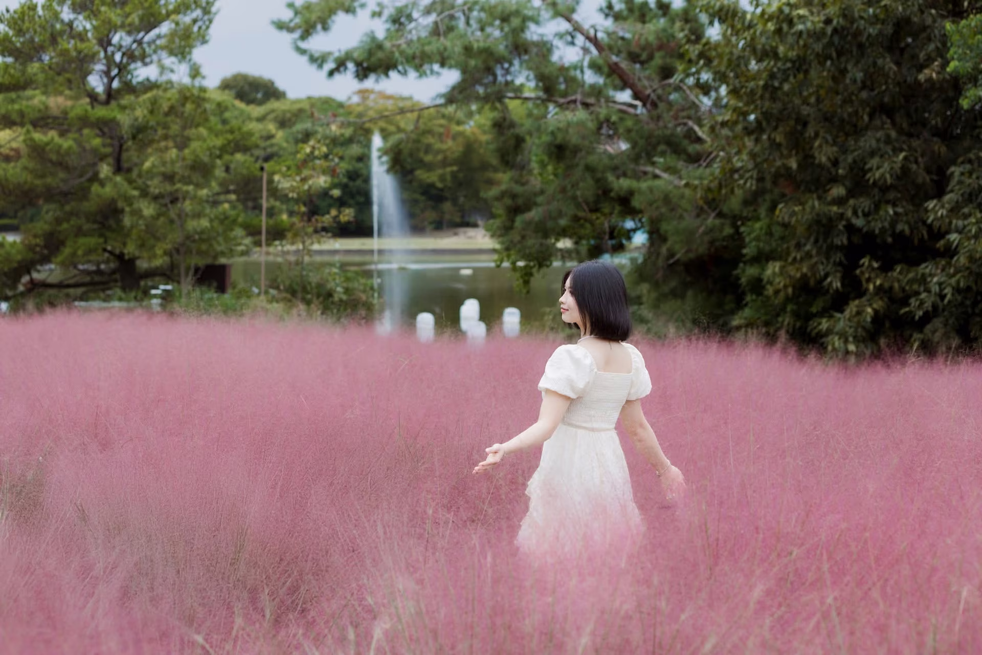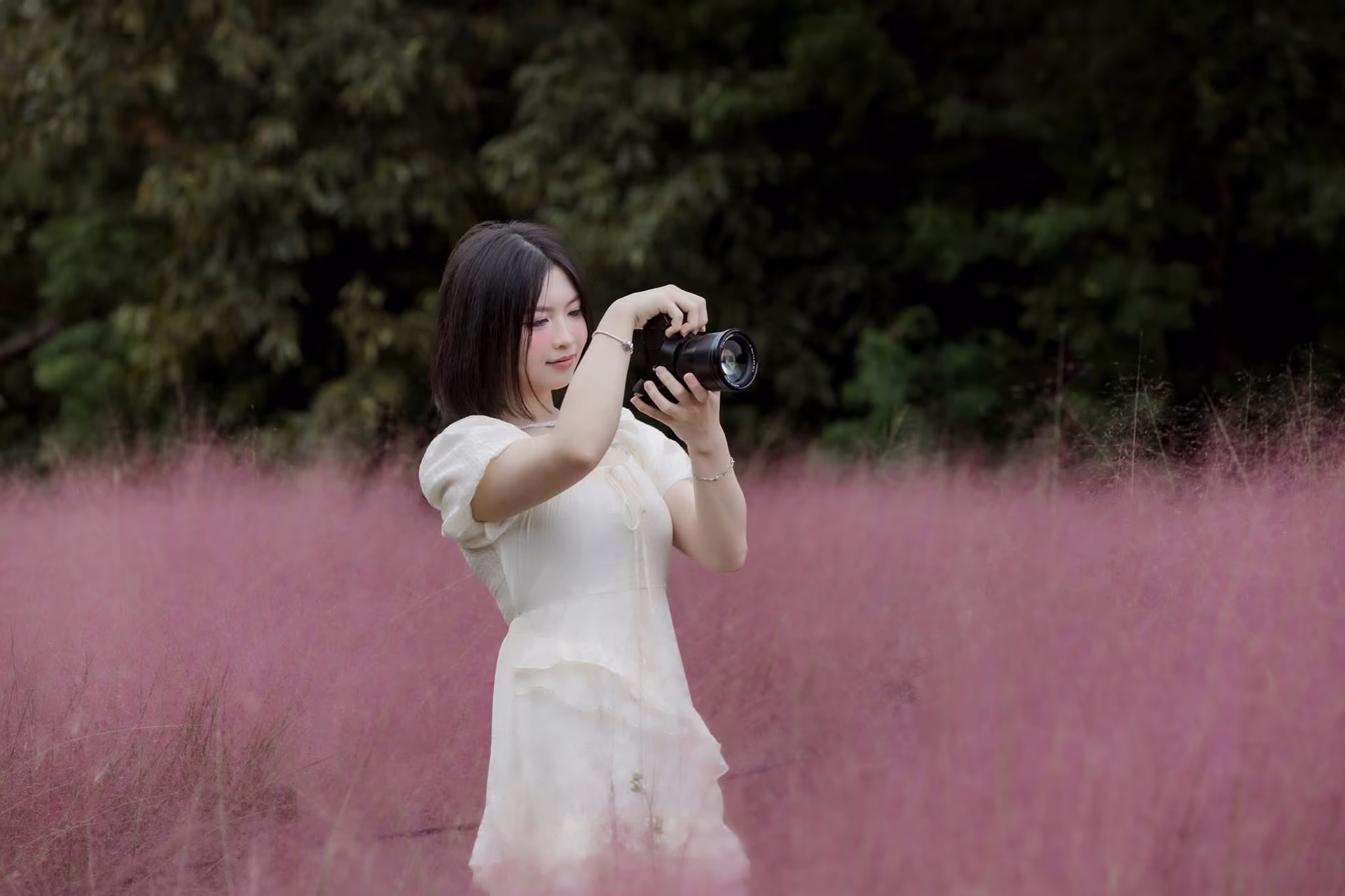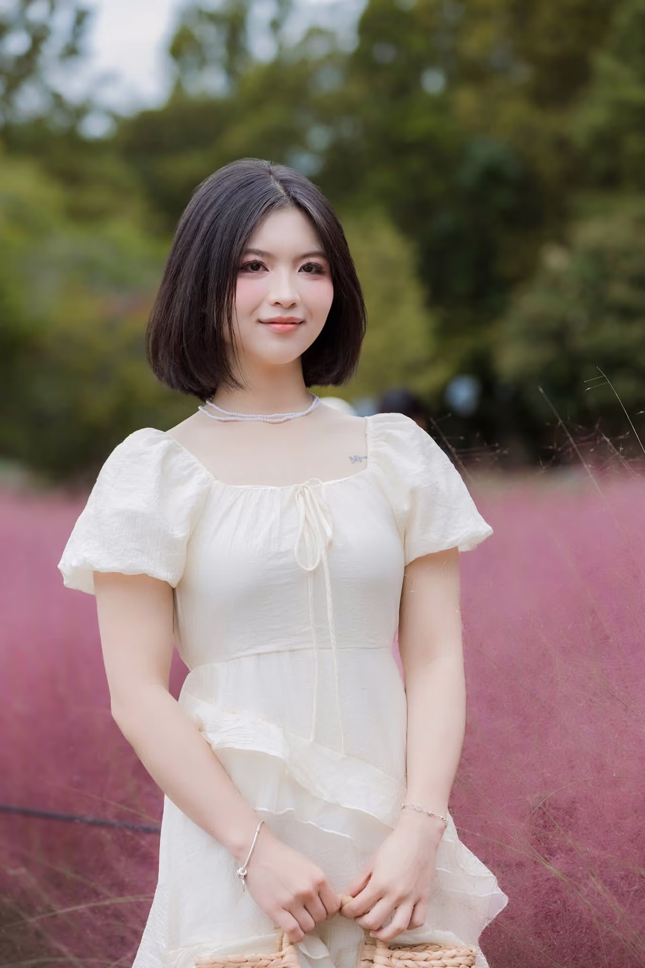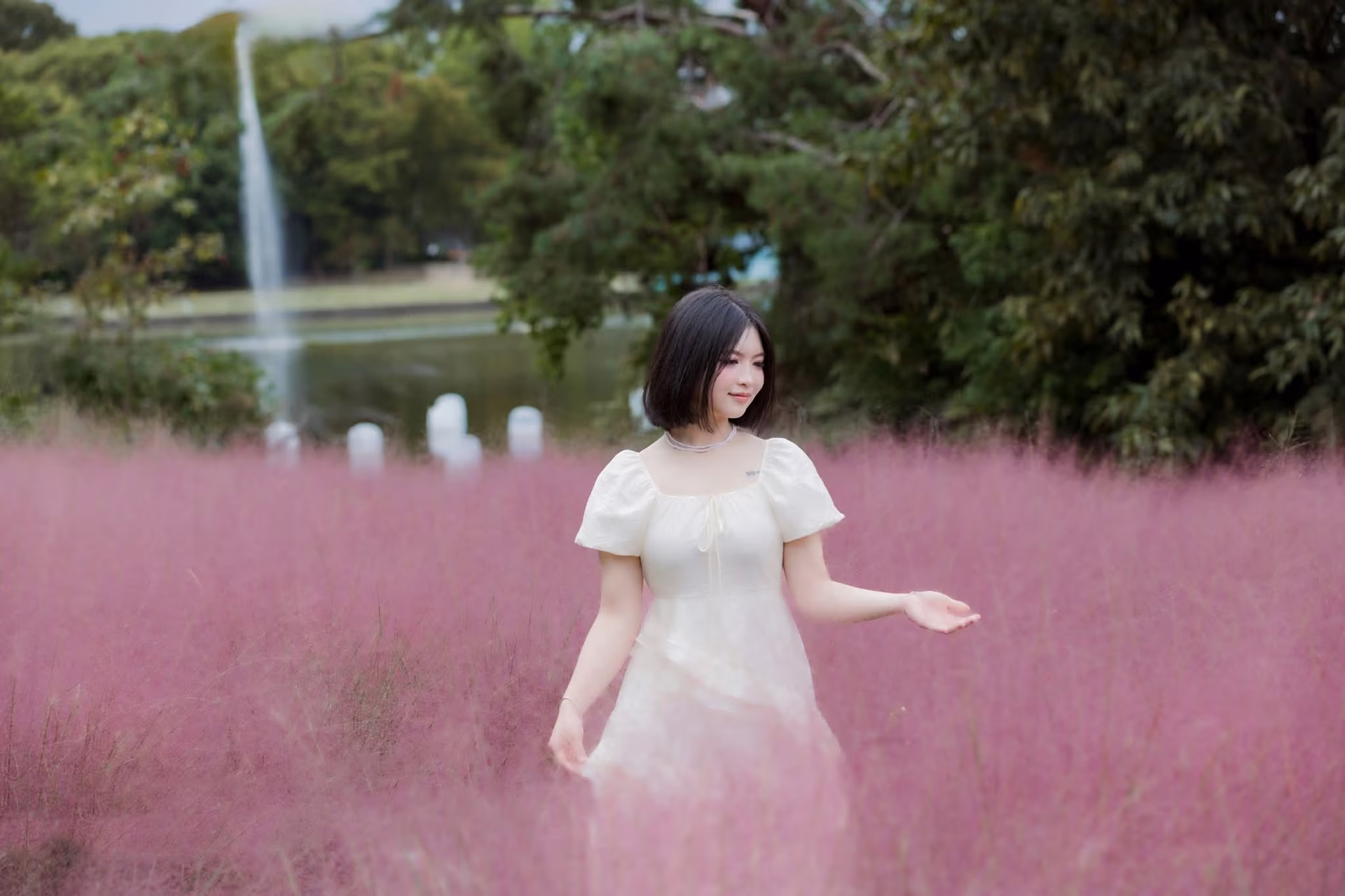 In this captivating image XVG No.33 a young woman with elegant short dark hair graces a breathtaking field of fluffy pink grass. Dressed in a pristine white ethereal dress with a flowing design she embodies a poetic beauty. The soft sunlight gently illuminates her delicate and graceful presence. The sprawling pink grass field resembling a silky carpet creates a romantic and dreamy backdrop. Her gentle stroll with a subtle hand gesture amidst this beautiful nature evokes a sense of peace and tranquility. This photograph is more than just a captured moment it is a perfect fusion of human elegance and the wondrous magic of creation offering an indescribably uplifting feeling. A truly picturesque and inspiring natural scene.