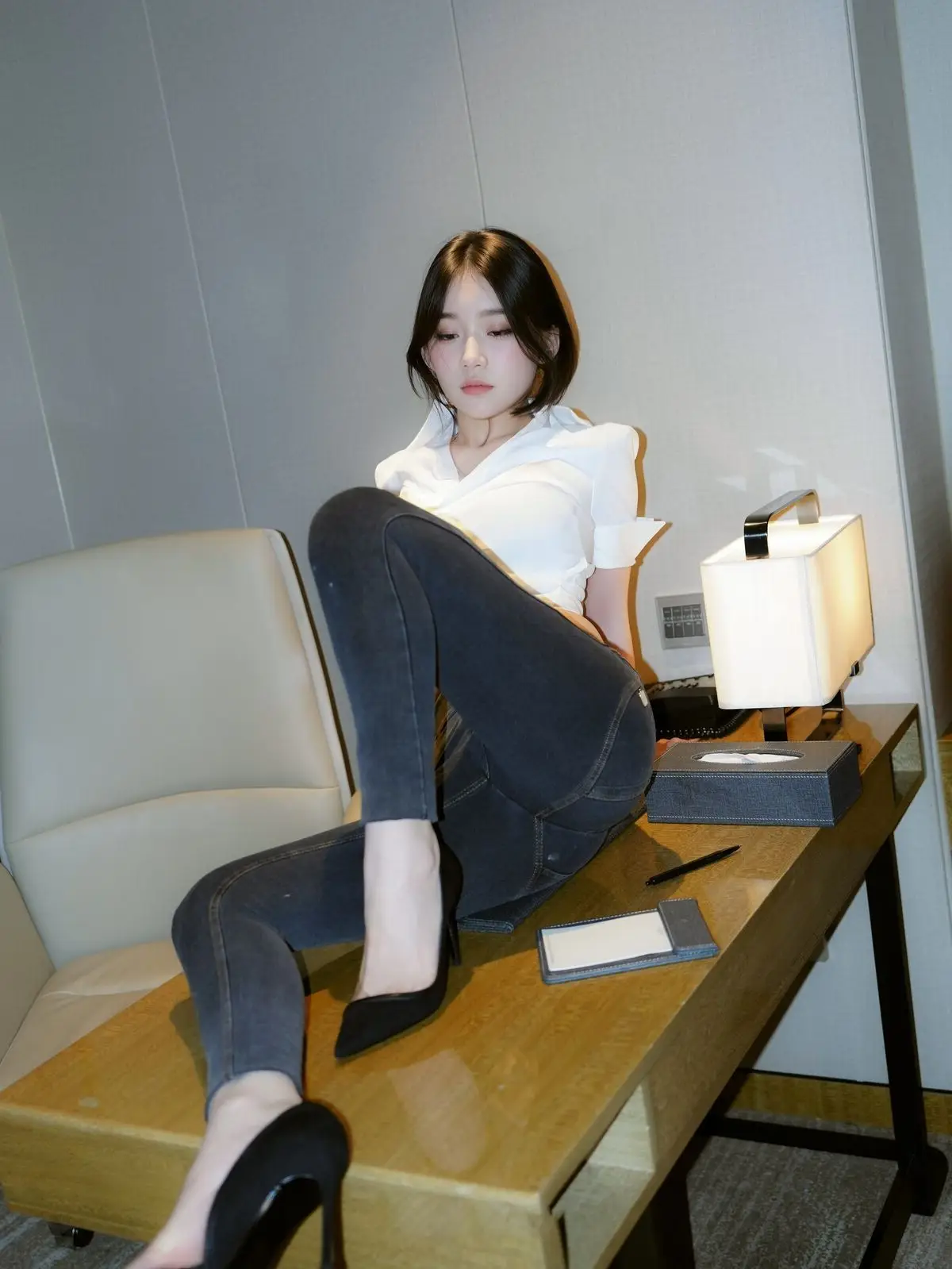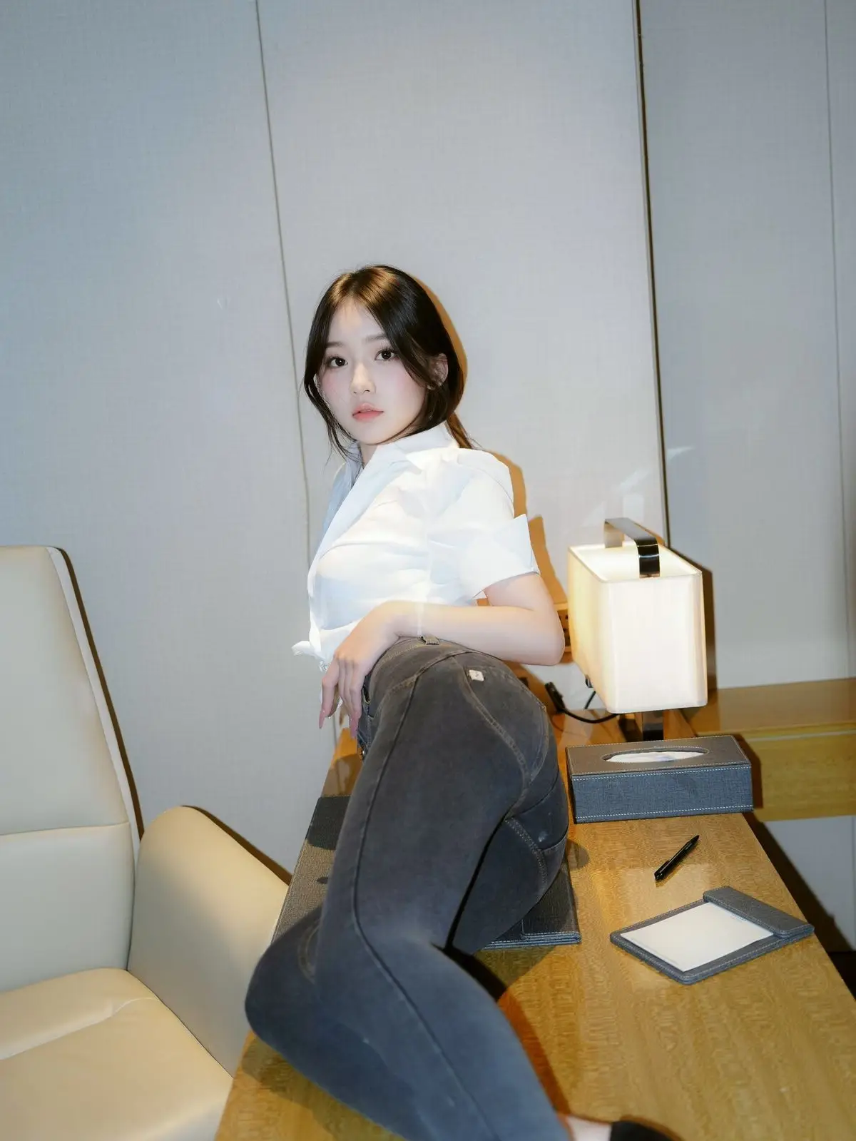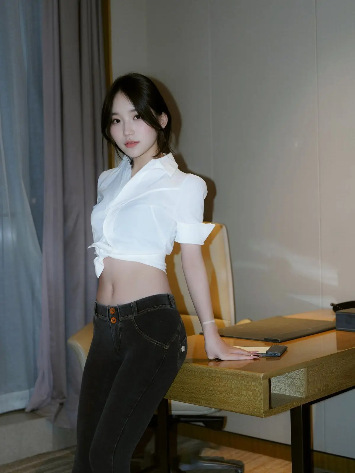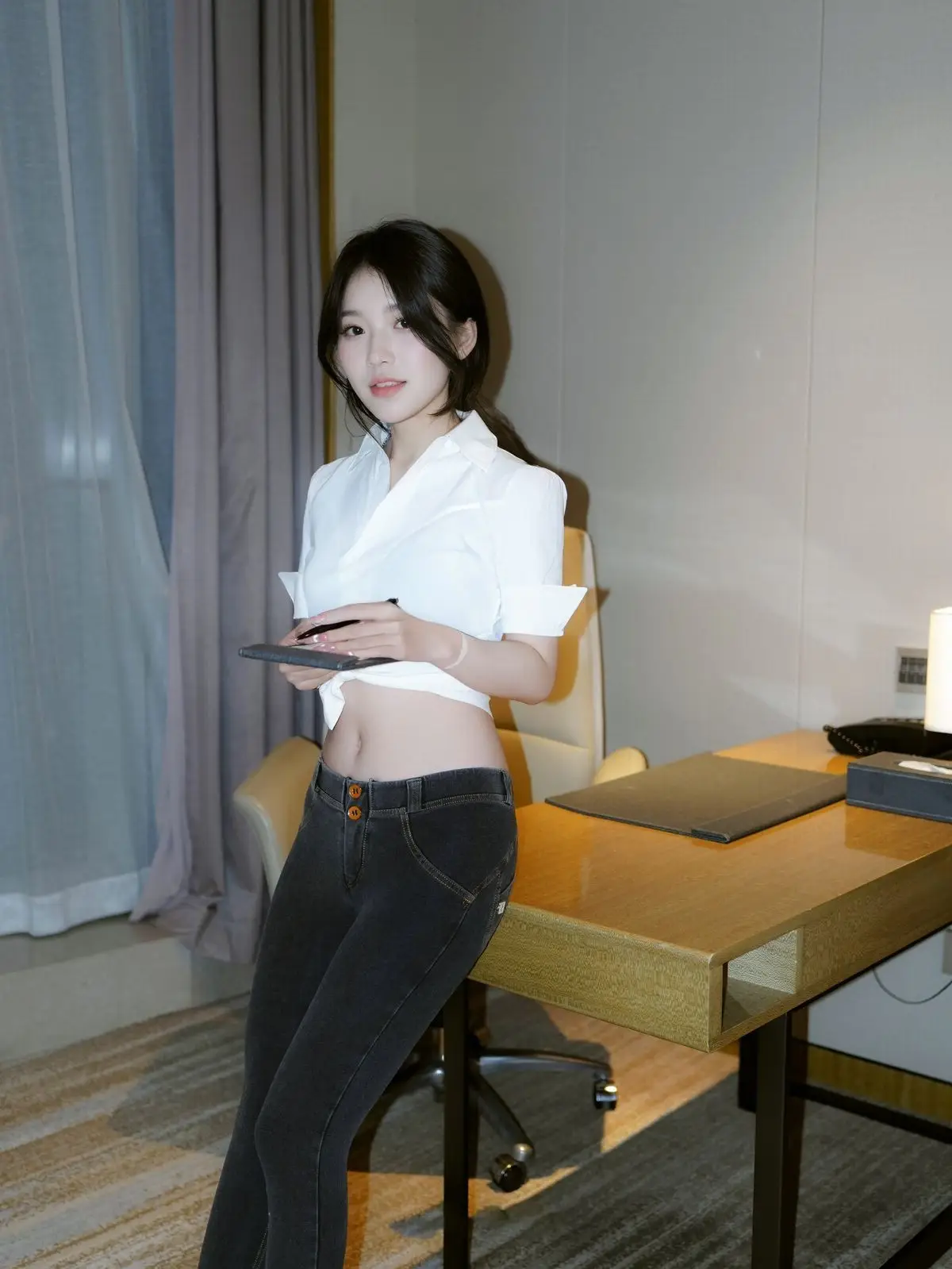 This stunning image focuses on Zhi Zhi, a captivating XiuRen intern secretary, exuding both professionalism and allure in her workspace. She is elegantly dressed in a white crop top shirt, paired with dark trousers and black high heels, accentuating her slender figure and modern fashion sense. Zhi Zhi’s confident pose at the desk, her engaging gaze, and a subtle smile convey an irresistible charm. She not only embodies a diligent secretary but also showcases a confident and subtly sensual presence. The photograph skillfully balances office elegance with personal appeal, inviting viewers to discover more about the beautiful Zhi Zhi.#ZhiZhi #InternSecretary #XiuRen #OfficeFashion #AlluringModel #OfficeLady #OL #jean