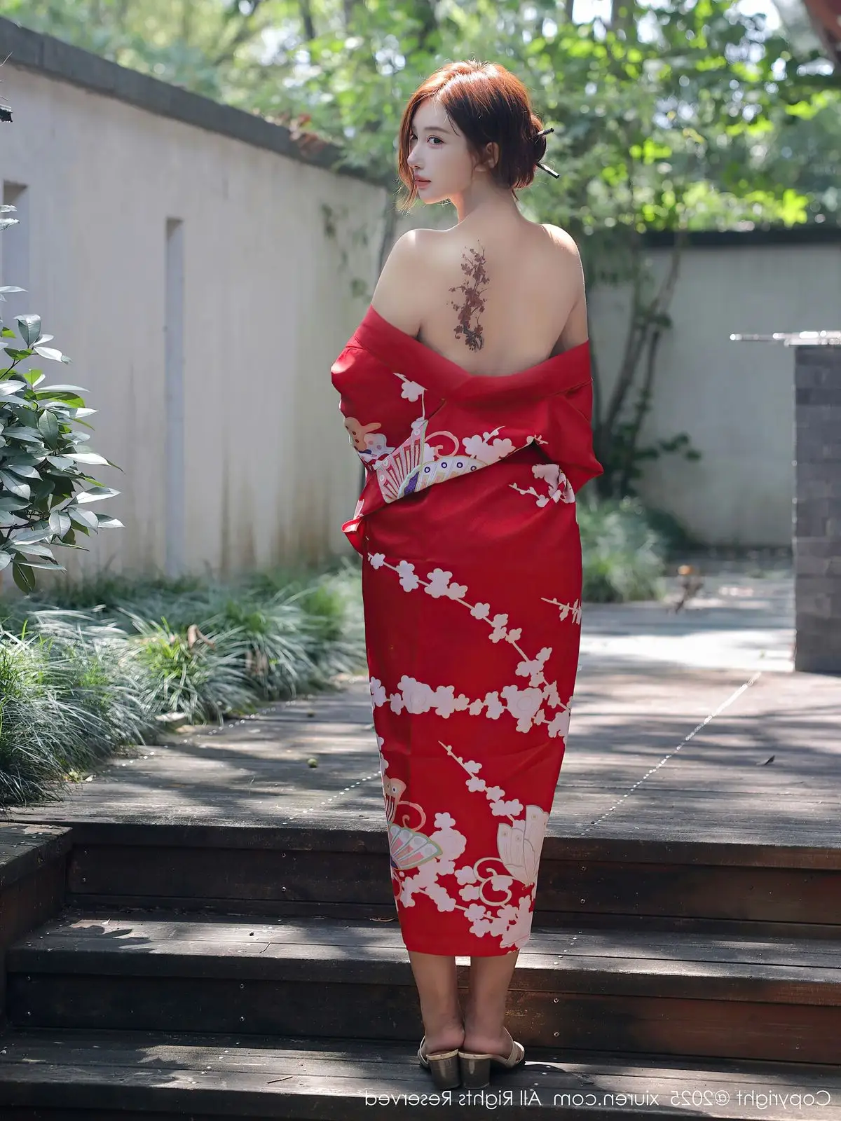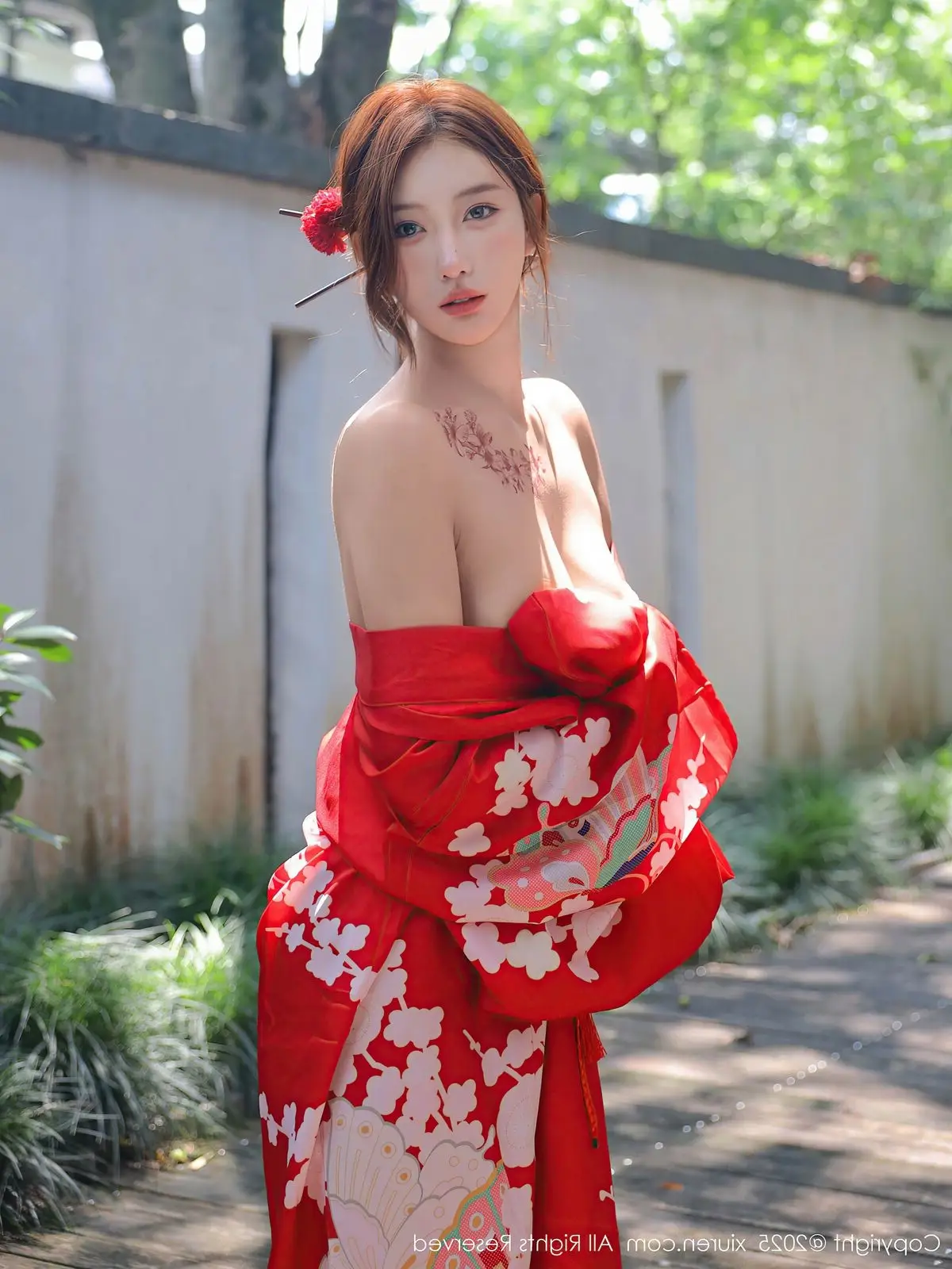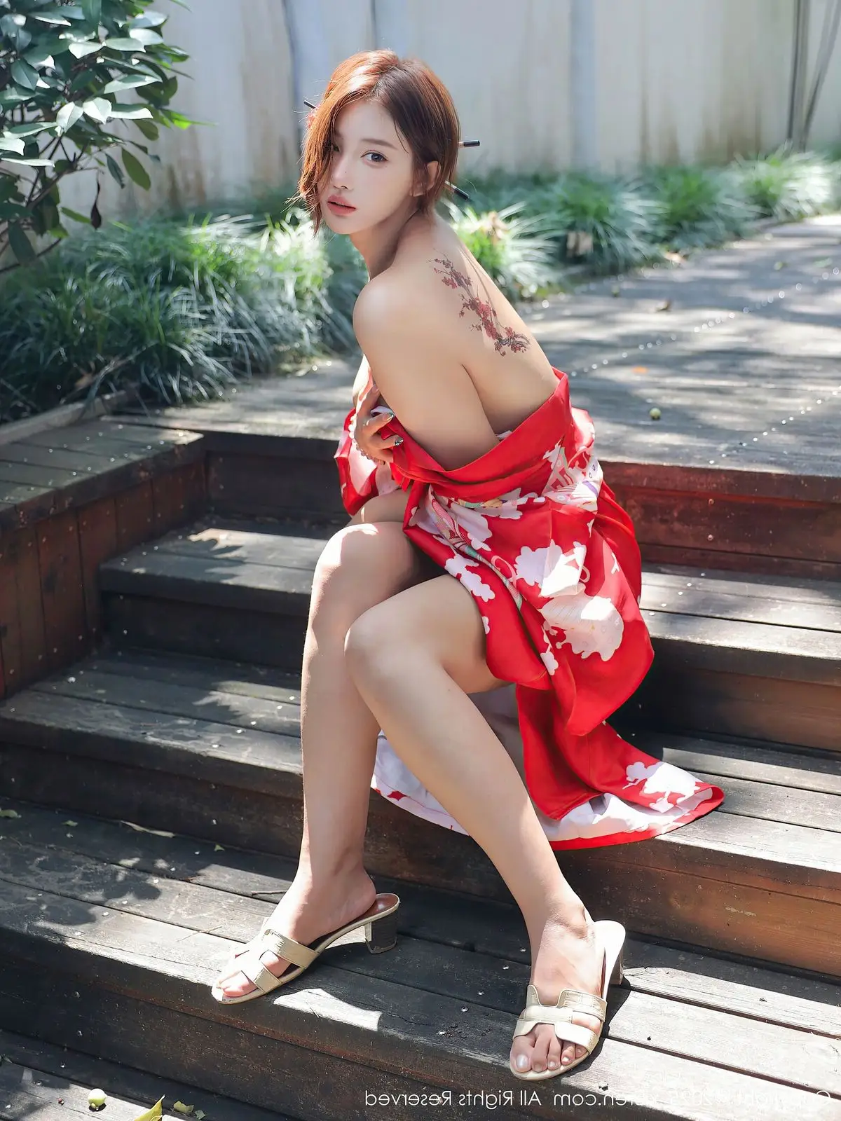 Jin Yun Xi Yuki radiates brilliantly in a traditional red kimono, yet styled with captivating allure. The striking red hue, adorned with delicate white floral patterns, highlights her graceful and elegant beauty. The kimono is artfully draped, revealing alluring bare shoulders, creating a harmonious blend of classic charm and modern appeal. Jin Yun Xi Yuki’s captivating gaze and confident demeanor make it impossible for viewers to look away. She stands on wooden steps amidst a lush green setting, forming a picturesque and enchanting scene. This is not merely a fashion photograph but a sophisticated expression of East Asian beauty, exuding an irresistible charm.#JinYun #XiYuki #RedKimono #AsianBeauty #XiuRenNo10683 #SeductiveFashion