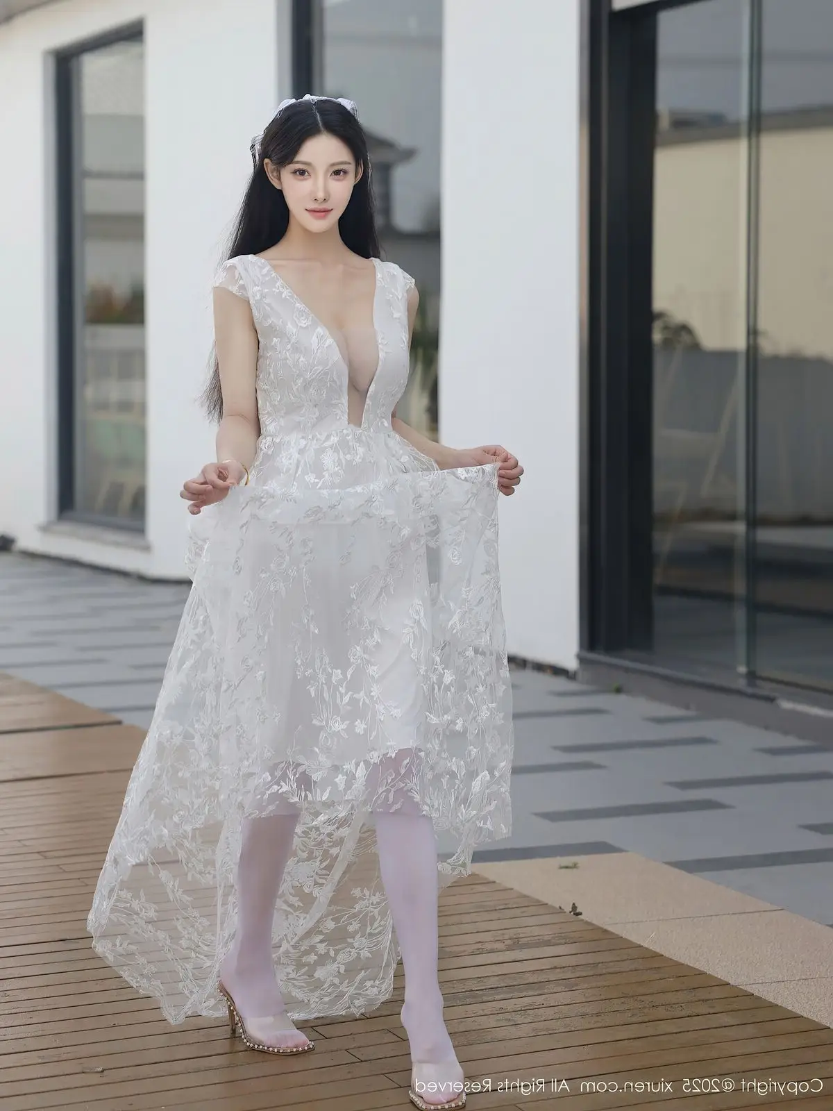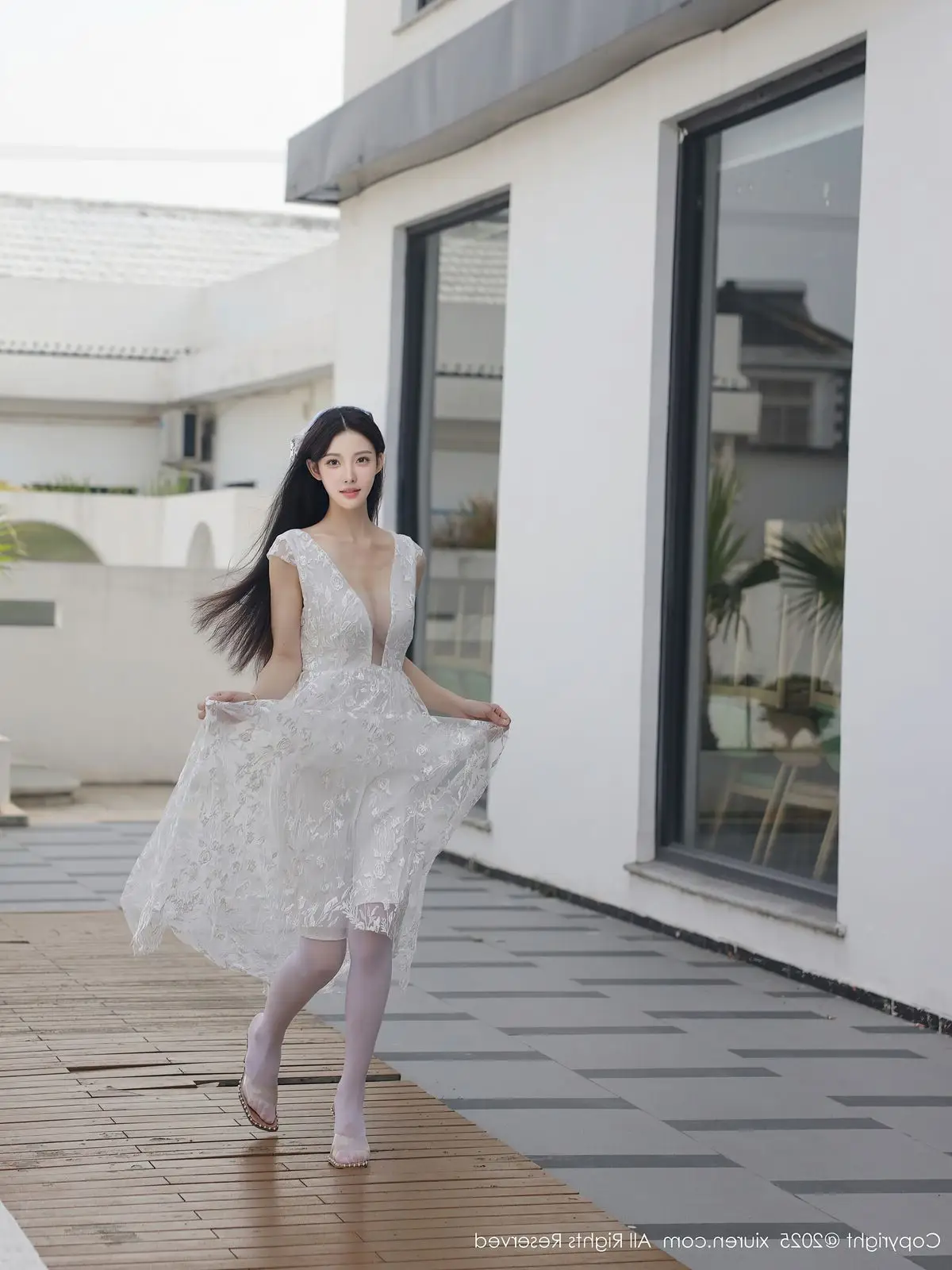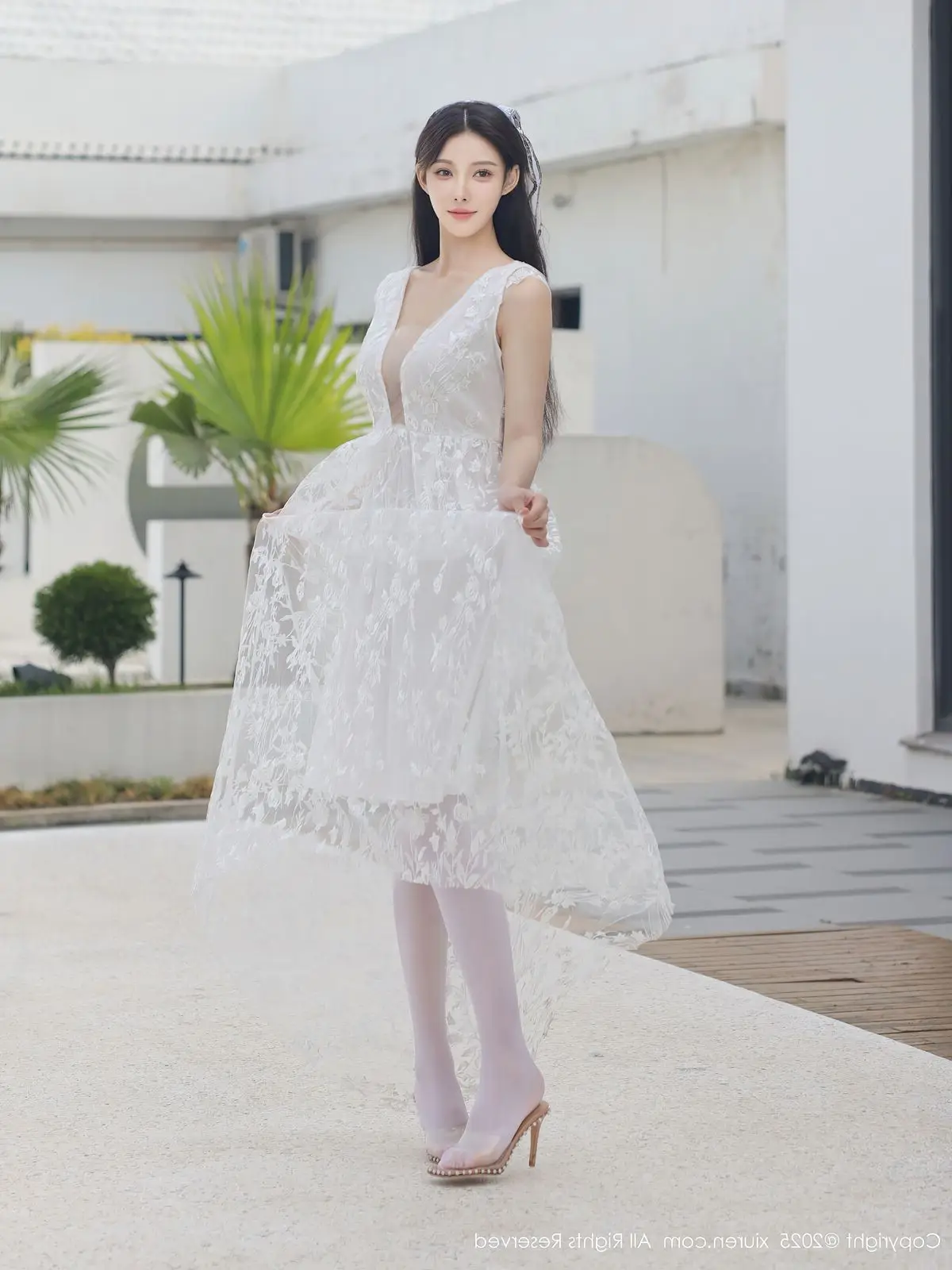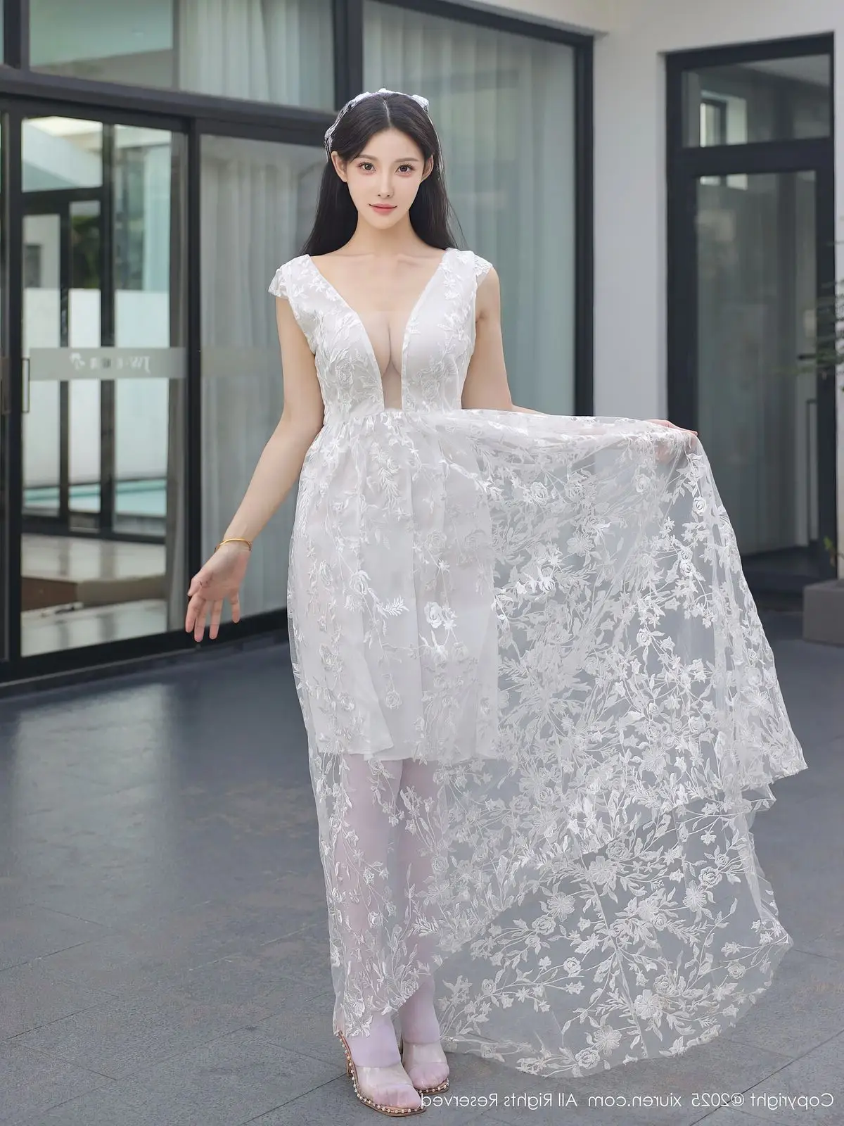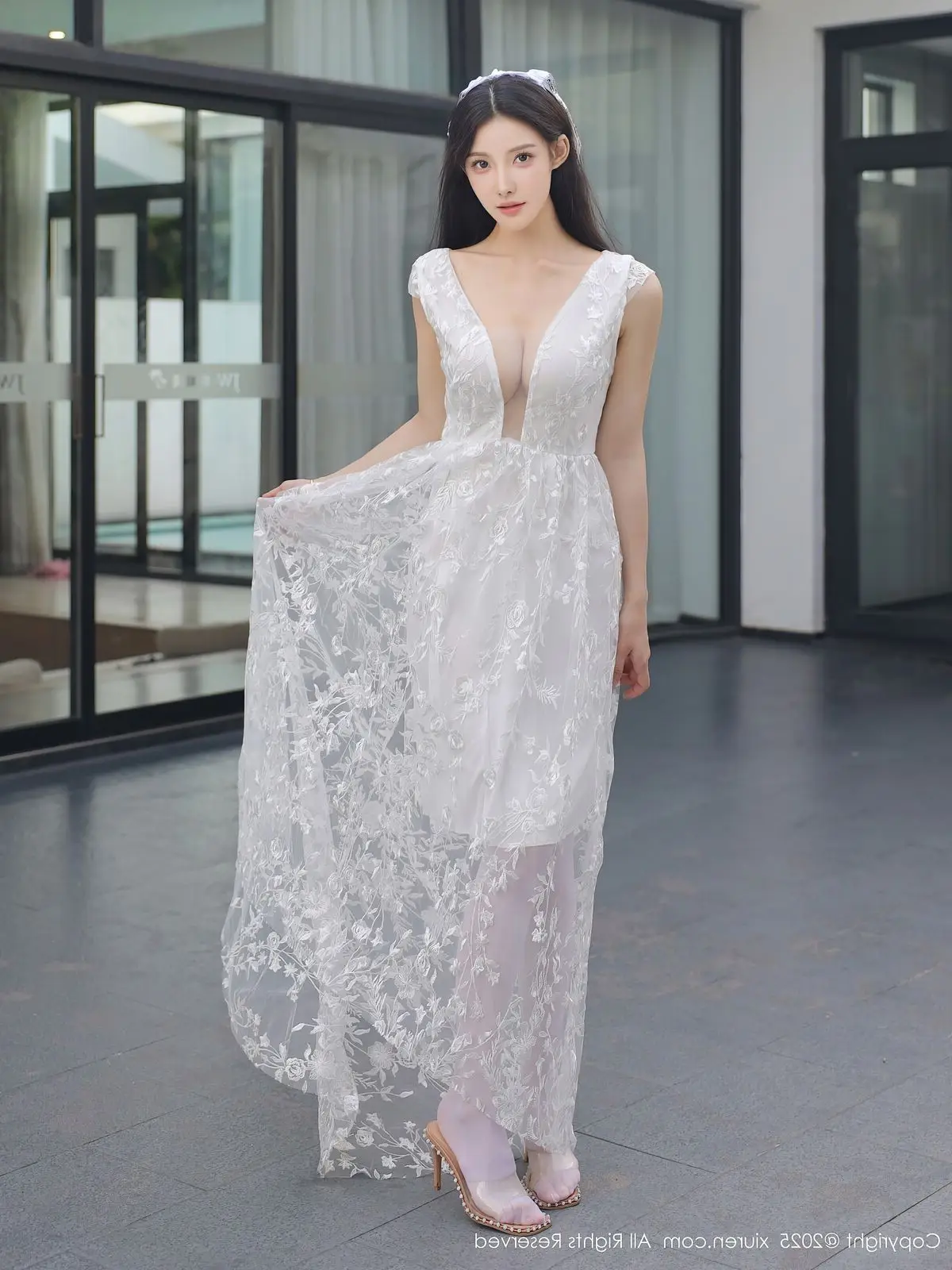 In this captivating XiuRen No.10661 collection model Li Shuang Er showcases her enchanting presence. She gracefully poses in a pristine white gown featuring an alluring design and delicate lace fabric. The flowing dress billows with her every step creating an elegant and refined silhouette. Li Shuang Er's long dark hair gently sways in the breeze highlighting her delicate features and an expressive gaze that draws viewers in. Against a backdrop of modern white architecture and reflective glass her pure beauty truly shines. This harmonious blend of fashion poise and setting crafts an enchanting visual narrative embodying Li Shuang Er's unique blend of allure and sophistication.#LiShuangEr #XiuRenNo10661 #SexyWhiteDress #ElegantModel #AlluringStyle