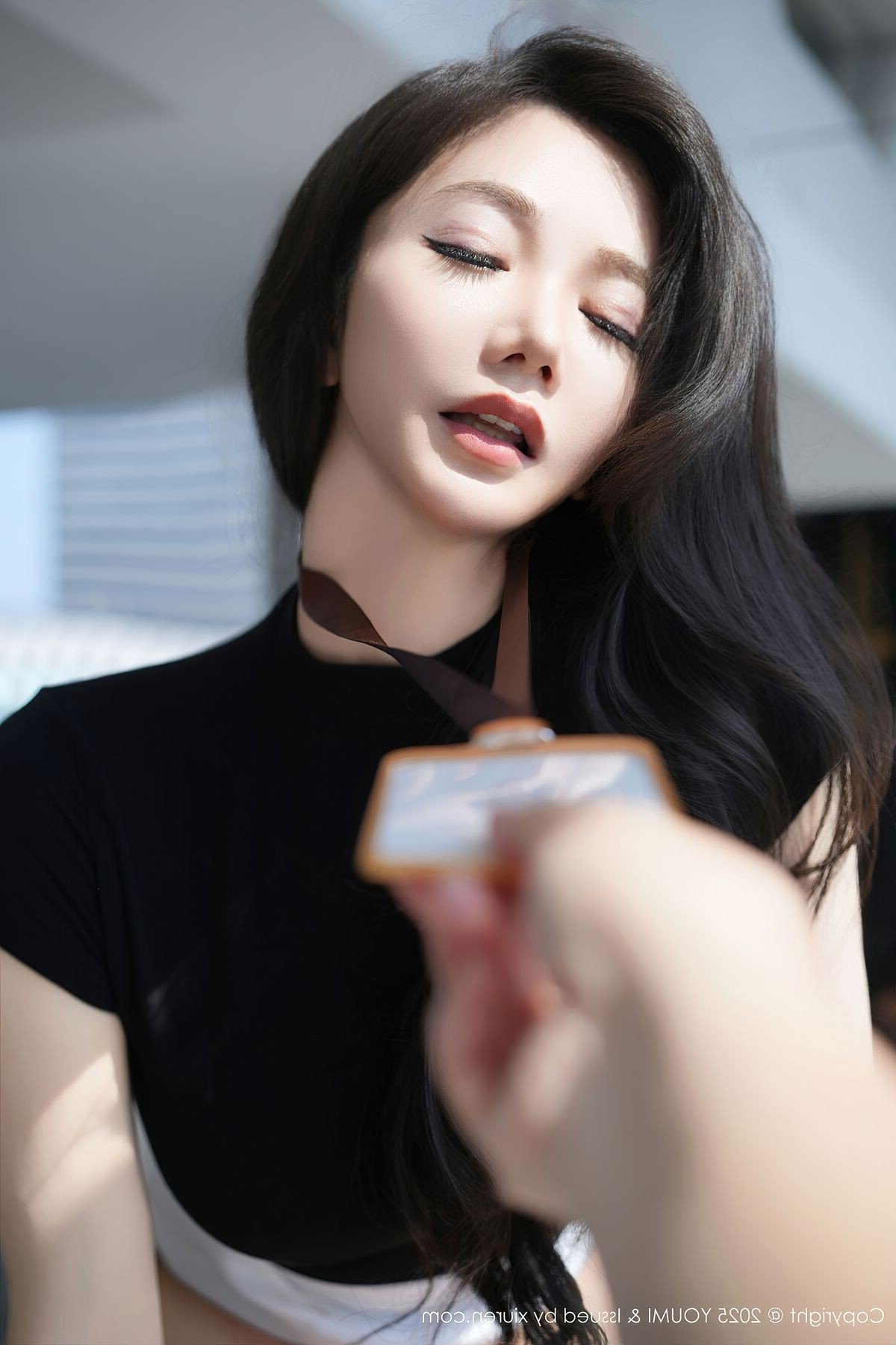 This captivating image showcases the stunning Chinese model Li Yan Xi from the YouMi Vol.1144 collection. She exudes confidence and alluring charm in a sophisticated office-inspired ensemble. Her figure is gracefully highlighted by a form-fitting black top paired with a chic white mini skirt, accentuating her slender physique and long elegant legs. Posing with professional poise, Li Yan Xi embodies modern elegance blended with a subtle sensuality. The backdrop of a large window offering a blurred city view and natural light further enhances her luxurious appeal. Li Yan Xi truly stands out as a charming Chinese model, presenting an irresistibly stylish and high-class fashion statement.Stories