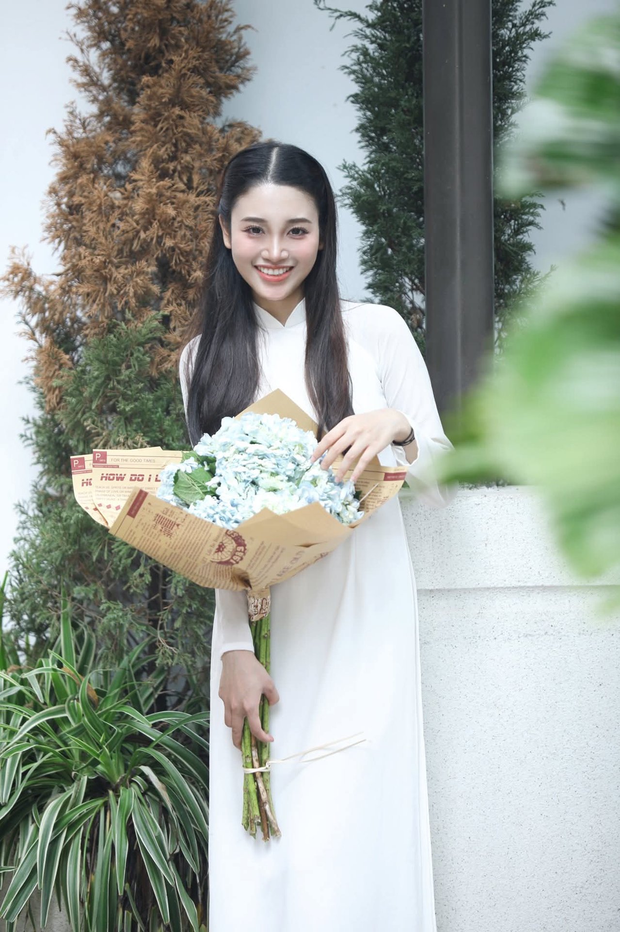 This image captures a serene and emotional moment of a graceful Vietnamese girl in a pristine white Ao Dai. She exudes gentle, elegant beauty with her flowing long hair and soft smile, captivating every gaze. The traditional Ao Dai, flowing gracefully, accentuates her slender, delicate figure, affirming the beauty of Vietnamese culture. In her hands, she holds a bouquet of pure white baby's breath flowers, symbolizing purity and innocent love, further highlighting her fresh, natural youthful charm. The corridor setting with soft golden sunlight adds to the romantic ambiance, creating a harmonious picture rich in Asian aesthetics. This image represents the timeless beauty of Vietnamese women, a perfect blend of tradition and freshness.