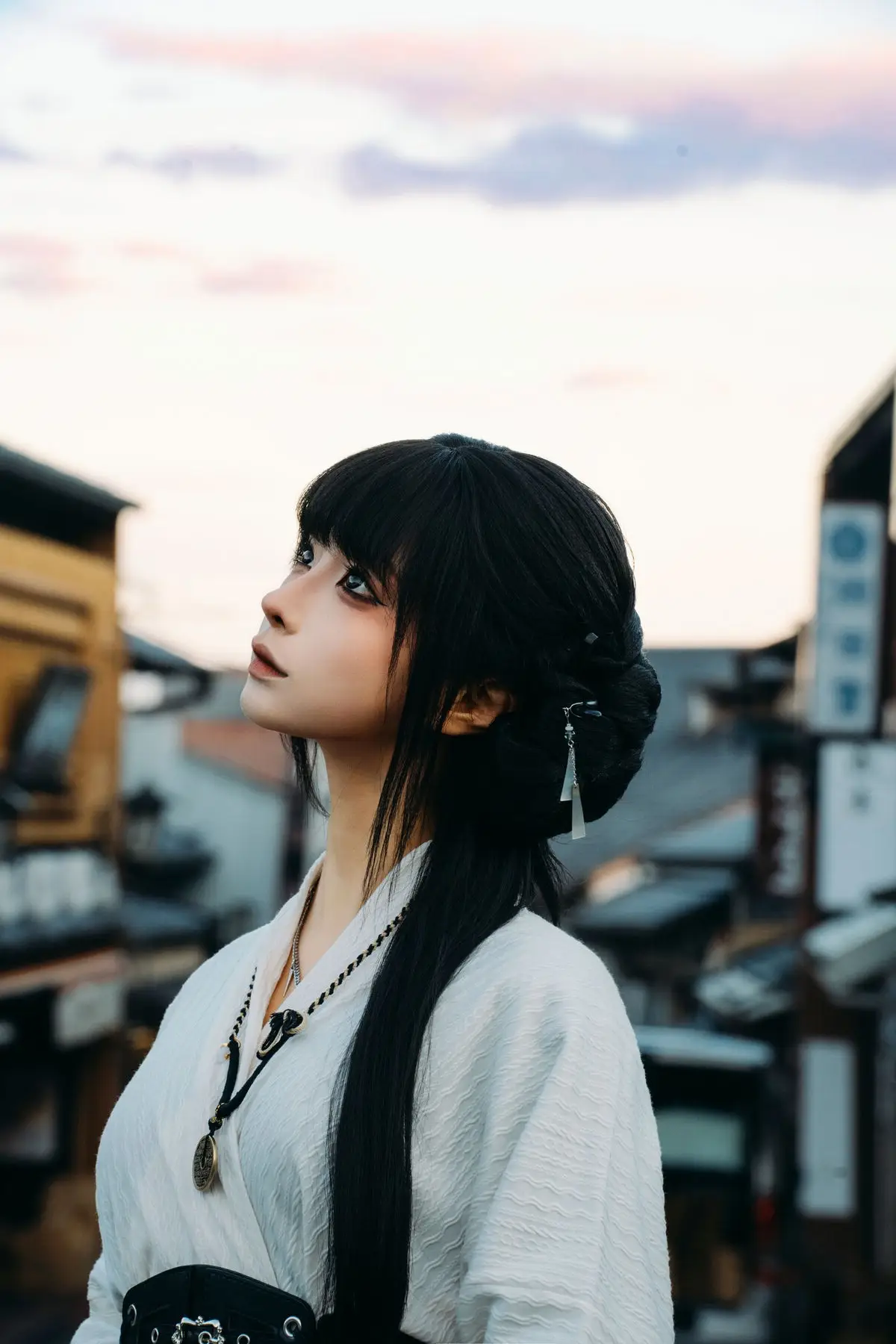 In the captivating photo series Autumn Quest Part04 Coser Chunmomo emanates an alluring beauty and unique style. Her platinum blonde hair paired with a chic black beret creates a striking focal point against the urban street backdrop. Her deep gaze and subtle expression seem to narrate a mysterious autumn tale. Gentle golden sunlight filters through the bamboo screen casting a romantic and nostalgic ambiance. Every detail from her outfit to her pose showcases Chunmomo's professionalism and refined aesthetic. This collection is more than just a character portrayal it is an artistic endeavor conveying profound autumn emotions.