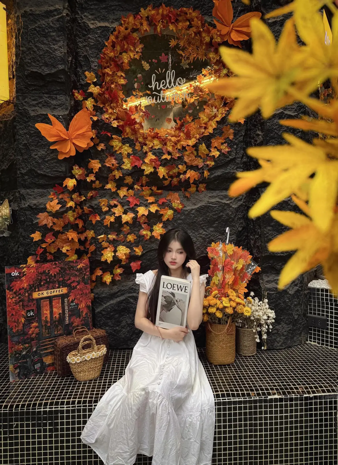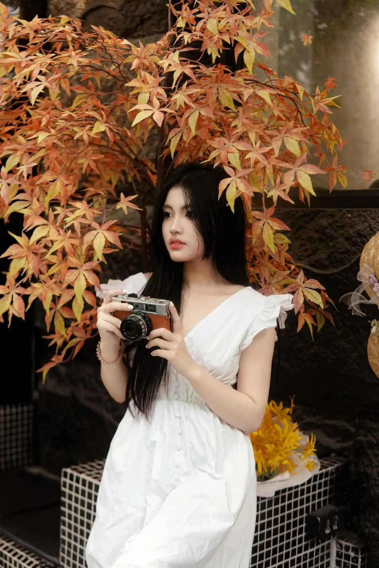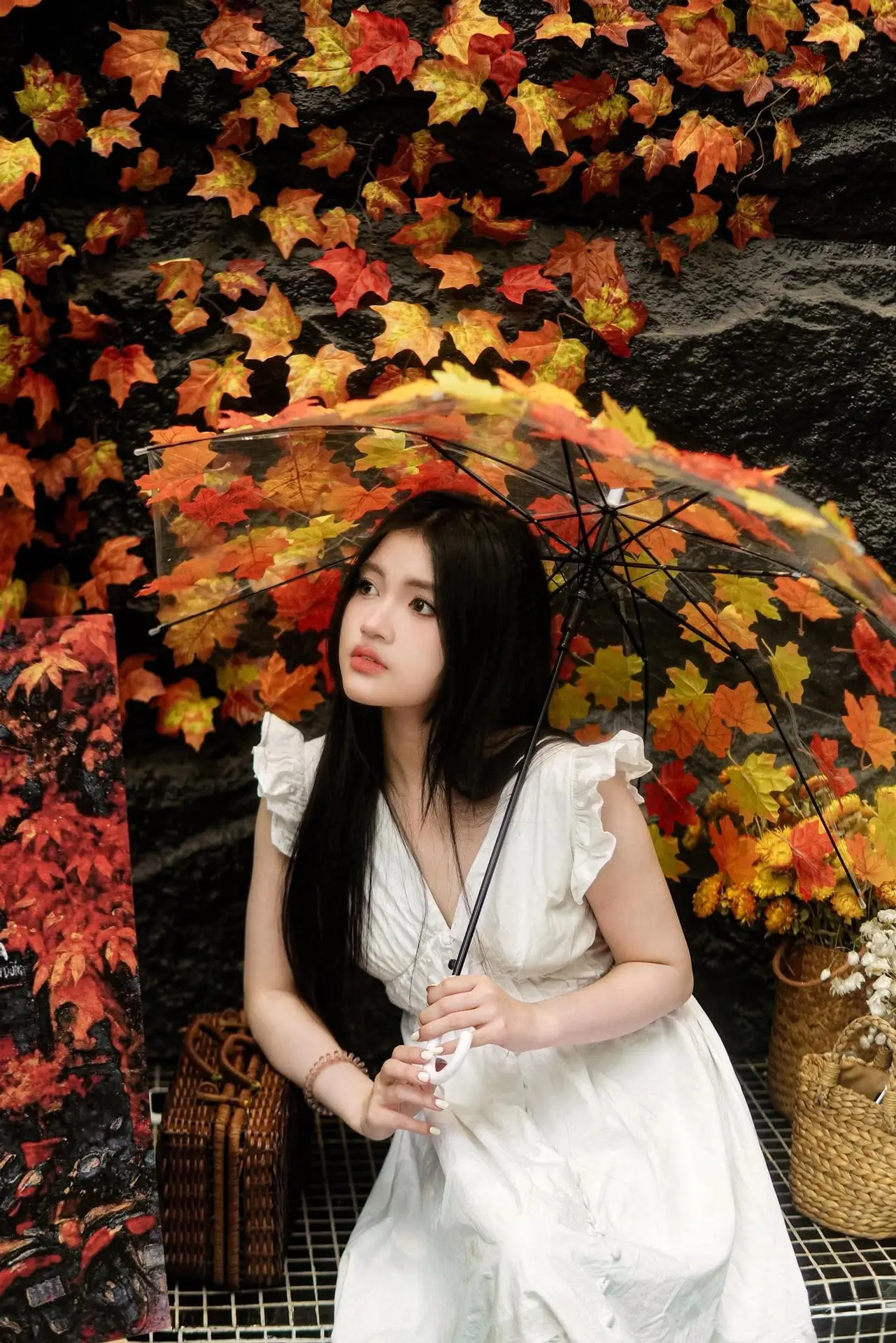 This VGU No.169 image captures a poetic and gentle autumn moment The central figure is a young woman with serene Asian beauty her dark hair flowing dressed in a pristine white gown that creates a harmonious contrast with the warm hues of her surroundings She delicately holds a basket brimming with vibrant yellow chrysanthemums symbols of luck and joy Behind her a backdrop of fiery red and orange maple leaves forms a vivid artistic tapestry further emphasized by the painting on the easel highlighting the romantic autumn theme The entire scene exudes a subtle melancholy yet profound poetic quality inviting viewers to contemplate fragile beauty and the passage of time This is a refined piece of photographic art capturing a peaceful and reflective moment