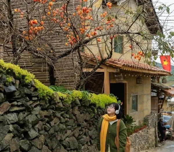 A traveler is immersed in the tranquil atmosphere of Lolo Chai village, where ancient rammed earth houses stand out, especially the heavily laden persimmon tree. This persimmon tree, though poetically called the 'world's most enduring' due to its unique appearance, has become a captivating focal point. The rustic scenery, with moss-covered stone walls and serene yin-yang tiled roofs, paints a poetic picture. More than just a highland check-in spot, it's a place where visitors deeply experience the cultural beauty and simple charm of the Lolo people. In late autumn, when vibrant red persimmons ripen, Lolo Chai beckons travelers to explore and cherish unforgettable moments in the heart of Ha Giang.