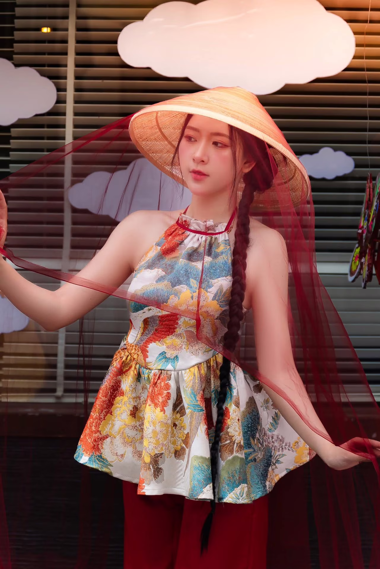 This captivating image beautifully captures the gentle charm and grace of a Vietnamese woman. The young lady with her radiant smile and clear eyes wears a modern interpretation of the traditional Áo Yếm paired with a vibrant patterned skirt blending heritage with contemporary style. An iconic Nón Lá the quintessential Vietnamese conical hat gracefully adorns her head accentuating her delicate features and cultural pride. Her long lustrous hair is neatly styled into a classic braid enhancing her elegant and demure appearance. More than just a portrait this photograph celebrates the timeless beauty of Vietnamese culture showcasing a harmonious fusion of tradition and modern aesthetics. This graceful portrayal is sure to enchant anyone captivated by Asian culture and its profound beauty. #Vietnamese #pretty #charmStories