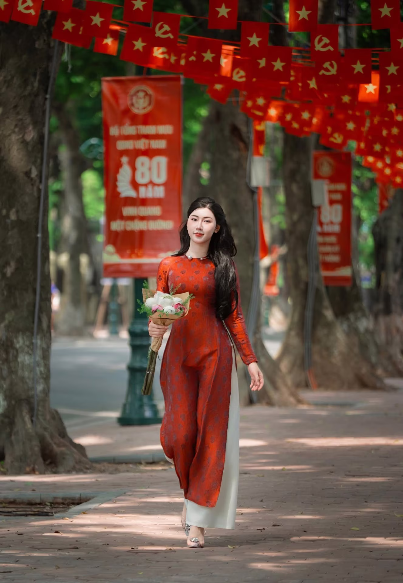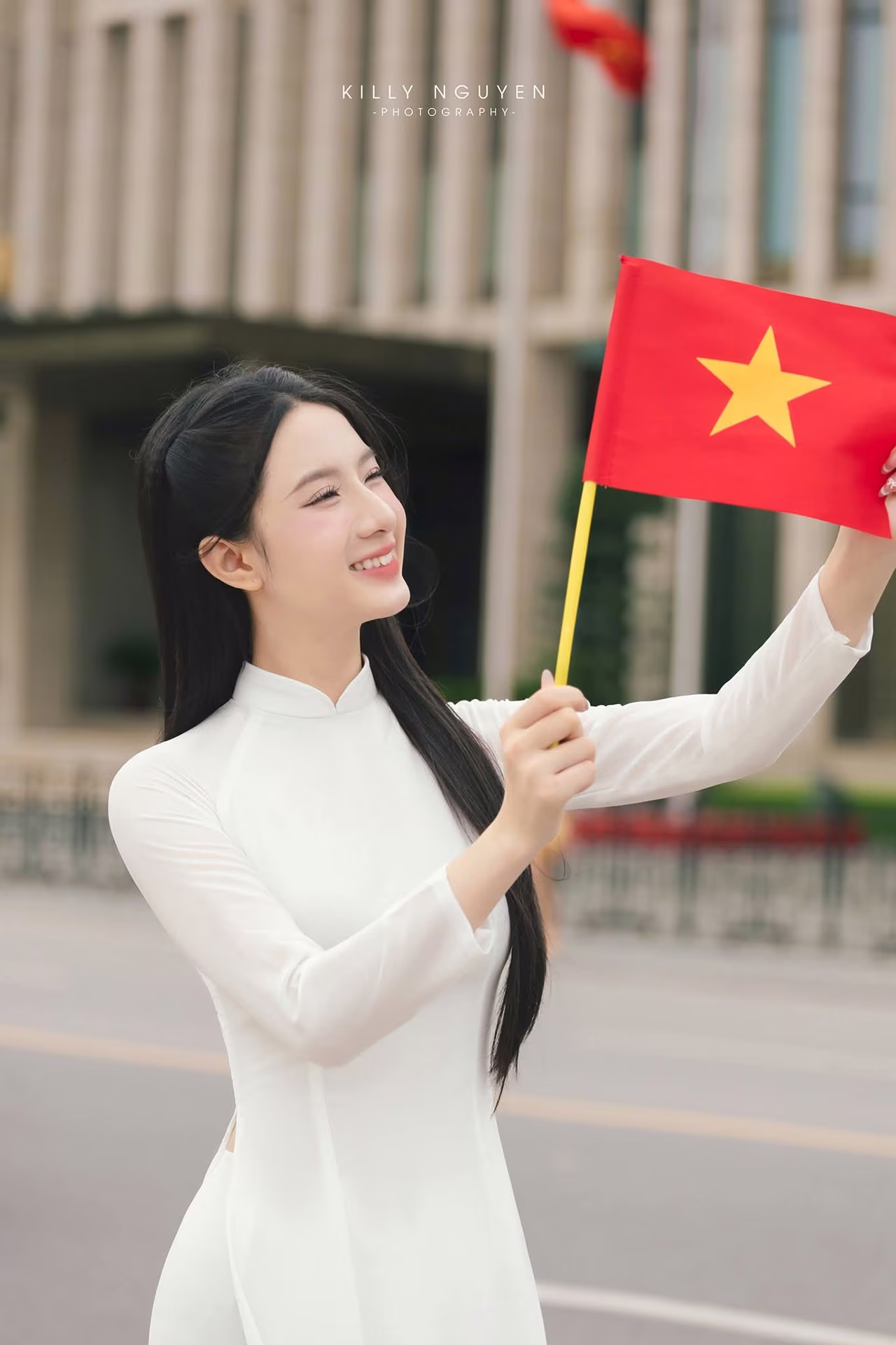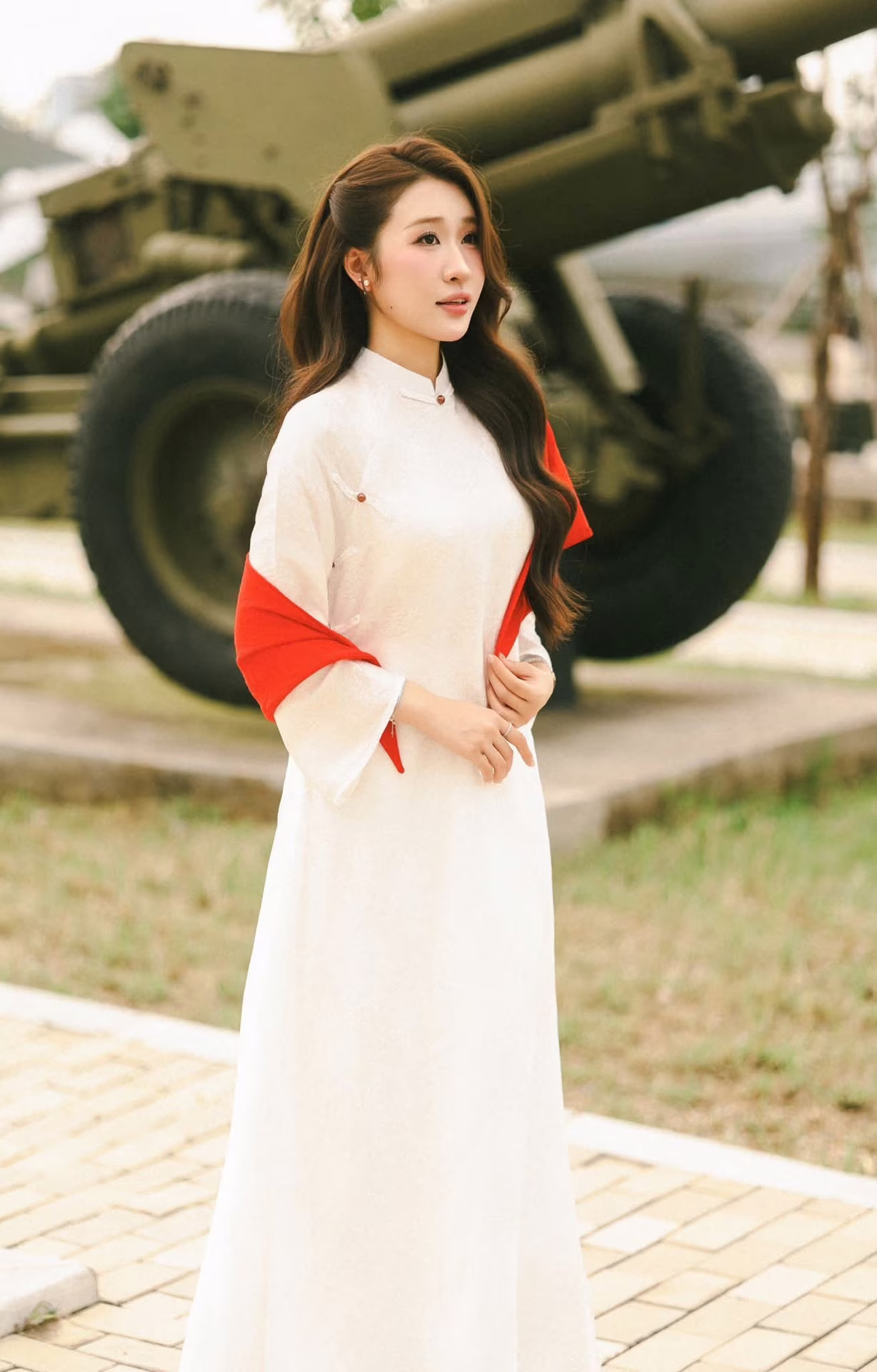 In image VGU No.105, a beautiful Vietnamese girl appears gracefully in a vibrant yellow Áo Dài, captivating all eyes. This traditional attire not only highlights her slender figure but also expresses the gentle, modest beauty of an East Asian woman. Her long, smooth dark hair, gentle smile, and clear eyes create a pure and elegant beauty. Behind her is a modern city backdrop with tall buildings reaching for the blue sky, along with the fresh green of trees, creating an impressive harmonious blend. The image of the girl in a yellow Áo Dài in the heart of the city is not only a symbol of traditional cultural beauty but also a delicate interplay between classic charm and the breath of the times, evoking pride in Vietnamese beauty. #Vietnamese #pretty #charmVGU No.110: Elegant White Ao Dai Amidst Red Flags, Celebrating Vietnamese Grace and Patriotism.