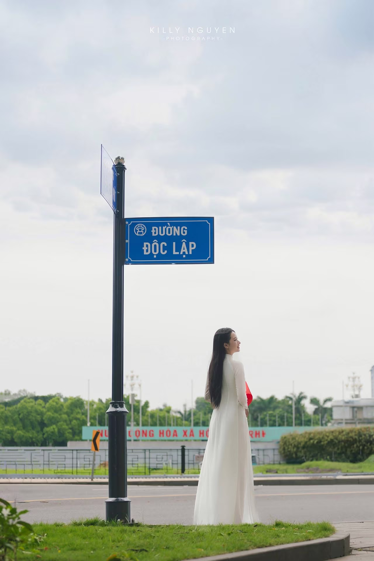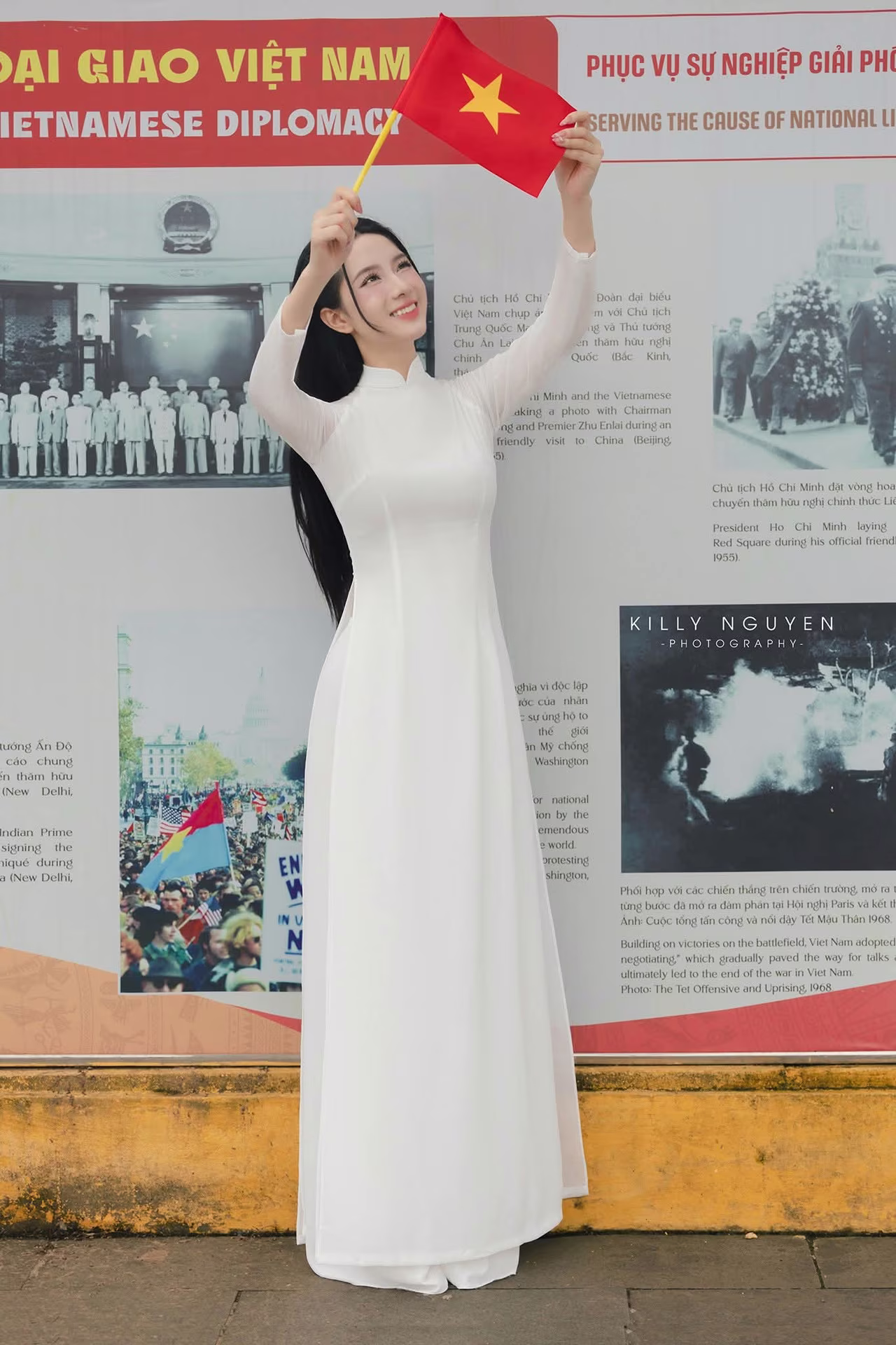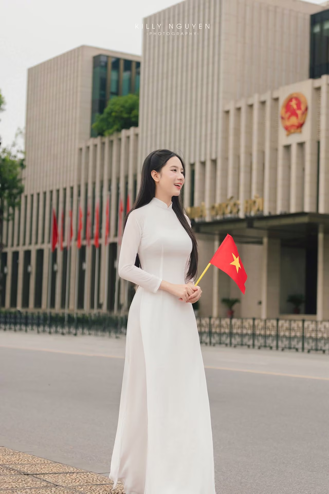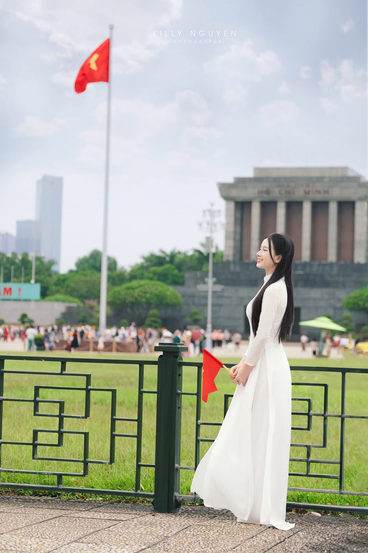 This photograph captures a serene and meaningful moment of a Vietnamese woman in a pristine white Ao Dai, standing before the majestic Ho Chi Minh Mausoleum and the proudly waving national flag. The gentle elegance of the Ao Dai harmonizes with the sacred ambiance, evoking a profound sense of pride in Vietnamese culture and history. Her gaze directed skyward conveys reverence, gratitude, and hope for the future. This is not merely an image of traditional attire but a vivid symbol of national spirit and the beautiful soul of Vietnamese women amidst the ancient capital of Hanoi. #Vietnamese #pretty #charmVGU No.116: Timeless Vietnamese Grace in Traditional Attire - Discover Cultural Beauty and Elegance
