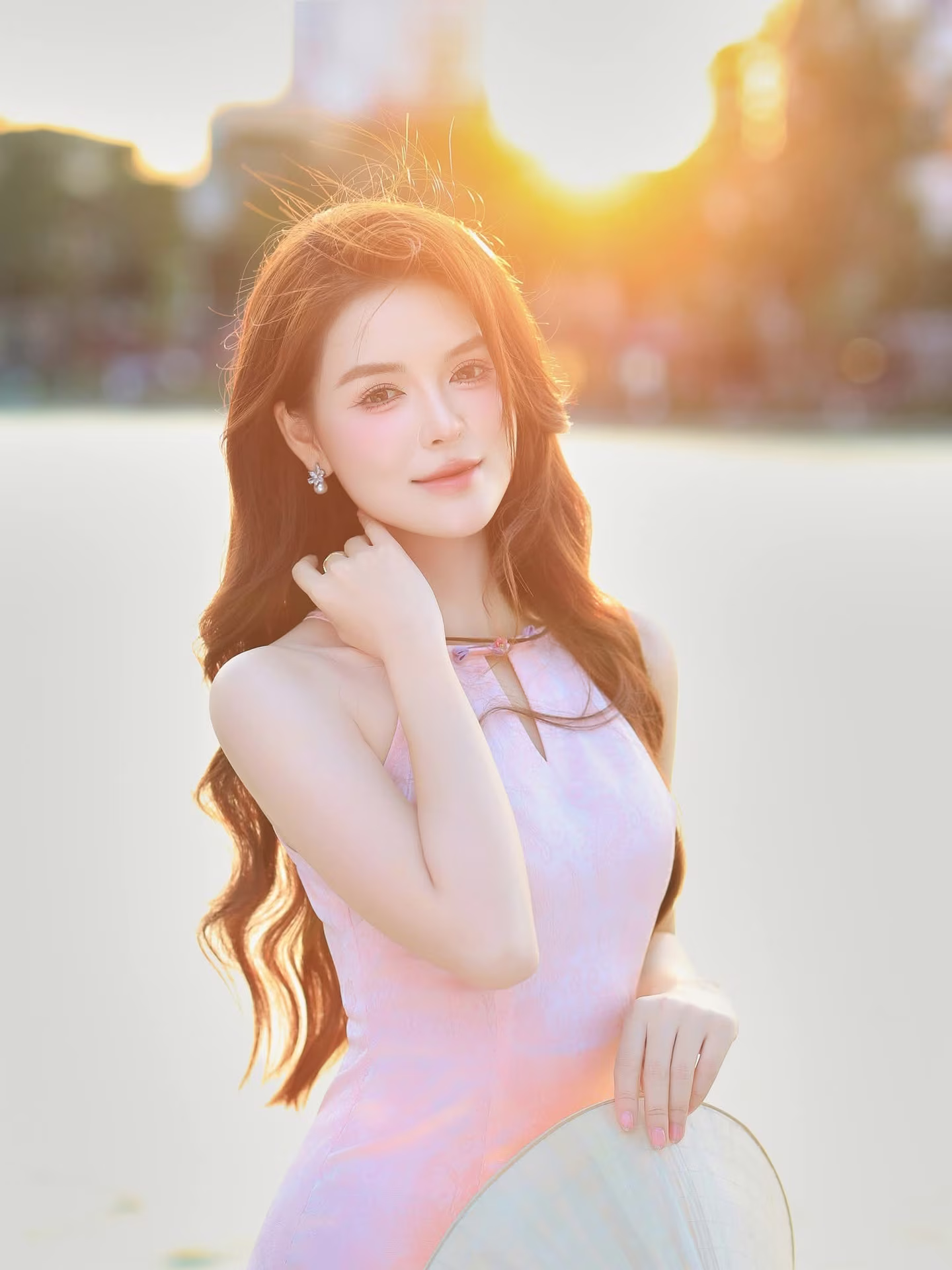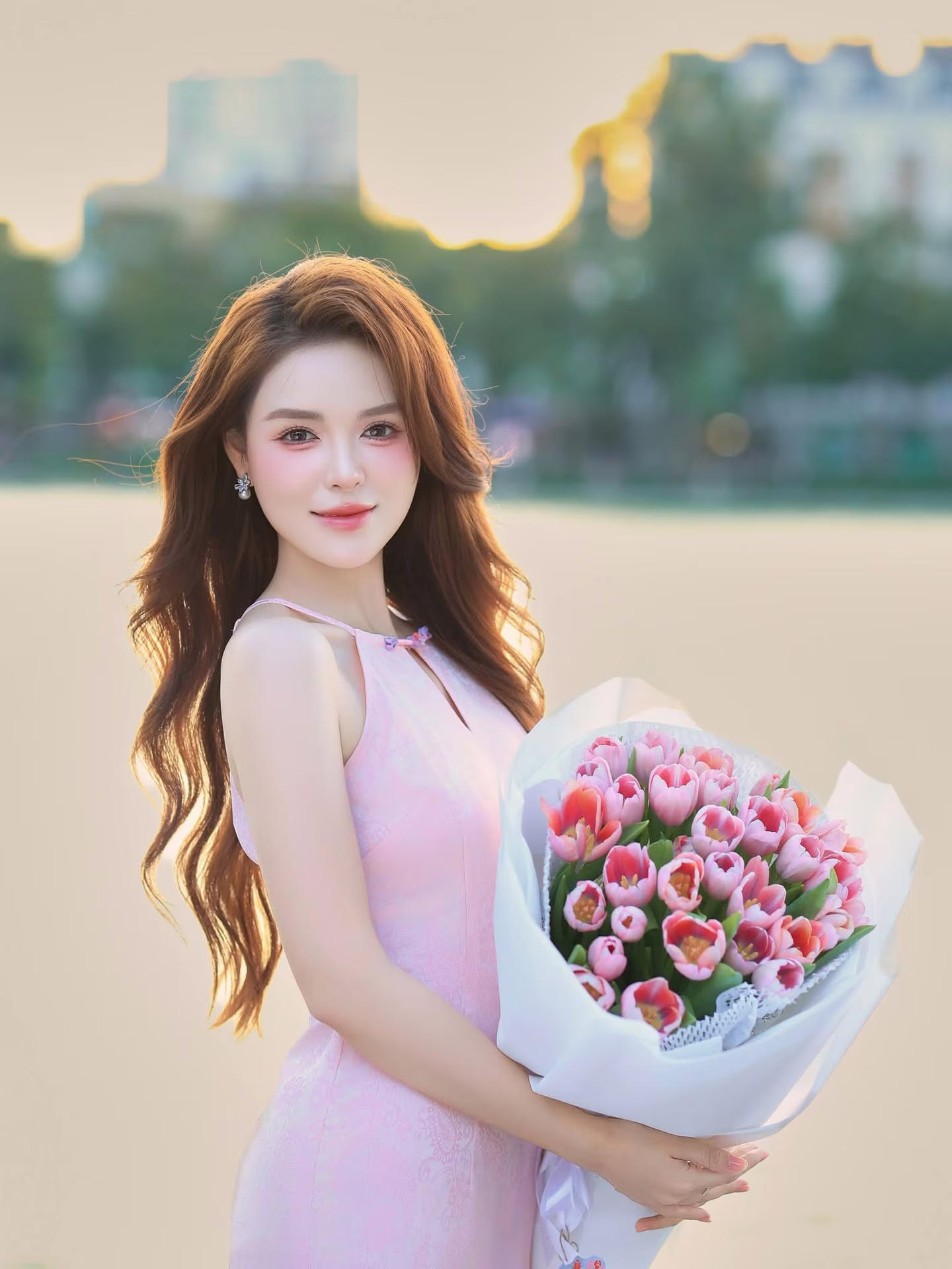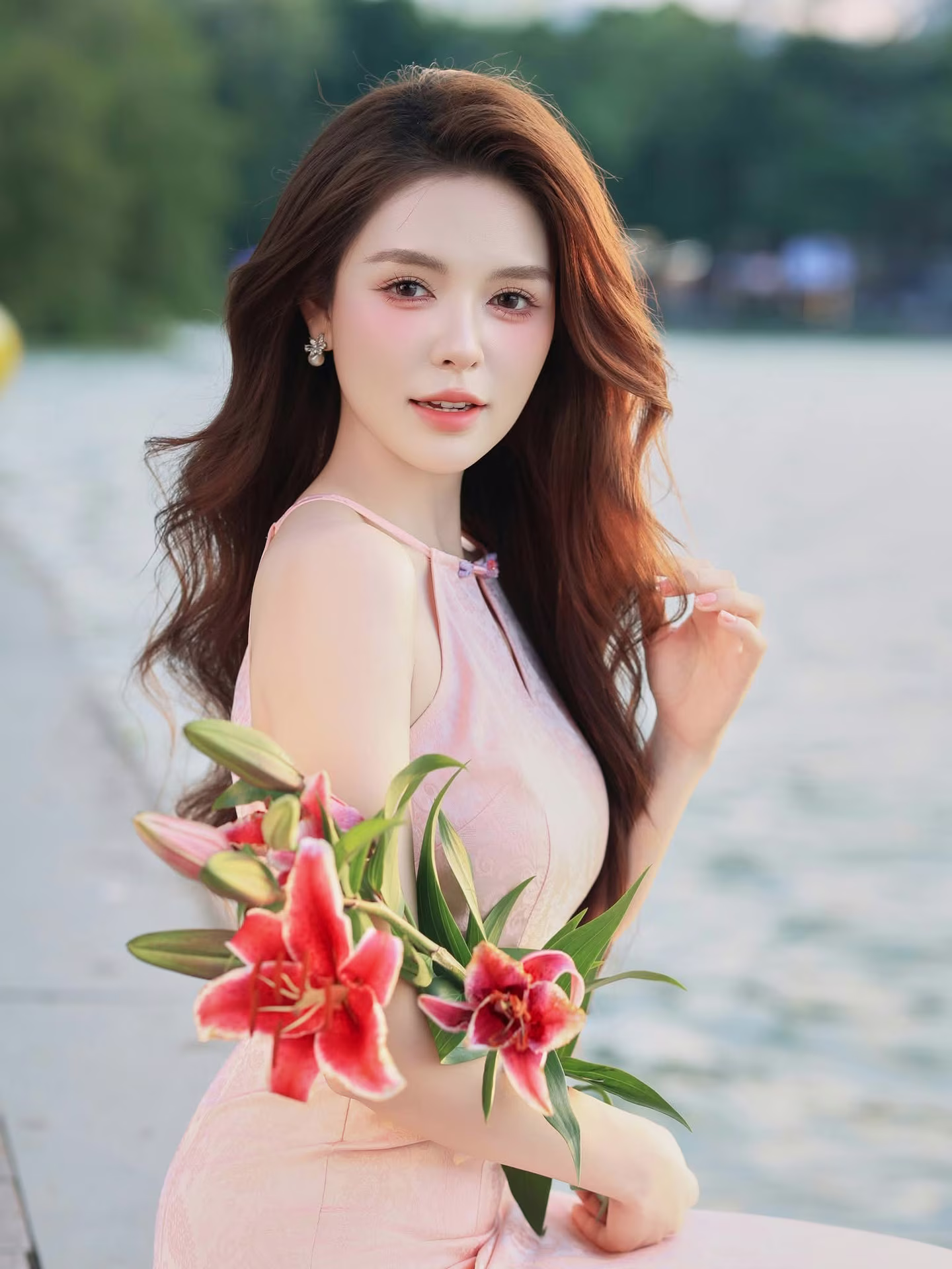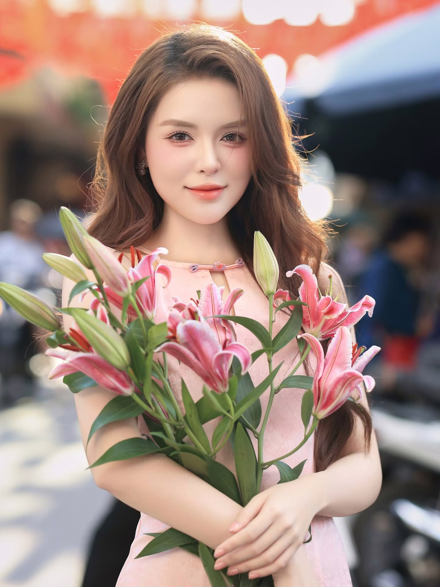 This image captures a young beautiful woman exuding an elegant and captivating charm. She wears a pastel pink halter neck dress gracefully highlighting her slender shoulders and fair skin. Her long naturally wavy hair frames a delicate face complemented by a radiant smile creating a fresh and graceful aura. In her hand she carries a rustic woven bag filled with vibrant pink and white lily flowers bringing a touch of summer fragrance. The overall outfit and accessories reflect a gentle sophisticated style perfectly suited for the bustling street environment. Her soft yet vibrant beauty enchants anyone who gazes upon her. This portrayal embodies the confidence and inherent grace of modern Vietnamese women. #Vietnamese #pretty #charmVGU No.105: Vietnamese Girl in Yellow Áo Dài Shines in Modern City – Captivating Beauty