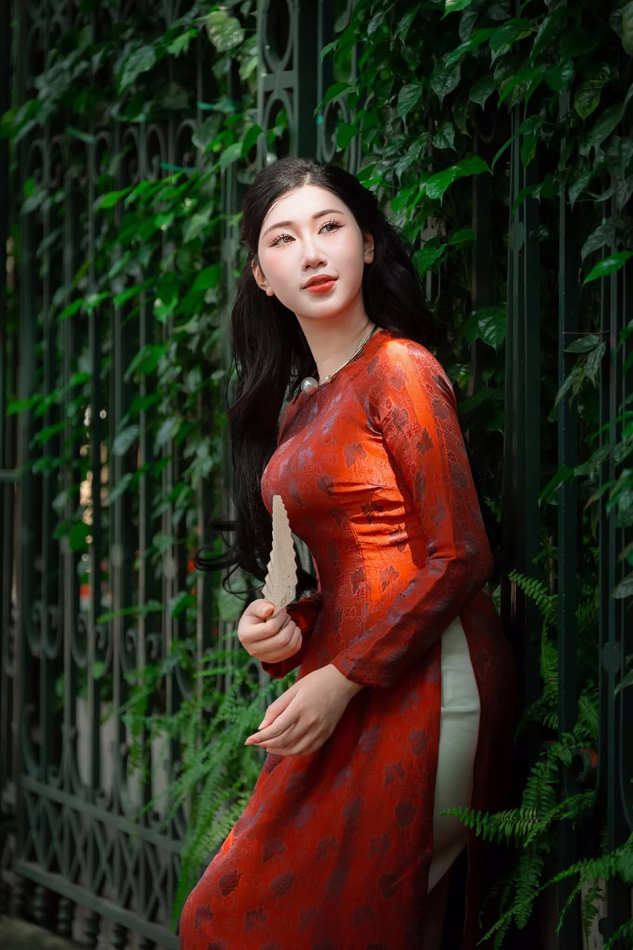 The image VGU No.107 beautifully captures an Asian muse with a delicate, gentle, and utterly captivating charm. The young woman is adorned in an outfit inspired by traditional aesthetics, featuring soft pastel pink layers complemented by a pure white sheer shawl, creating an ensemble that is both graceful and elegant. Her flowing brown hair is subtly embellished with a pristine white flower, while a cherry blossom patterned paper fan held gently in her hand further enhances her classic and romantic allure. Her dreamy gaze, directed softly into the distance, suggests she is lost in poetic thought, evoking a sense of peace and enchantment. Her pure and ethereal beauty seems to blend seamlessly with the lush green backdrop, forging an artistic moment rich in emotion and captivating appeal, leaving viewers utterly mesmerized. #Vietnamese #pretty #charmVGU No.106: Elegant Vietnamese Woman in Red by Hoan Kiem Lake, Hanoi's Traditional Beauty