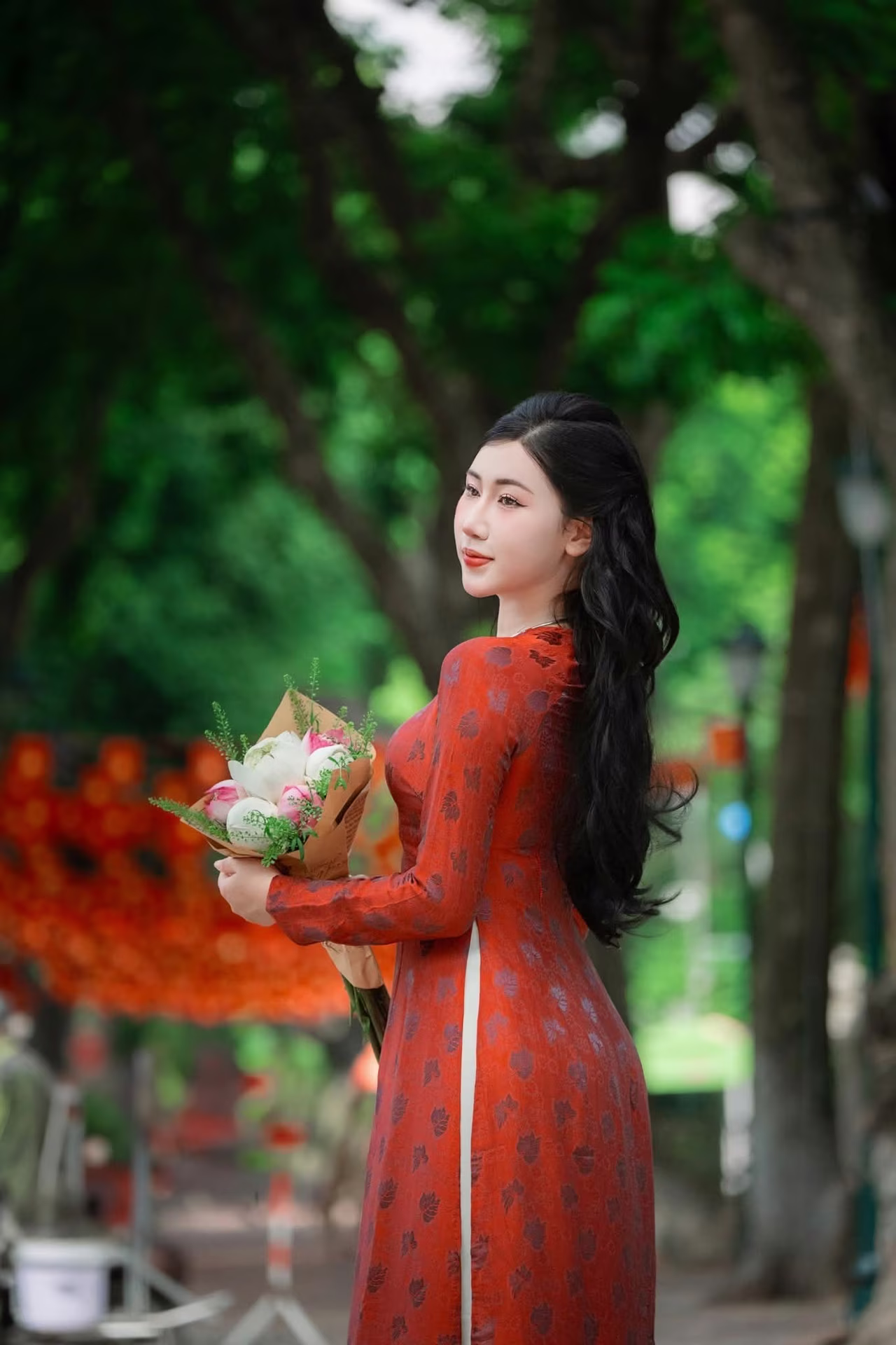 The VGU No109 photograph beautifully captures the youthful and graceful charm of a Vietnamese woman in her traditional Ao Dai. Dressed in an exquisite red Ao Dai adorned with subtle patterns she exudes elegance and confidence. She stands out against a backdrop of vibrant multicolored fresh flowers ranging from serene lotuses to bright sunflowers creating a lively and energetic scene. The delicate bouquet of pink and white lotuses in her hand further enhances her gentle and refined East Asian beauty. Faint Vietnamese flags in the upper background subtly evoke a sense of national pride and enduring cultural values. This image is not merely a photograph but a harmonious blend of human grace and natural splendor celebrating timeless Vietnamese beauty. #Vietnamese #pretty #charmVGU No.108: Pristine White Ao Dai Elegance A Graceful Vietnamese Woman in Traditional Setting