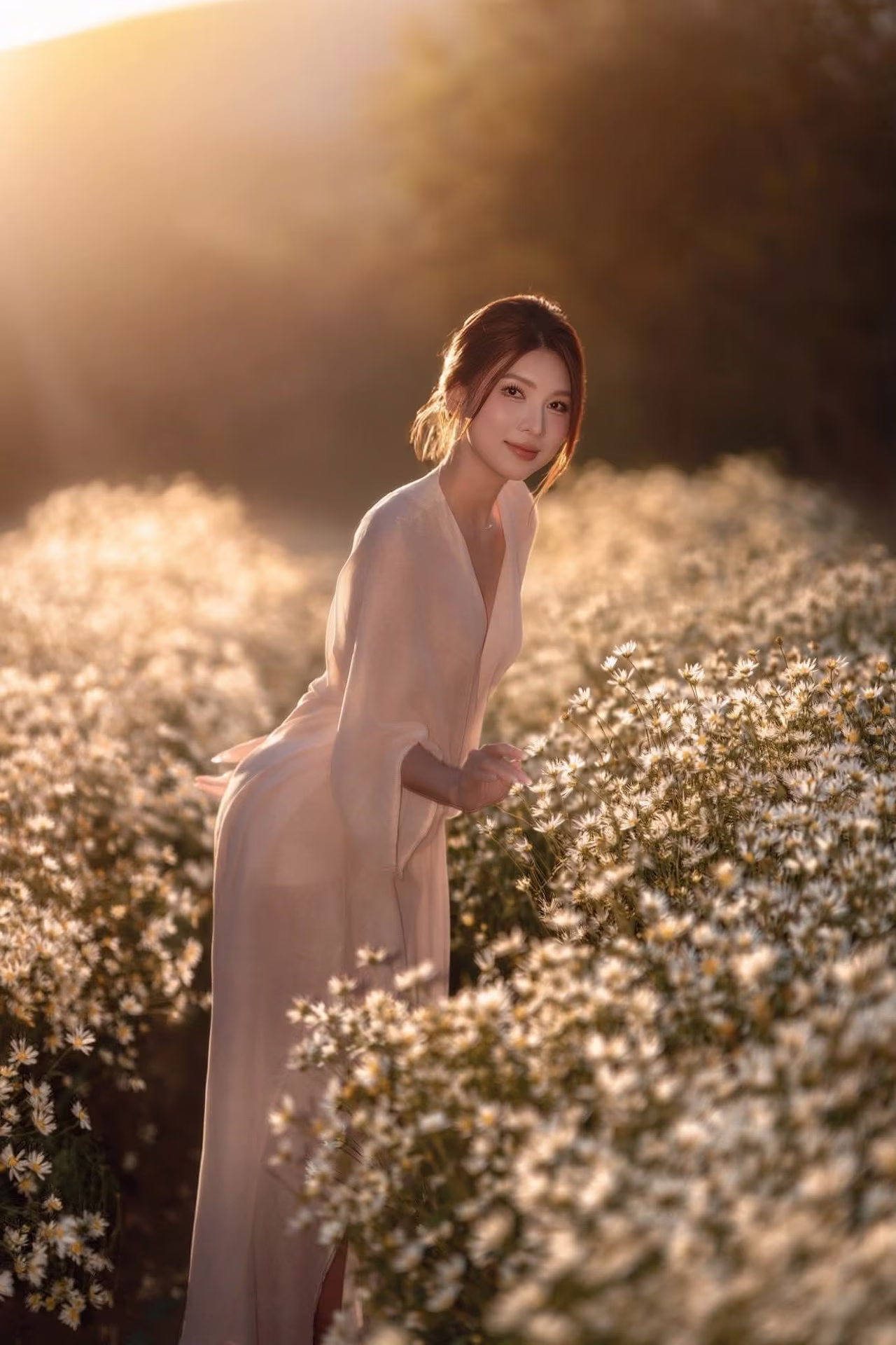 This VGU No118 image captures a girl with a poetic beauty standing amidst a field of white flowers Golden hour sunlight envelops the scene creating an ethereal and romantic atmosphere The girl turns her back but her gaze subtly glances over her shoulder adding mystery and allure Her light attire accentuates her graceful charm blending seamlessly with the serene nature This is a moment of tranquility where human beauty and landscape perfectly merge bringing an indescribable sense of peace and dreaminess This enchanting and poetic scenery will surely captivate hearts evoking beautiful dreams #Vietnamese #pretty #charmVGU No.117: Graceful Vietnamese Ao Dai at Ho Chi Minh Mausoleum – Hanoi's Proud Charm