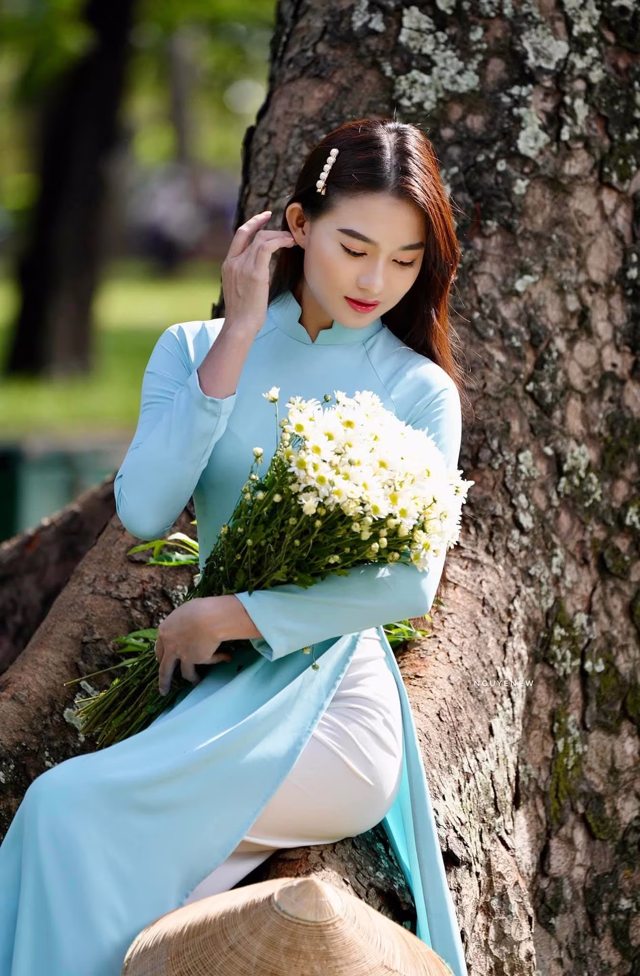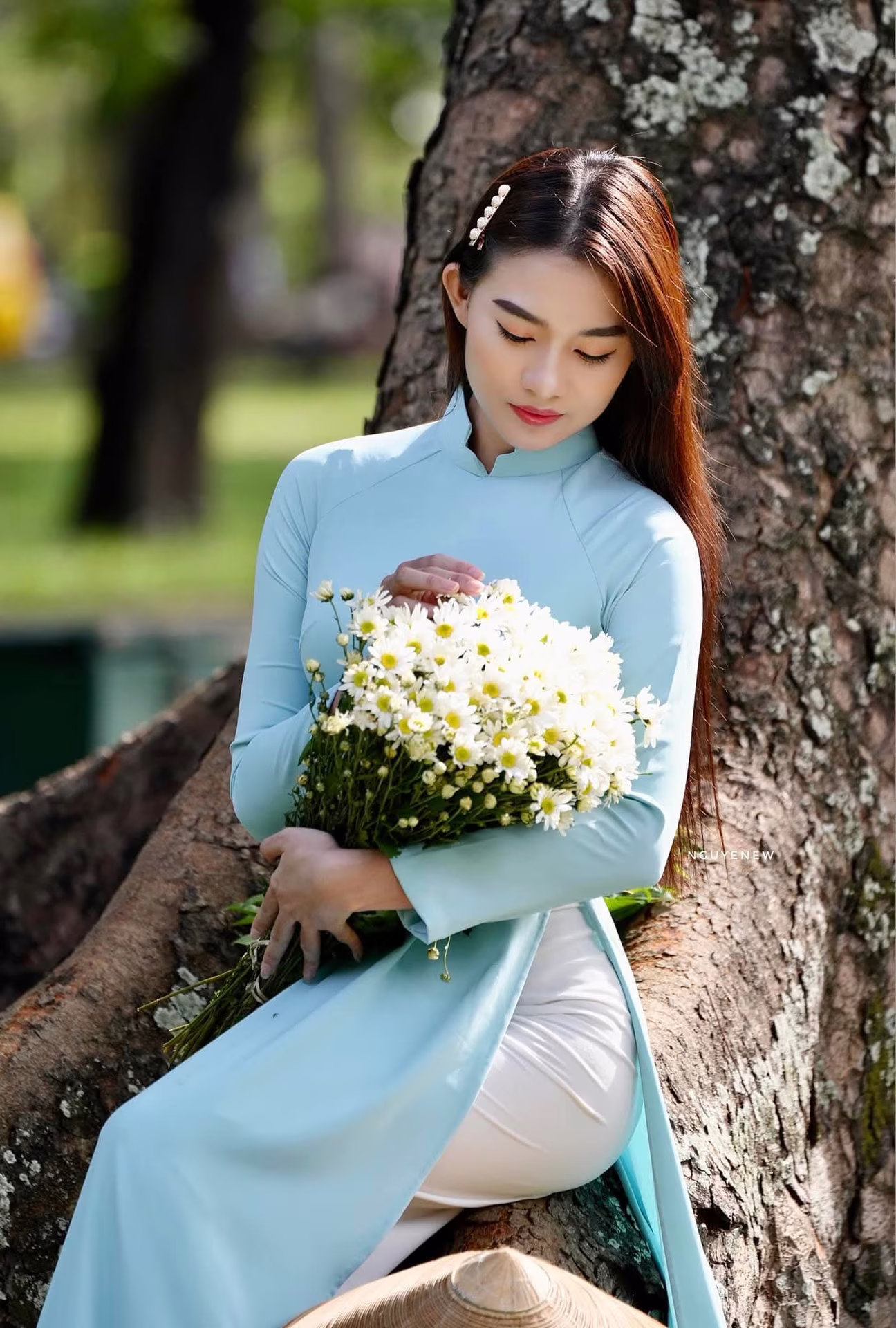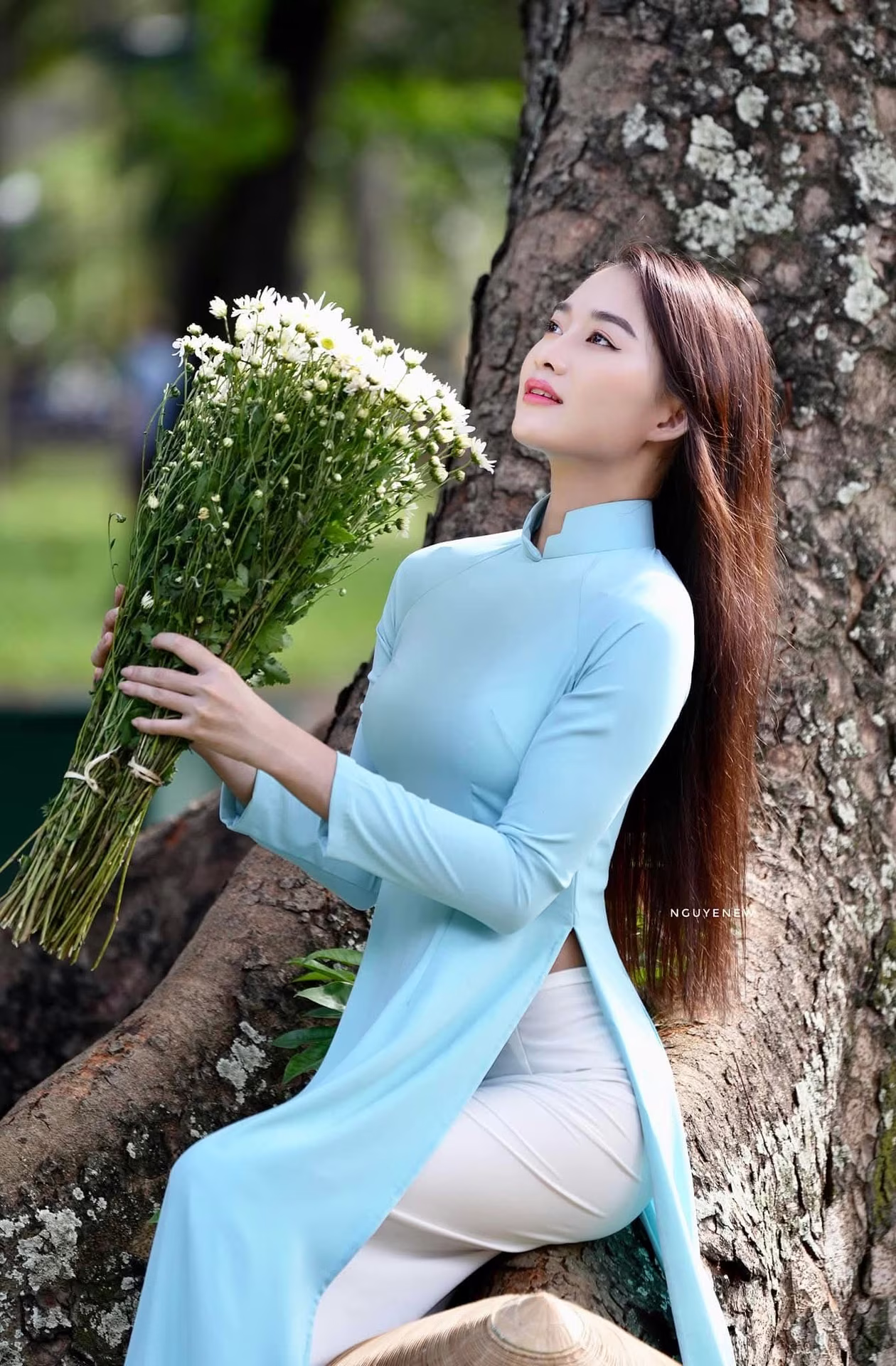 The VGU No.119 image beautifully captures the gentle and elegant charm of a Vietnamese woman adorned in a flowing pink Ao Dai. She sits gracefully on a wooden bench, surrounded by the lush greenery of a park, her long dark hair cascading naturally, complemented by a delicate white flower. The soft, refined pink Ao Dai subtly enhances her figure, creating a poetic and romantic visual. Holding a small bouquet of white flowers, she exudes a sense of peace and purity. This photograph is more than just a stunning image; it is a vibrant symbol of traditional Vietnamese beauty, perfectly harmonized with the fresh vitality of nature, evoking feelings of tranquility and grace. #Vietnamese #pretty #charmVGU No.118 Dreamy Girl in a Poetic Flower Field Bathed in Golden Hour Light