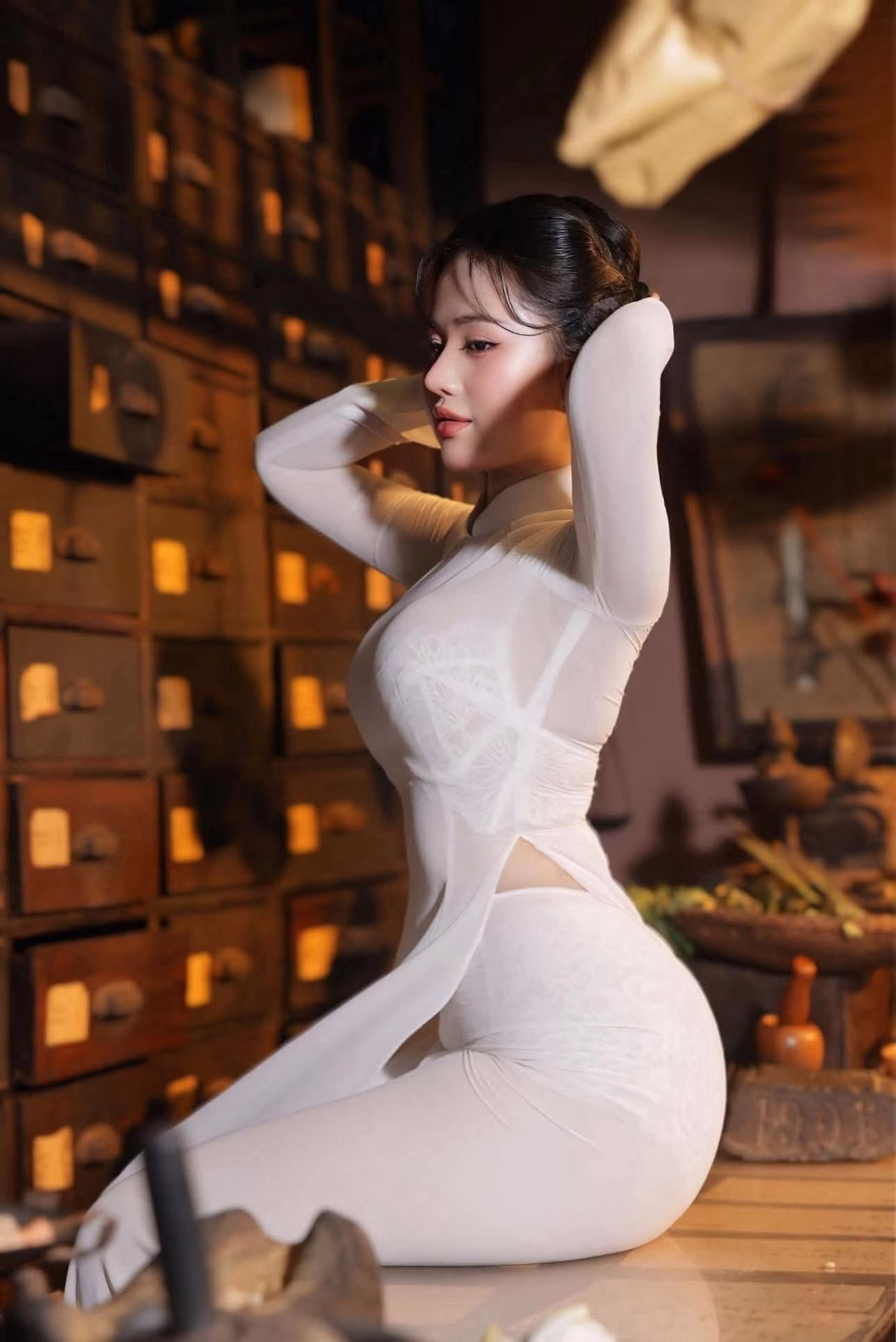 VGU No108 captures the gentle beauty of a Vietnamese woman in a pristine white Ao Dai The young lady with long dark hair exudes elegance and grace as she poses by an ancient wooden railing Her soft smile and dreamy gaze create a moment filled with emotion and poetic charm The form-fitting Ao Dai accentuates her delicate and alluring figure perfectly complemented by white high heels creating a harmonious and sophisticated ensemble The traditional architectural background further highlights Vietnams enduring and refined cultural beauty This image is not merely a portrait but a symbol of pure Asian aesthetics bringing a sense of peace and nostalgia to viewers It is an artistic masterpiece celebrating traditional values and the timeless allure of the Vietnamese Ao Dai #Vietnamese #pretty #charmVGU No.107: Captivating Asian Beauty in Elegant Traditional Attire, A Dreamy Muse
