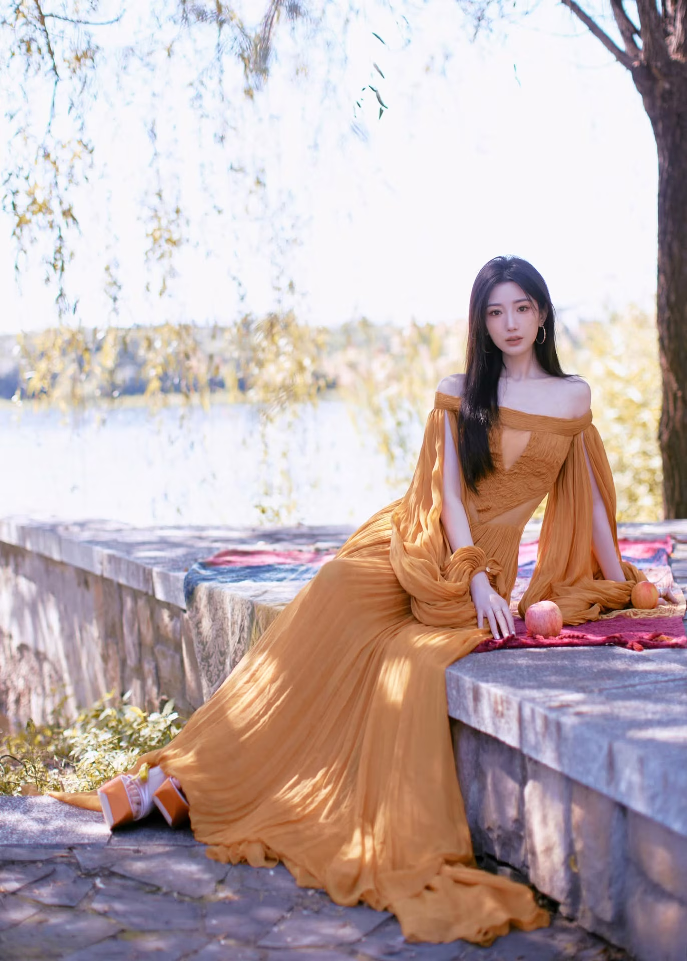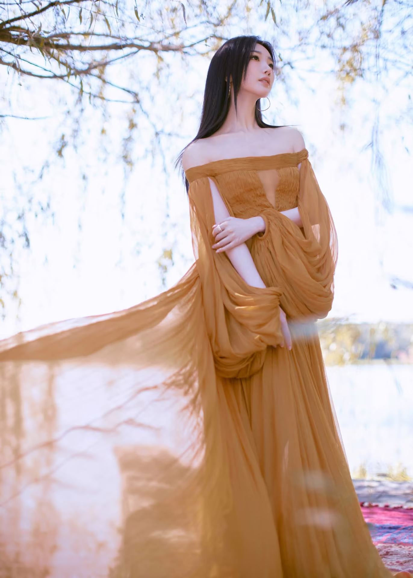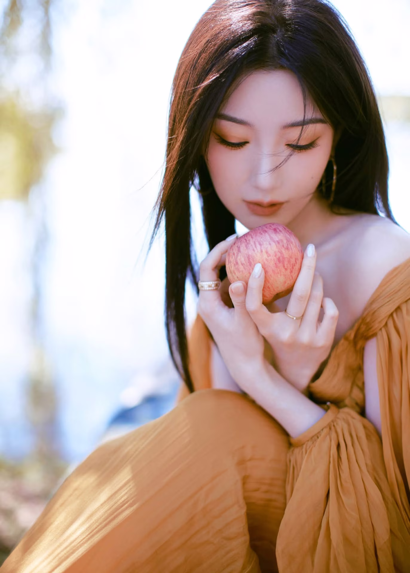 The image VGU No.122 captures a poetic beauty bathed in radiant golden sunlight by a tranquil lake. The girl reclines gently in a shimmering golden dress revealing alluring bare shoulders and long dark hair flowing naturally. Soft sunlight caresses her delicate face and hair creating a luminous ethereal glow. This moment exudes absolute peace and serenity like a muse lost in a dream amidst beautiful nature. The red apple beside her suggests purity and vitality. This is a vivid portrayal of natural beauty and the harmony between humanity and the earth. #Vietnamese #pretty #charmVGU No.121: Graceful Vietnamese Lady in Ao Dai with Vibrant Flower Bicycle