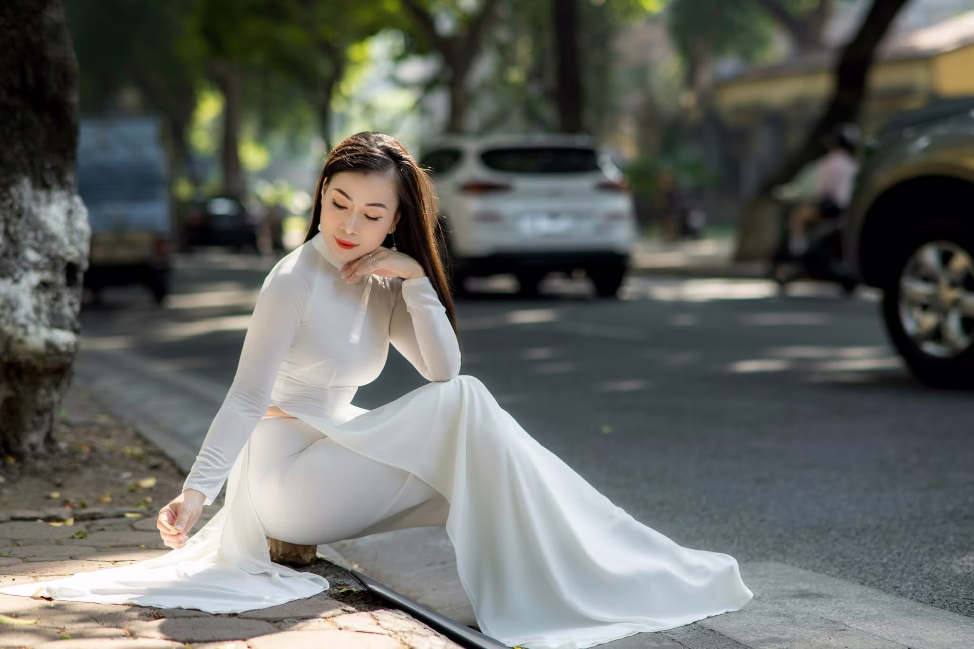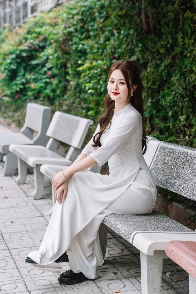 This photo captures a gentle moment of a Vietnamese girl in a pristine white ao dai. She sits gracefully on a stone bench, her long hair flowing down, and a charming smile, exuding elegant beauty and tranquility. The ao dai is not just an outfit but also a cultural symbol, honoring the grace and gentleness of Vietnamese women. The lush green background enhances the pure beauty and serene demeanor of the girl. This is an emotional image, evoking admiration for traditional beauty and radiant youth. This moment is like an invitation to admire the simple yet captivating charm of the ao dai in everyday life. #Vietnamese #pretty #charmVGU No.104: The Gentle Charm of Áo Yếm Nón Lá – Timeless Vietnamese Beauty